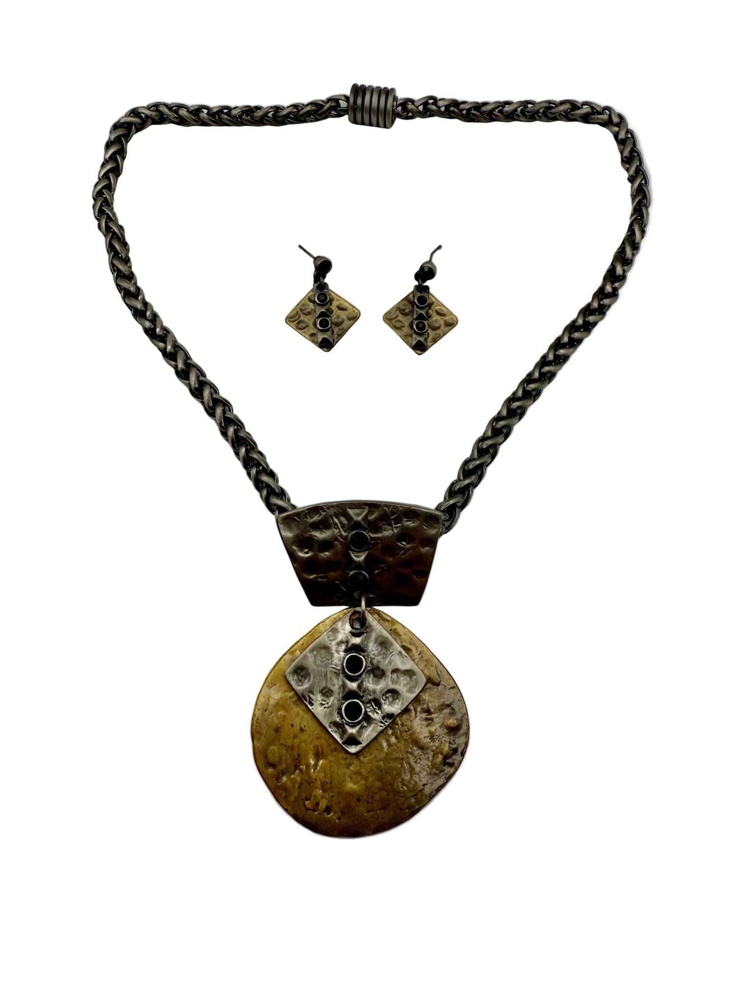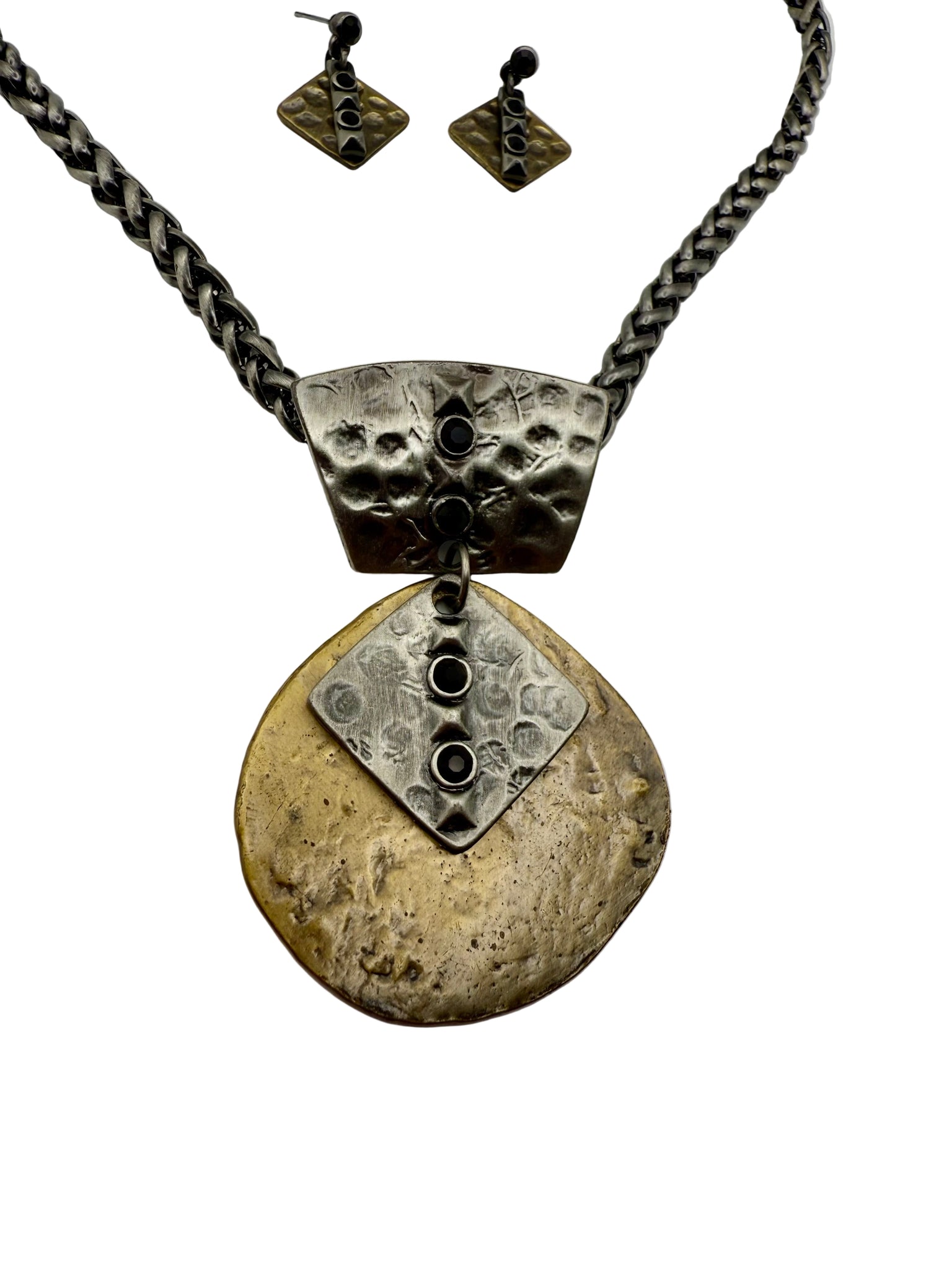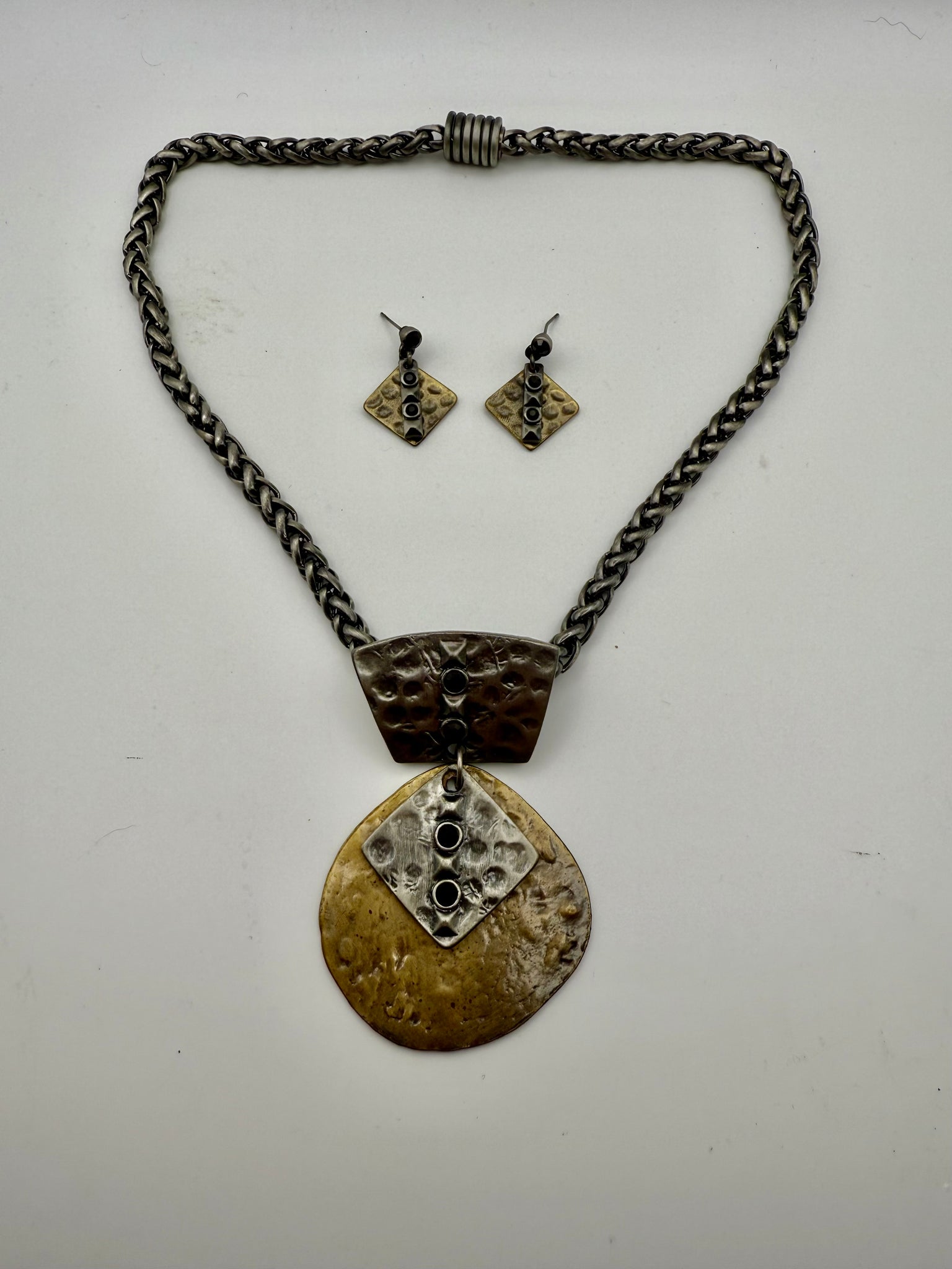 This is a mixed-metal hammered pendant necklace and matching earrings Set