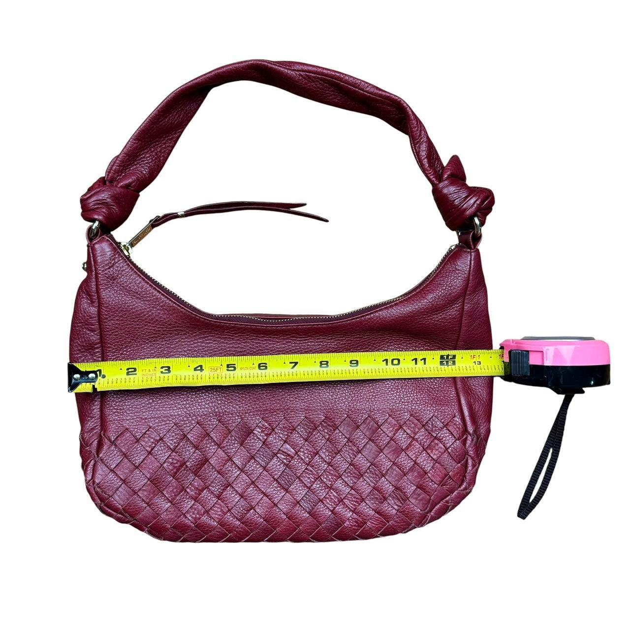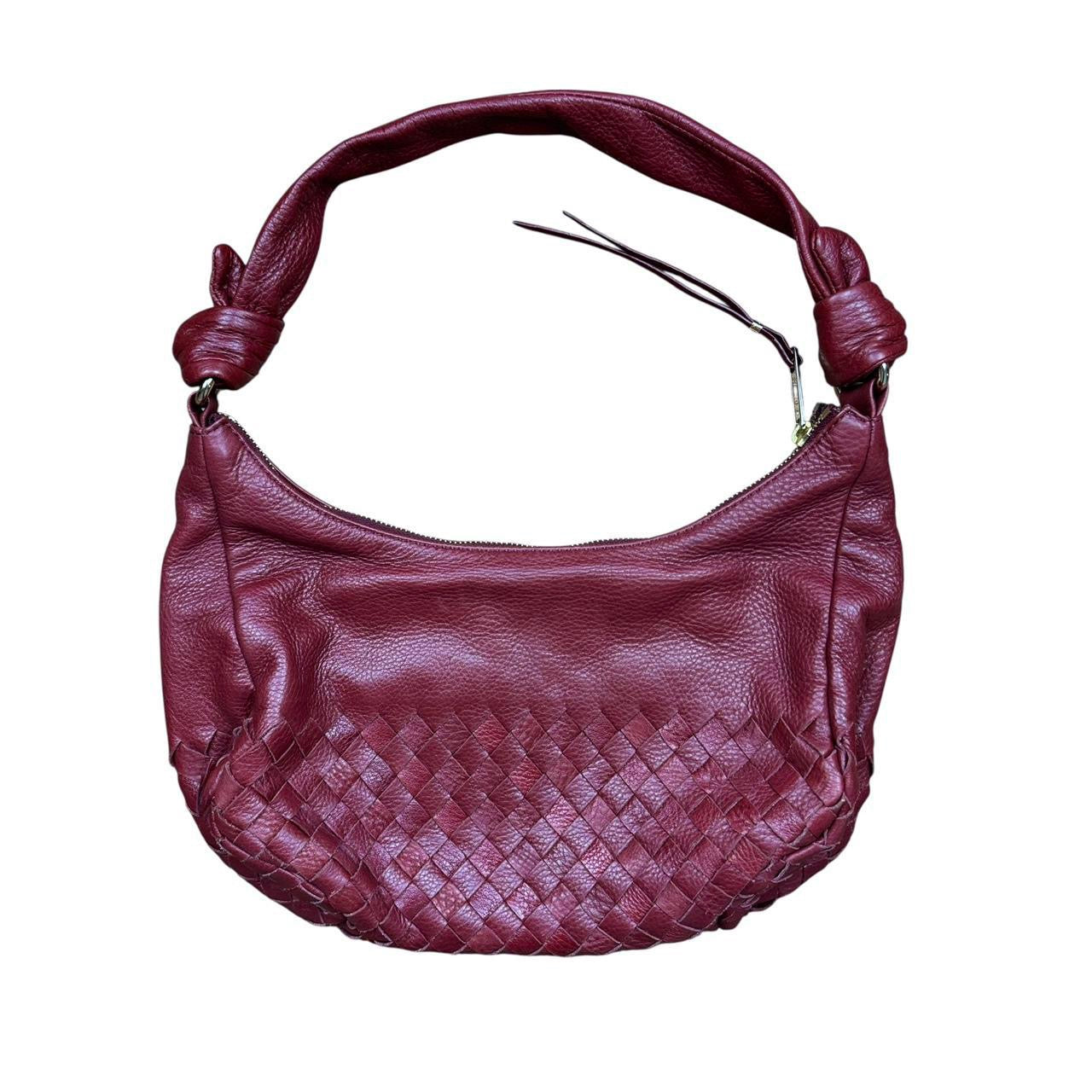 Chic wine red genuine leather handbag with woven detailing & gold hardware. By Elliott Lucca. Excellent pre-loved condition.