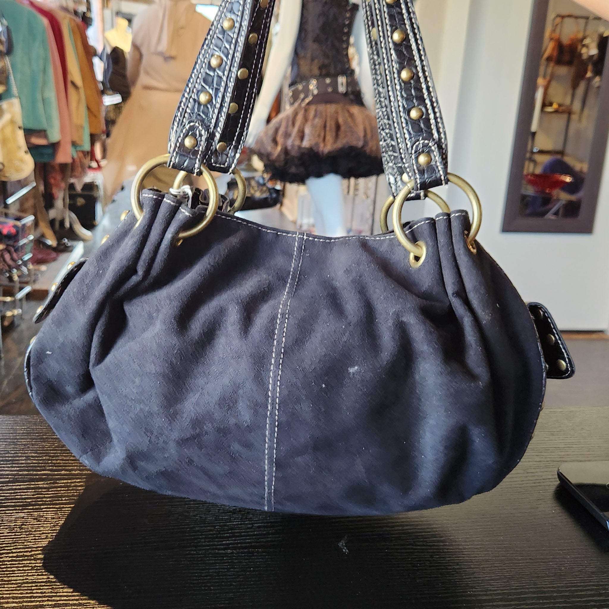 Gorgeous black and leather gold studded bag with detailed straps and side pockets.