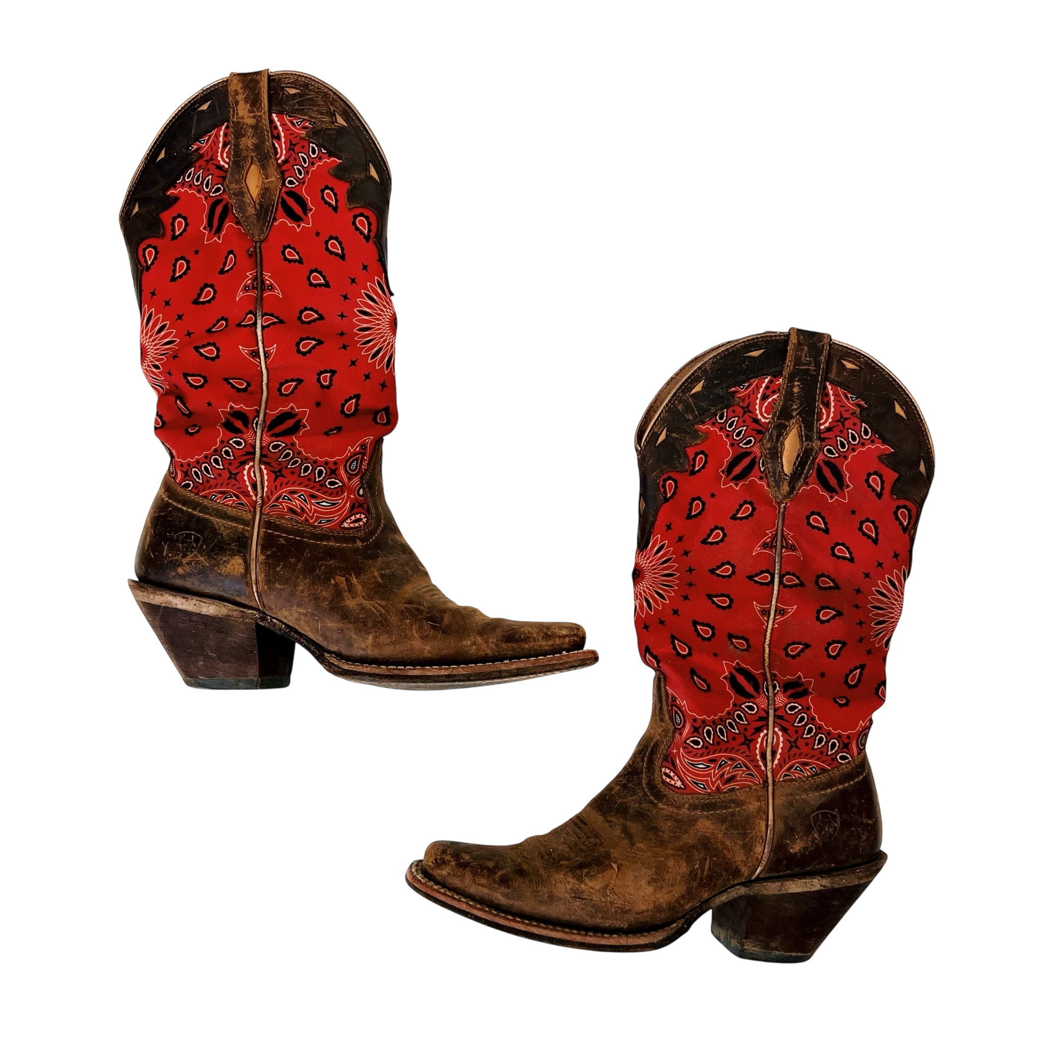 Distressed leather cowboy boots with red paisley bandana print!