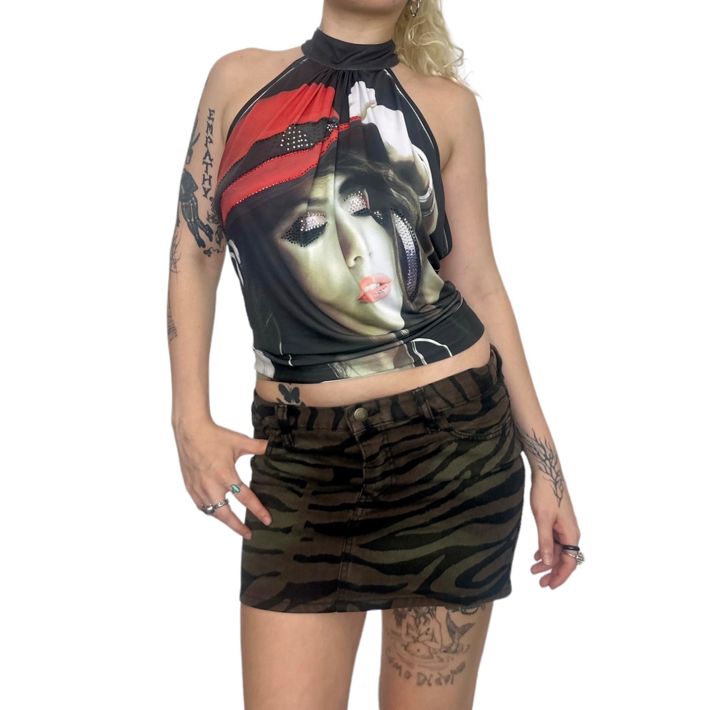 Chloë is 5’4” and wears a size Small. Her measurements: Waist (High 25”, Mid 31”, Low 34”), Hips 36", Bust 35".