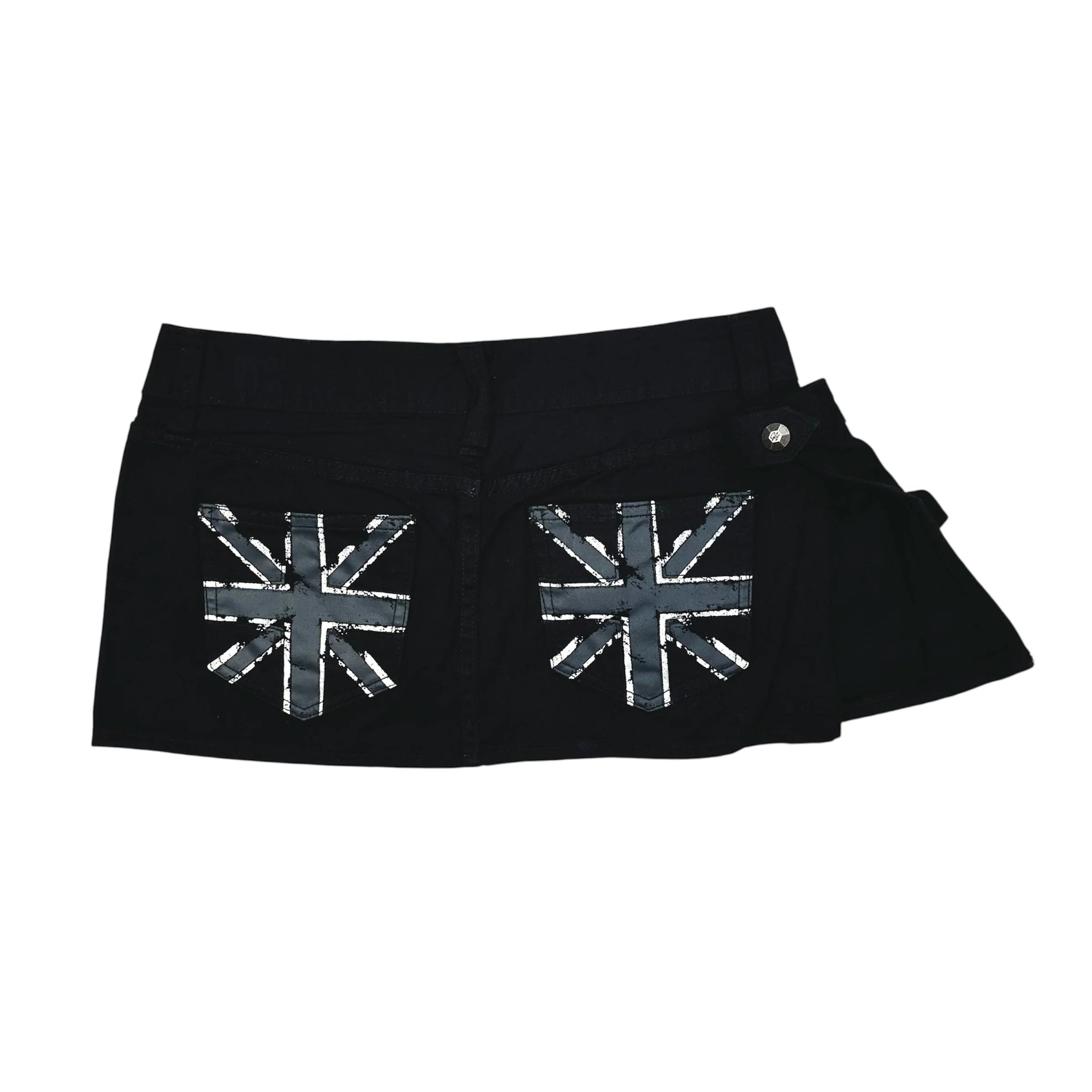 Black denim utility skirt with pocket strap wrapped around and Union Jack printed on the back