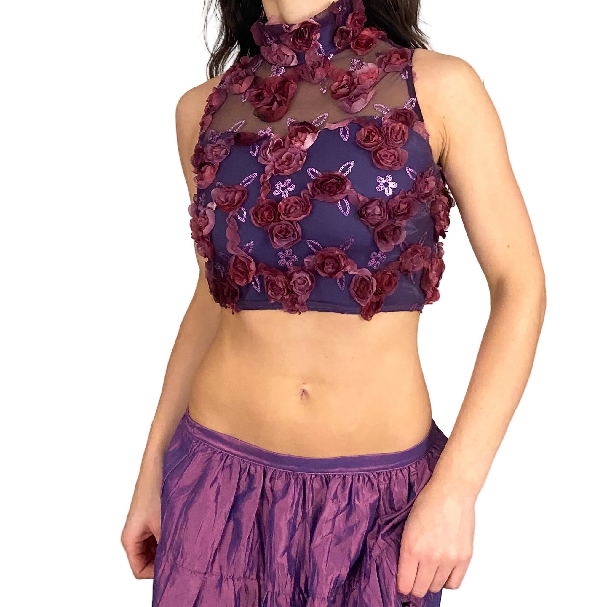 weissman purple and pink dance crop top with 3d rose flower appliques and embellished with sequins