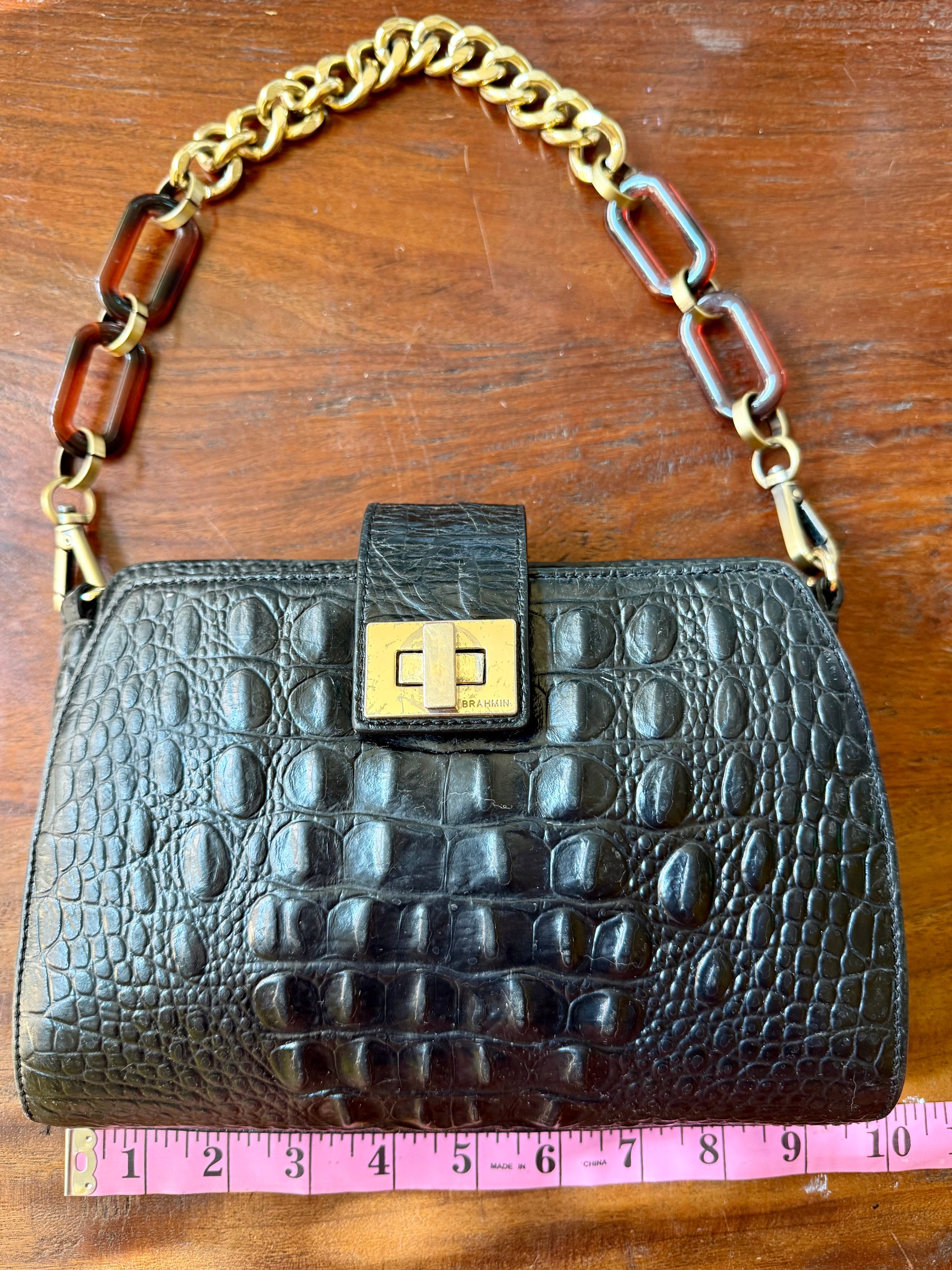 Gold-tone hardware with heavy patina and visible wear, creating an authentic vintage, distressed look.