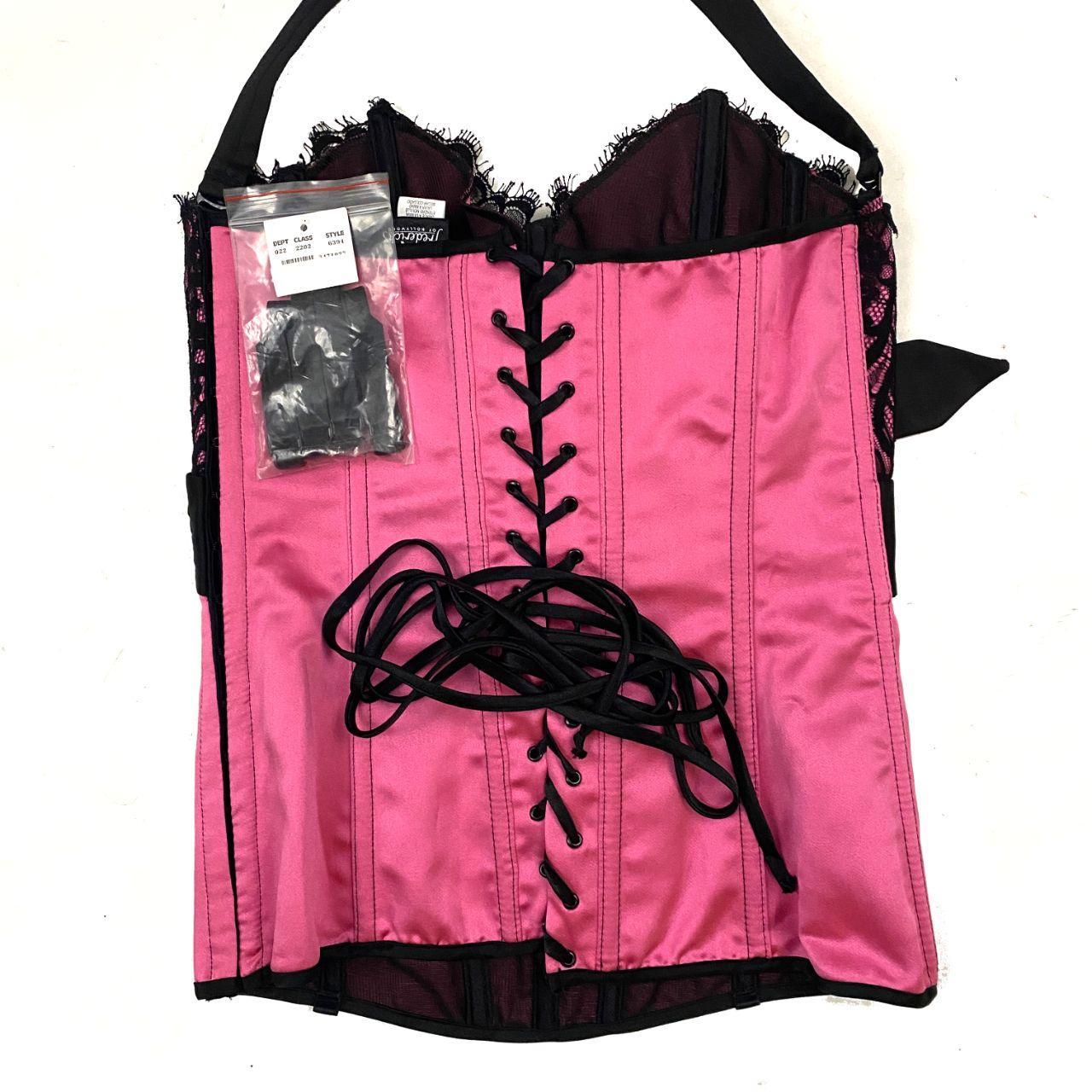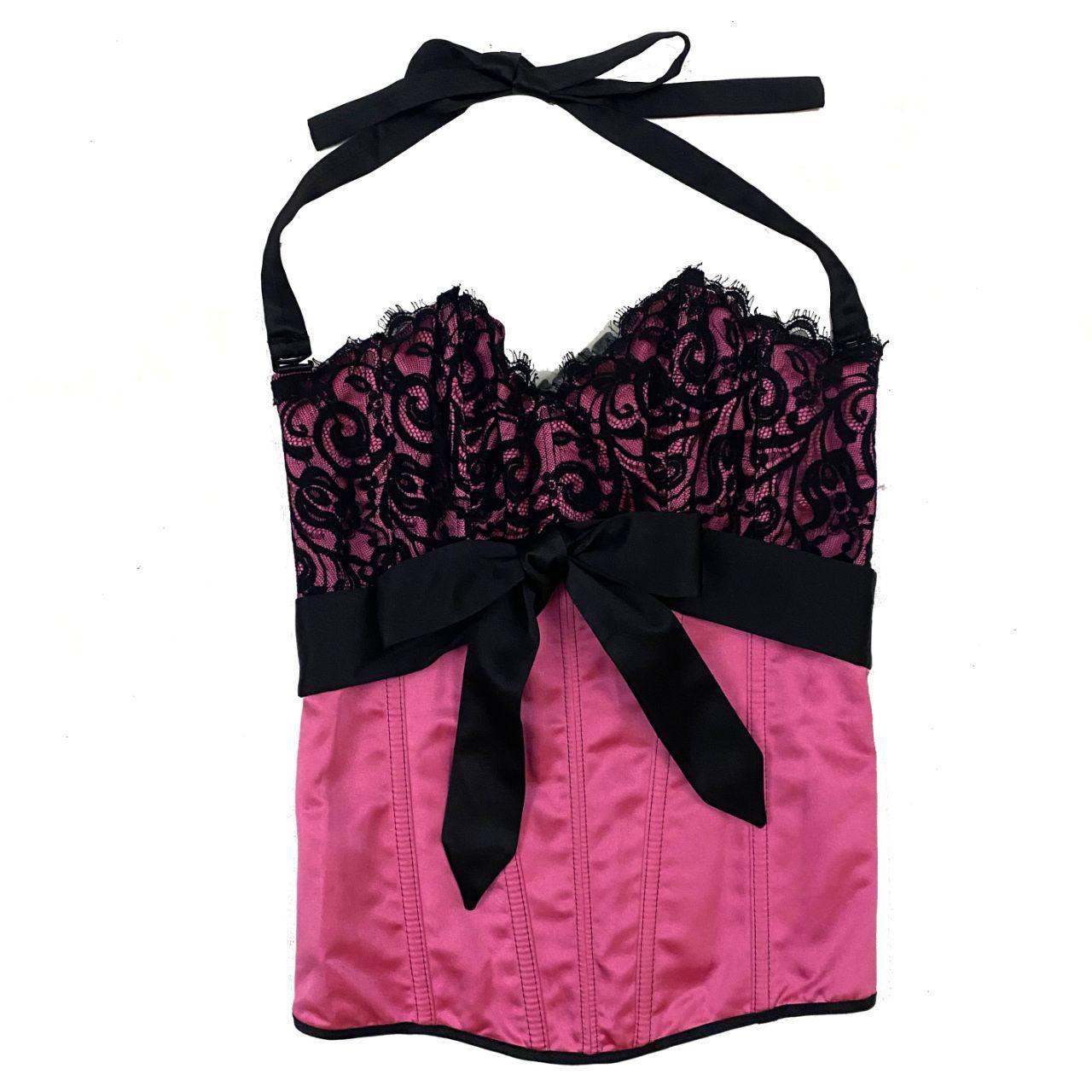 2000s fredericks of hollywood pink and black lace corset brand new with tags and garters. back lace up and side hook and eye. has boning.