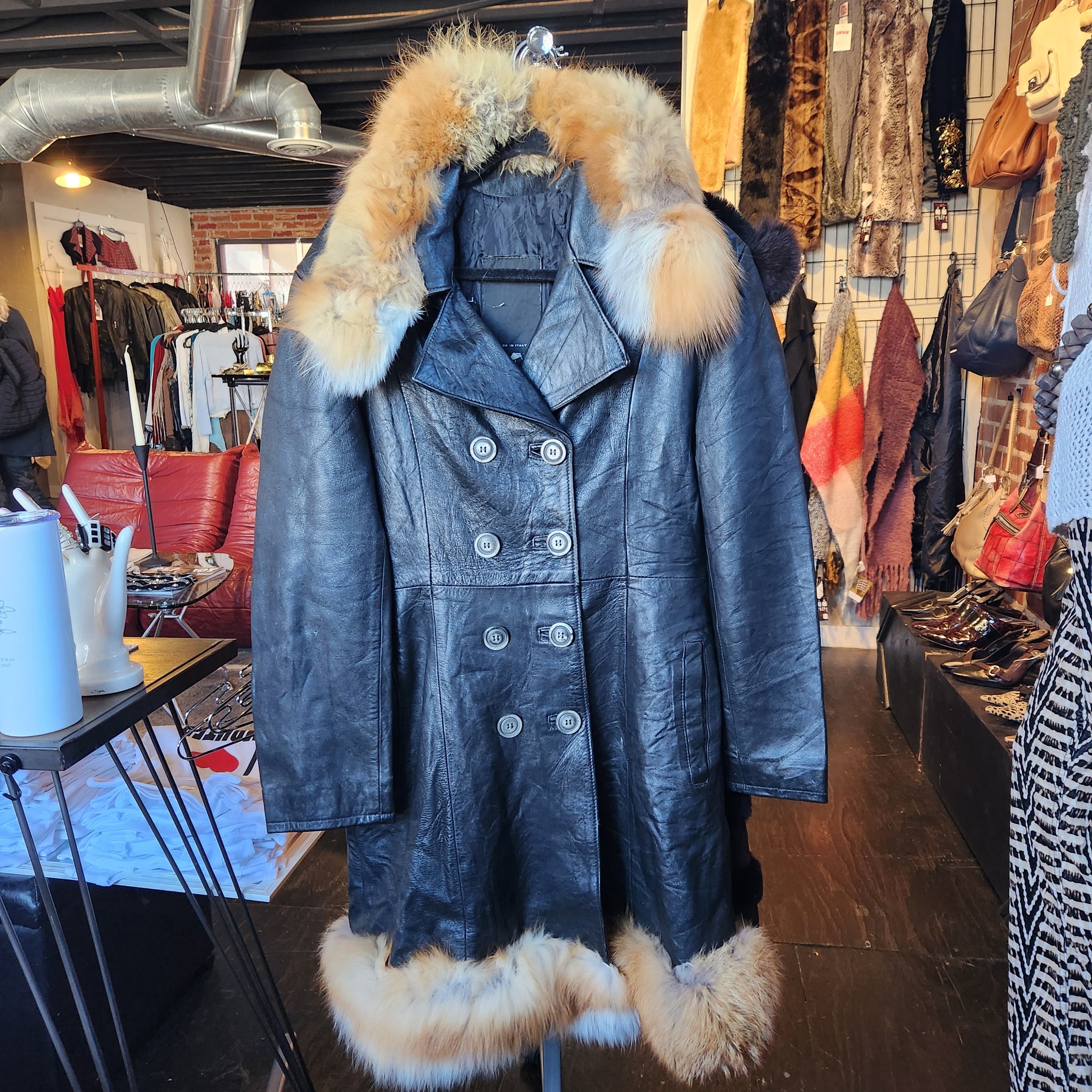 Black italian leather with blonde fur around the collar and bottom. A full length jacket that will keep you warm and stylish at the same time.