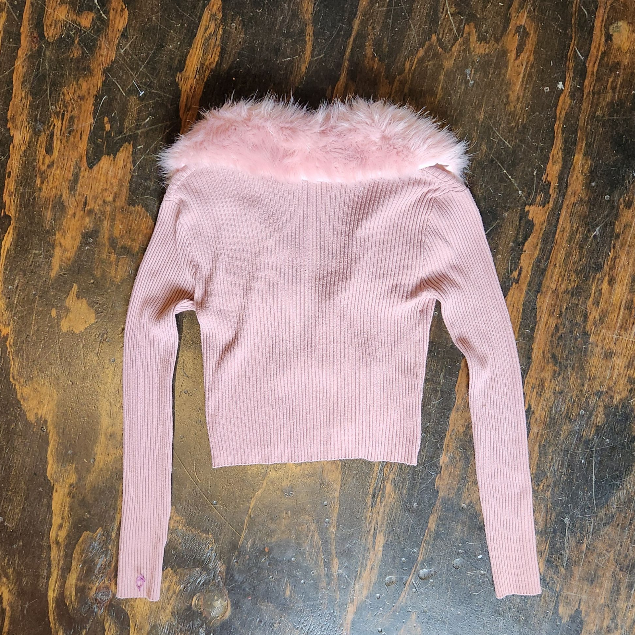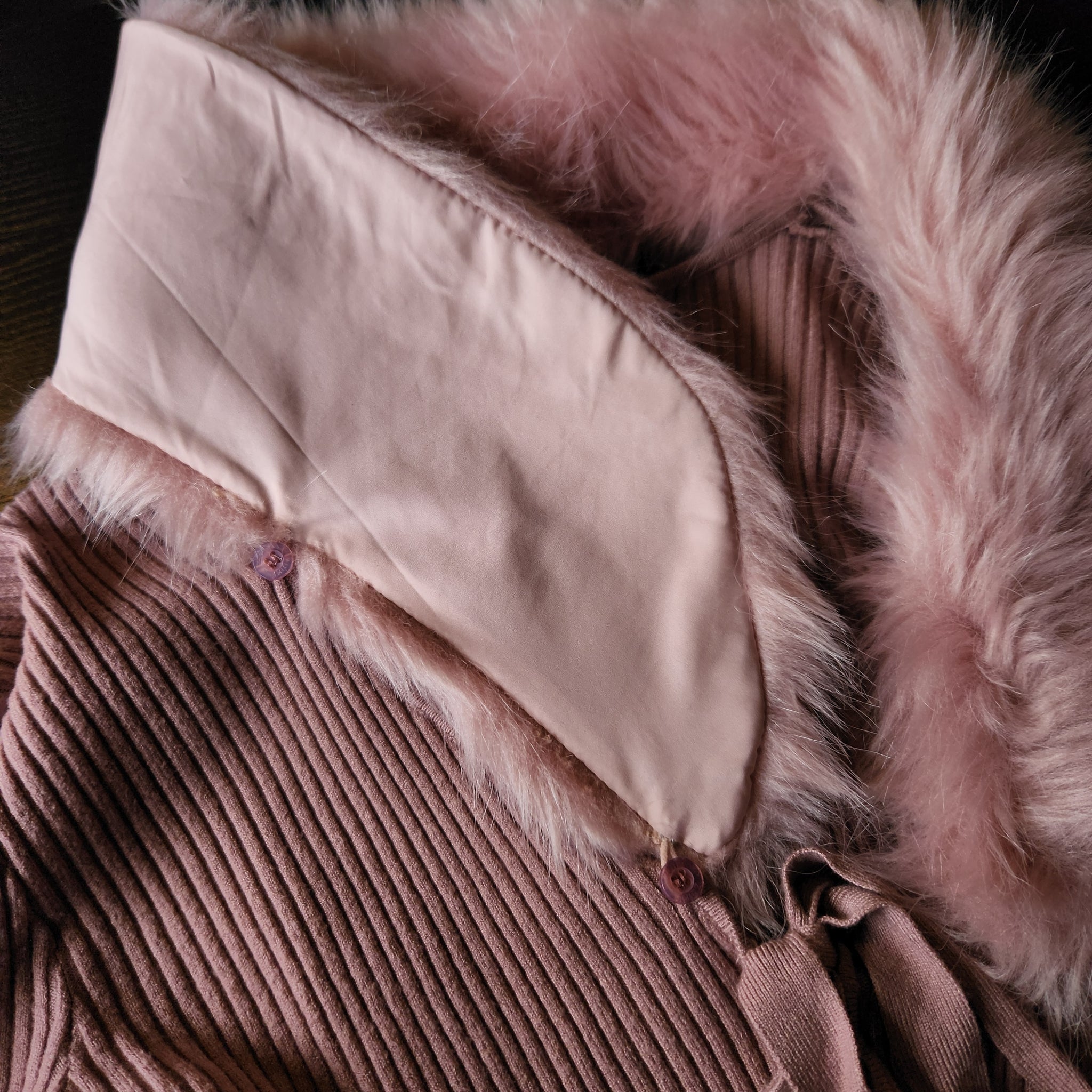 Pink knit sweater with detachable fuzzy collar that ties together in front.
