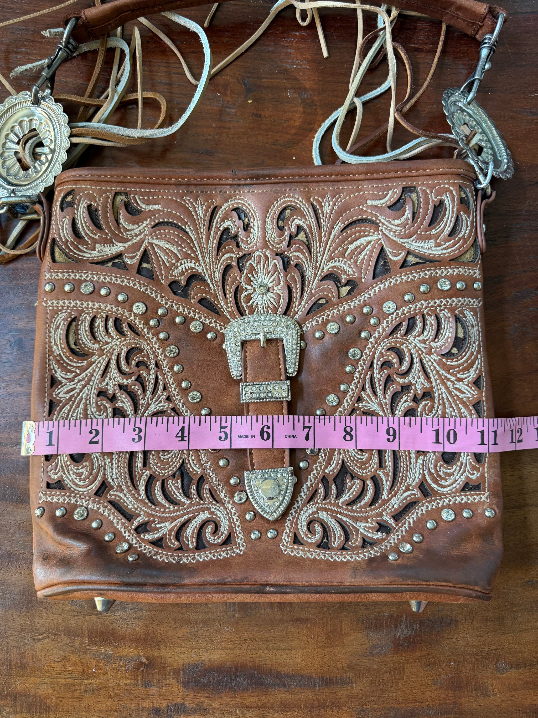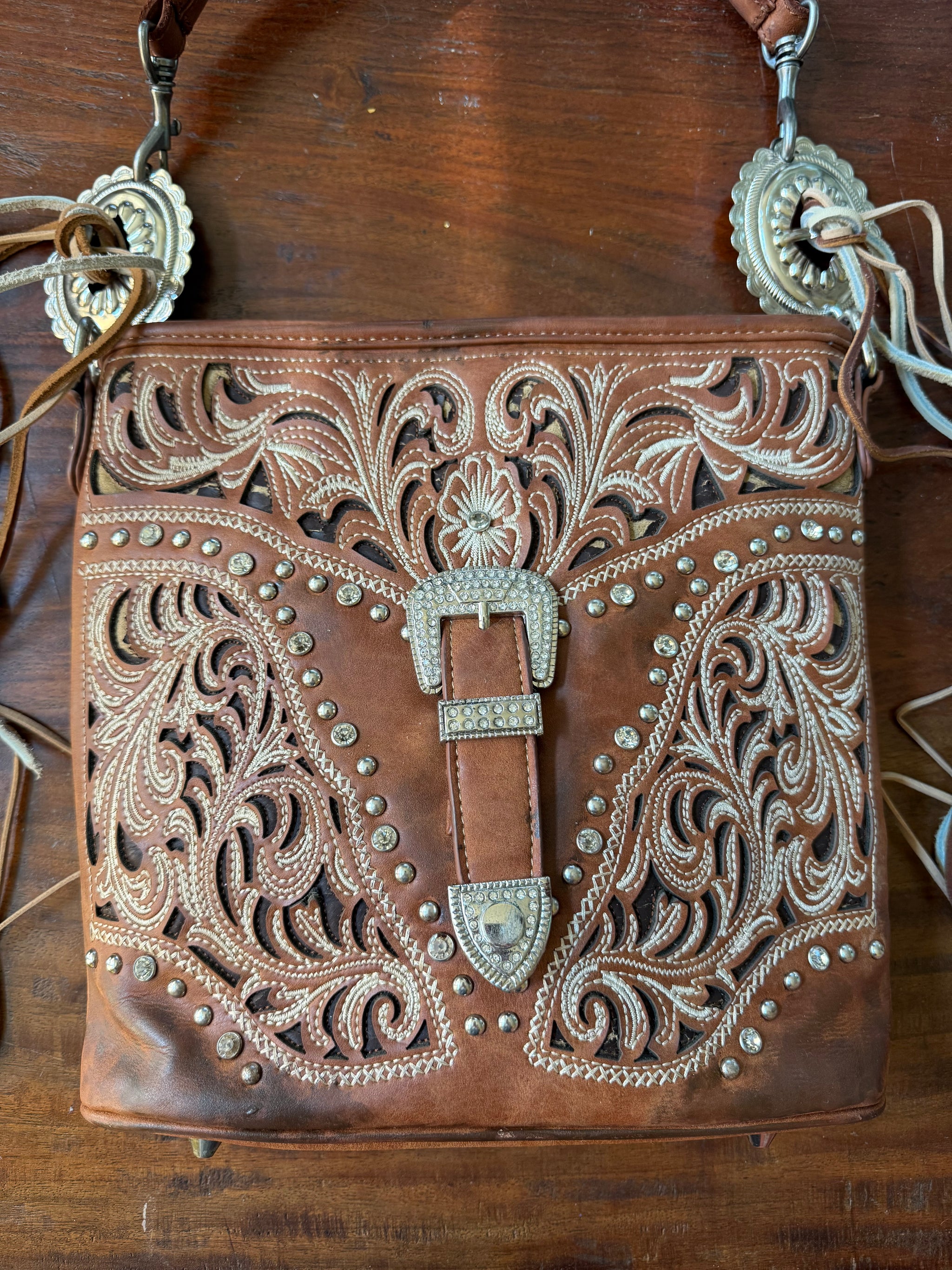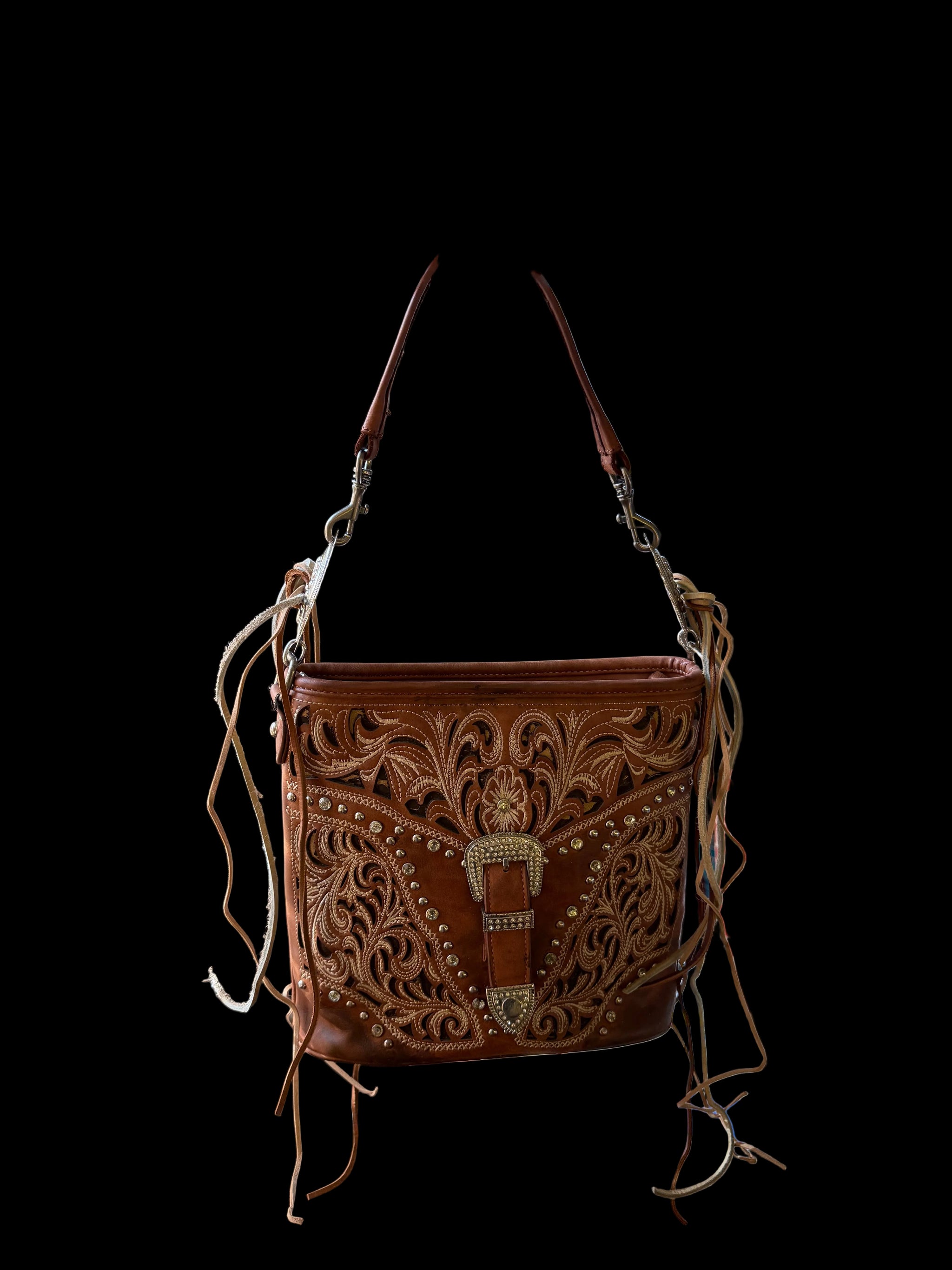 This is a reworked Western-style, hand-tooled leather handbag with intricate cut-out floral designs, rhinestone accents, and concho hardware.