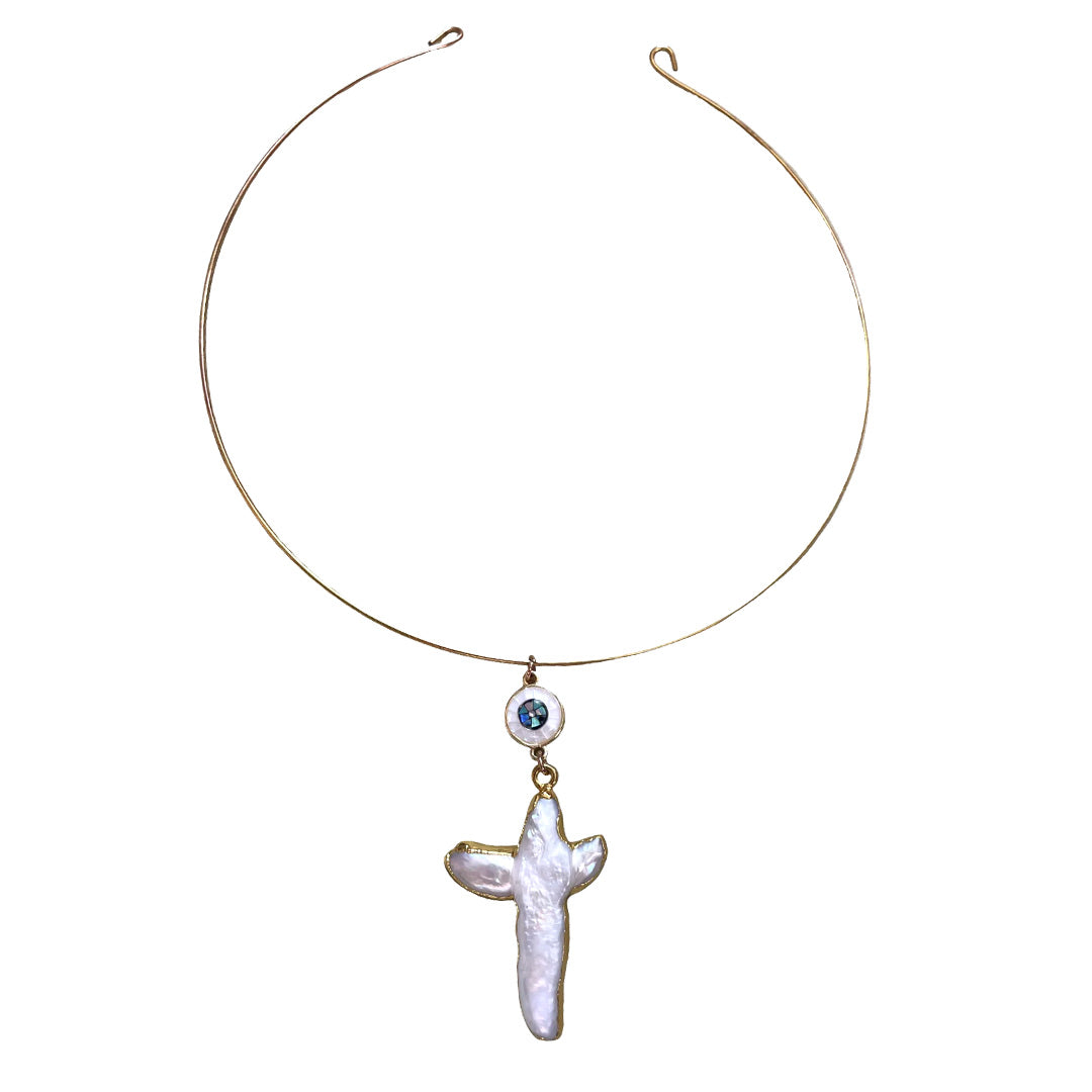The Divine Pearl Necklace is one of the most breathtaking necklaces I have ever worn. It is composed of a natural pearl shaped cross framed in gold which sits below a pearl and abalone mosaic inlay.