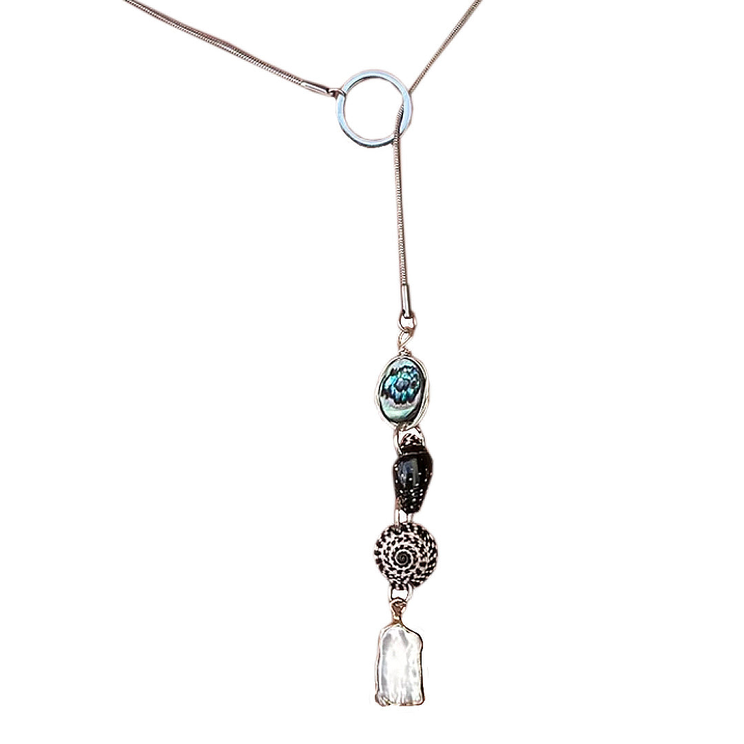 The Lunar Tides Necklace is truly the most breath taking one of a kind necklace. The sleek silver loop anchors cascading charms reminiscent of the beautiful sea— an iridescent abalone oval, a natural cone shell, a areola shell and tied together by a pearl charm. This necklace is the perfect transition from day to night.