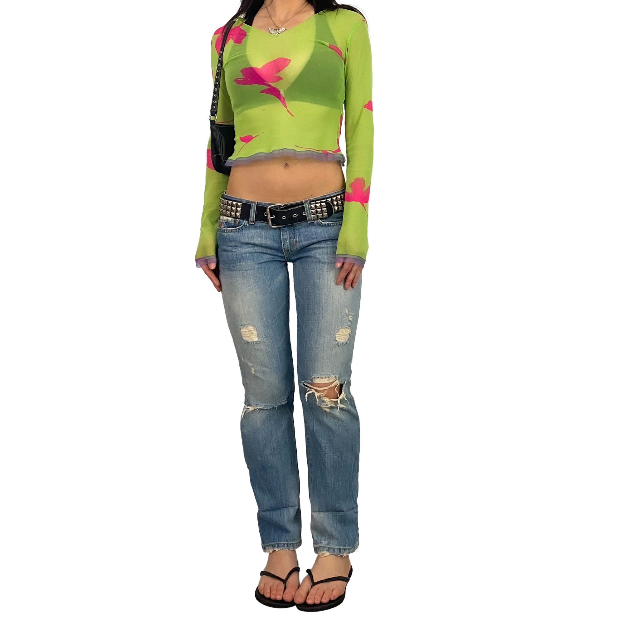 2000s low rise denim capris by abercrombie & fitch. distressing down the front. wear them cuffed up or full-length crop.