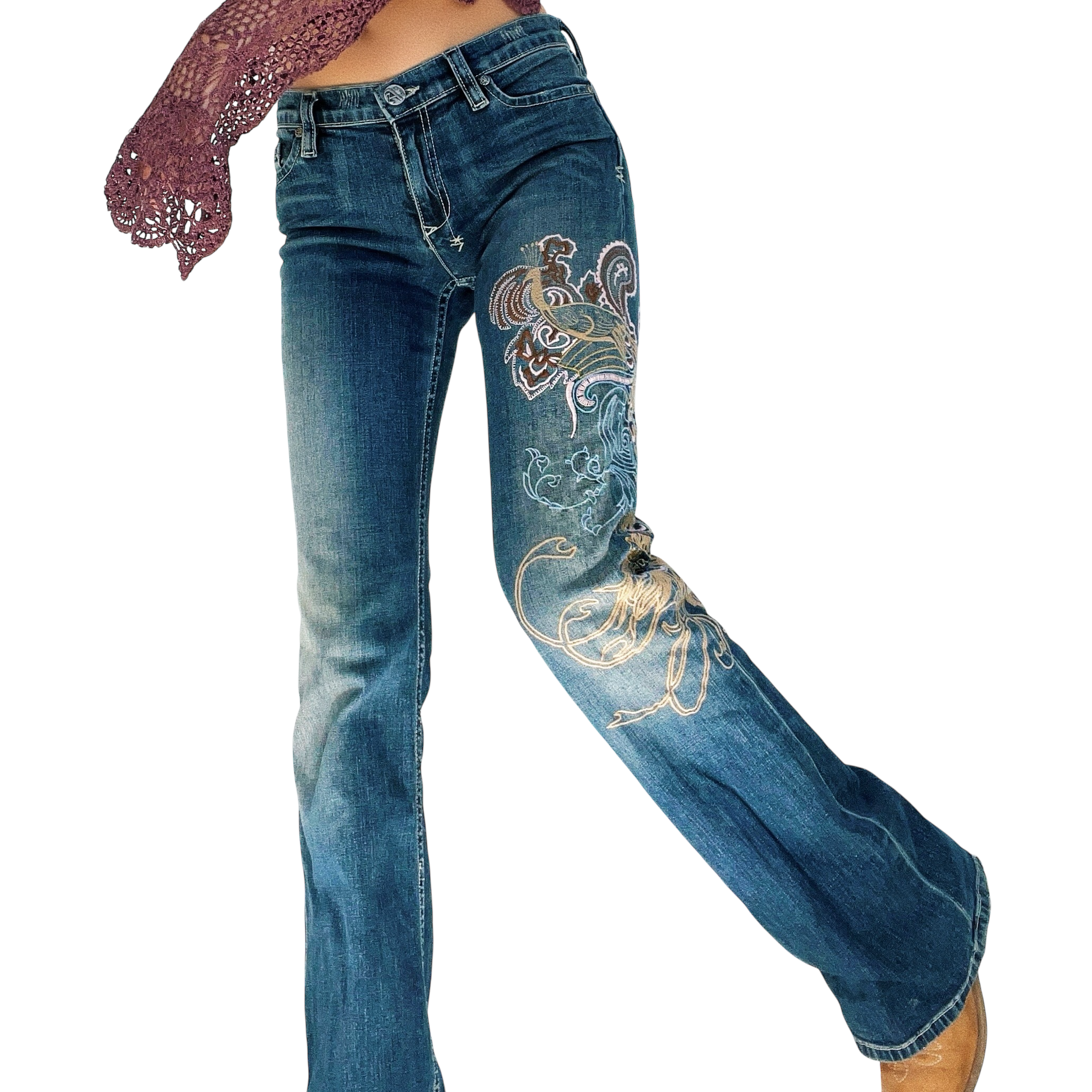 Early 2000s low rise jeans with the cutest embroidered paisley/peacock feather details!