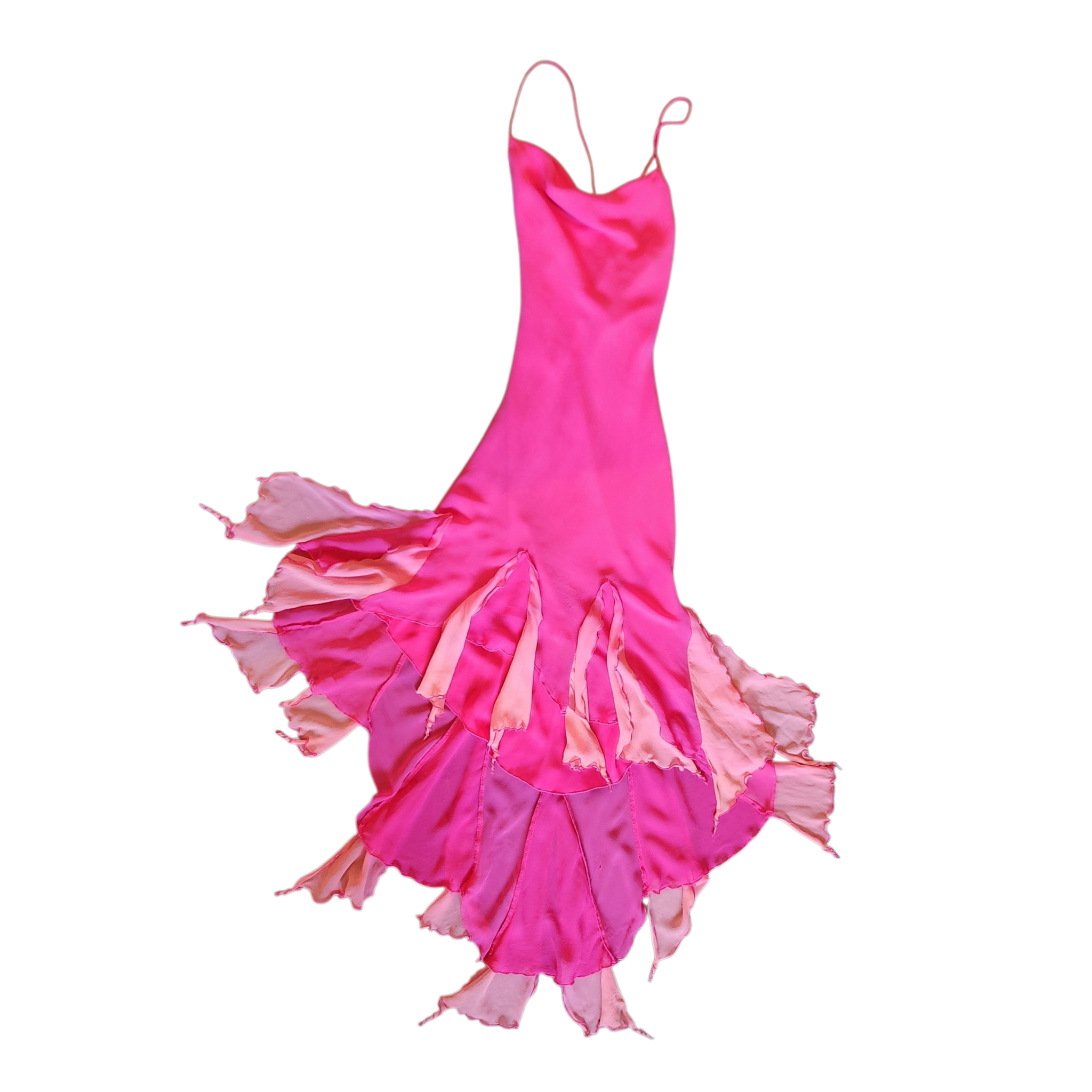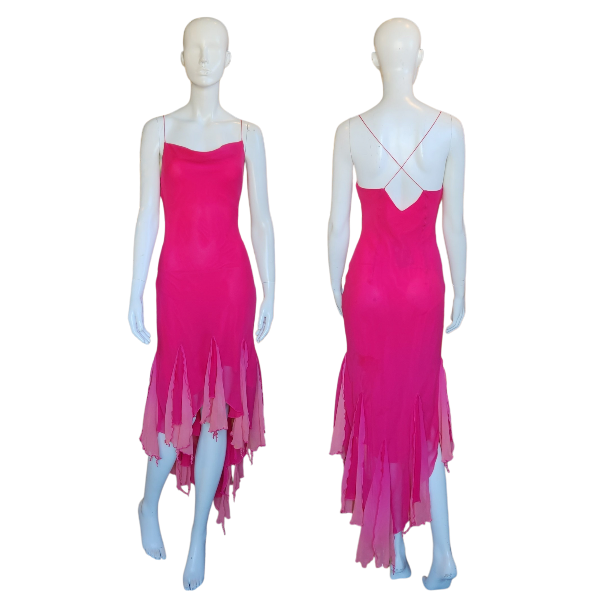Vintage Caché hot pink and light pink slip with cowl neck line and asymmetrical ruched fringe hem. 100% silk, marked size 2, material has slight give and is made to fit snug, wiggles on no closures