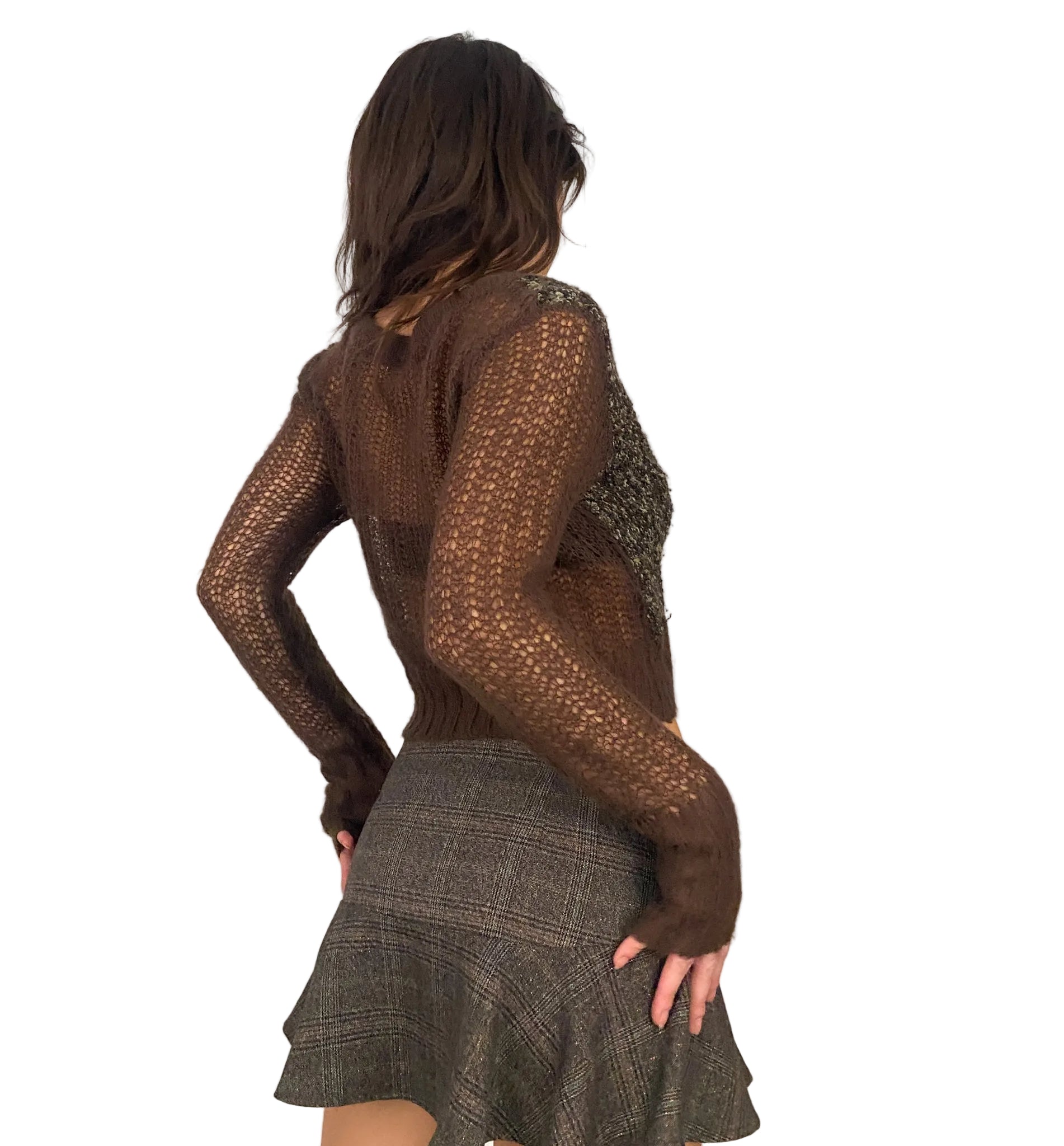 brown cropped sweater with a gray boucle body and open knit sleeves and back. no tag, but it's soft and not itchy.