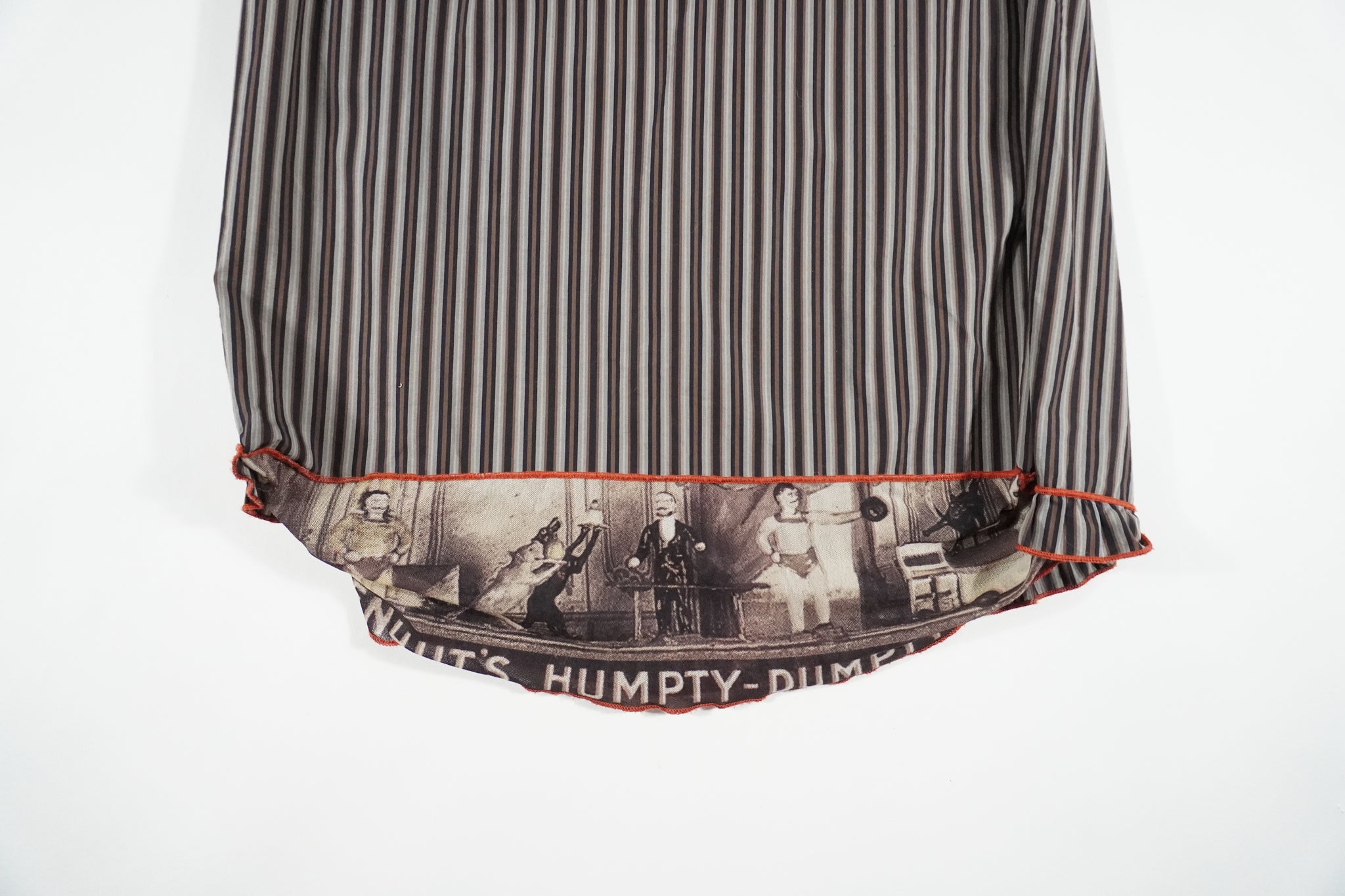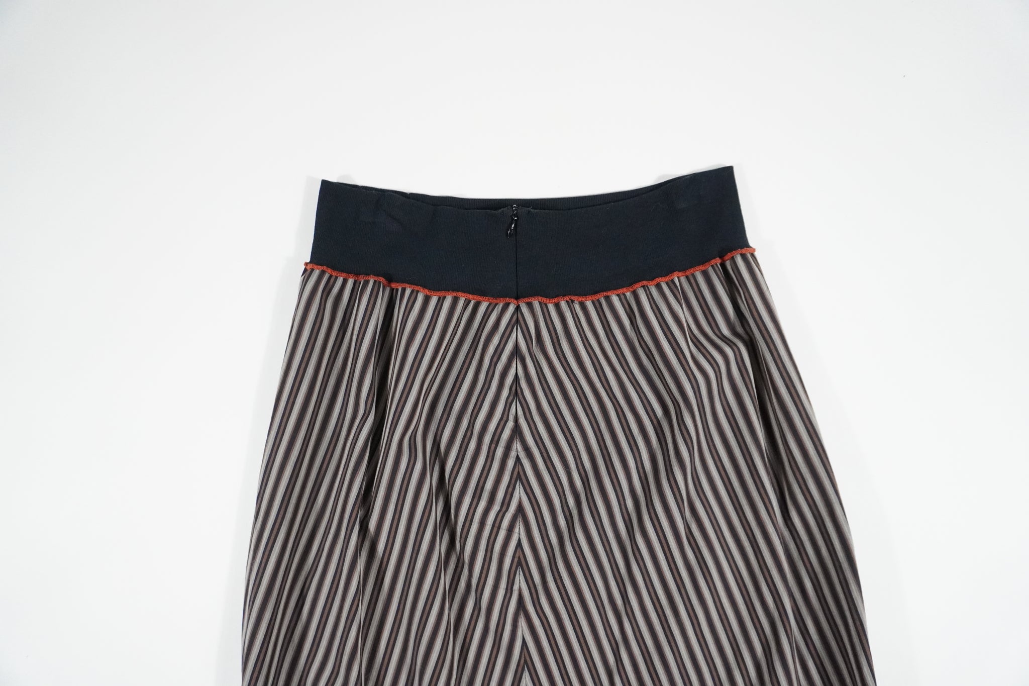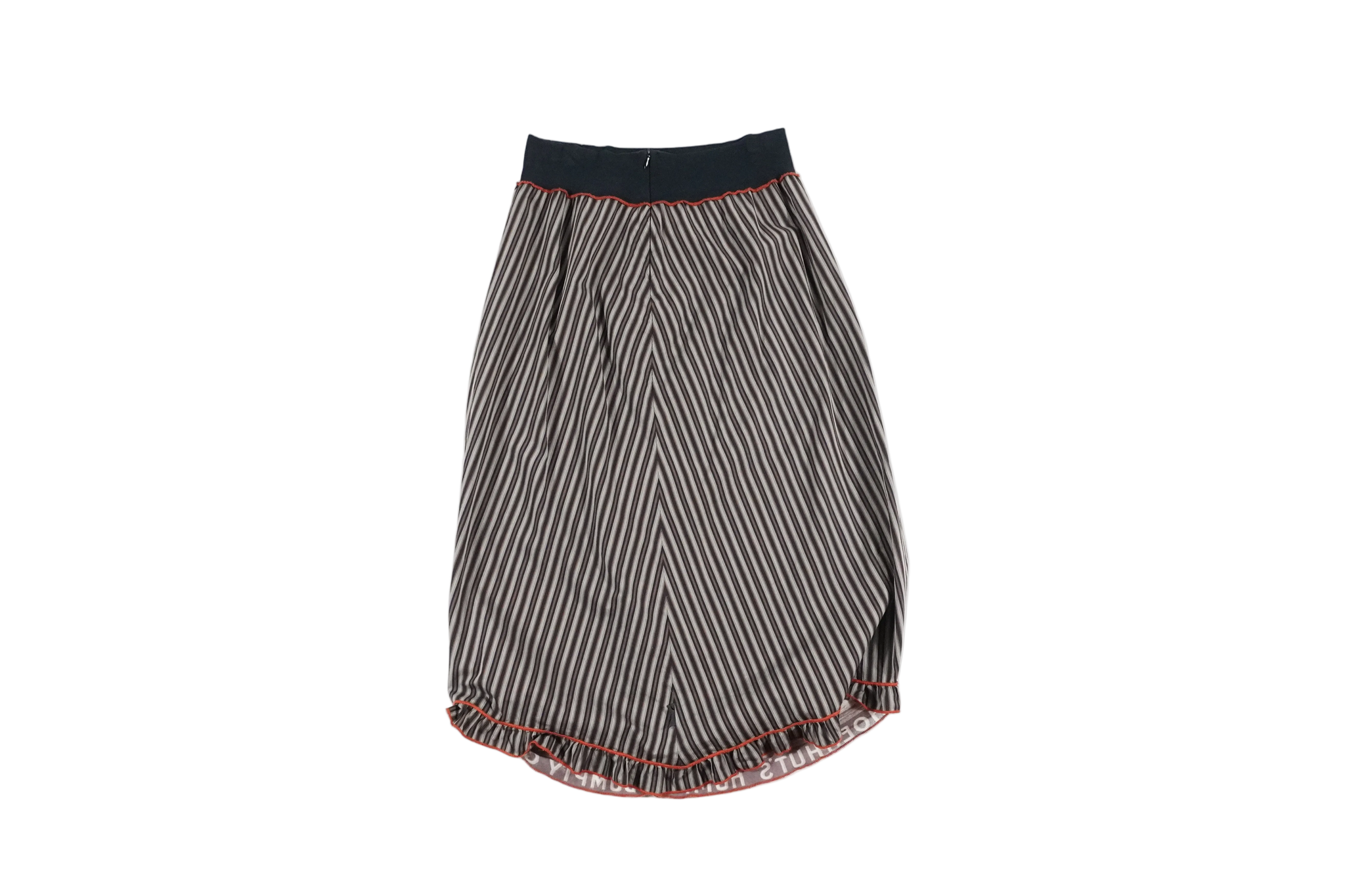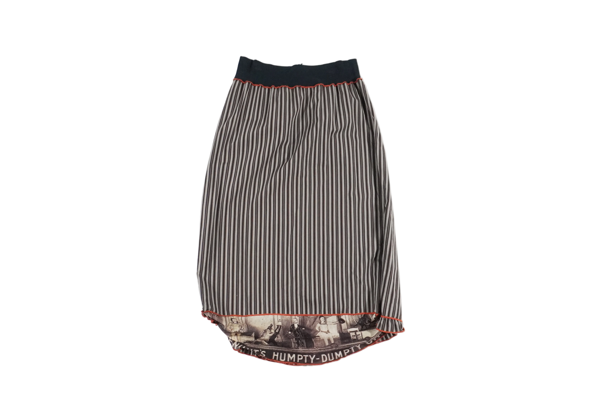 Rare Humpty Dumpty Cop Copine striped asymmetric midi skirt with elastic waistband and mesh graphic detail at the bottom. Back zipper closure.