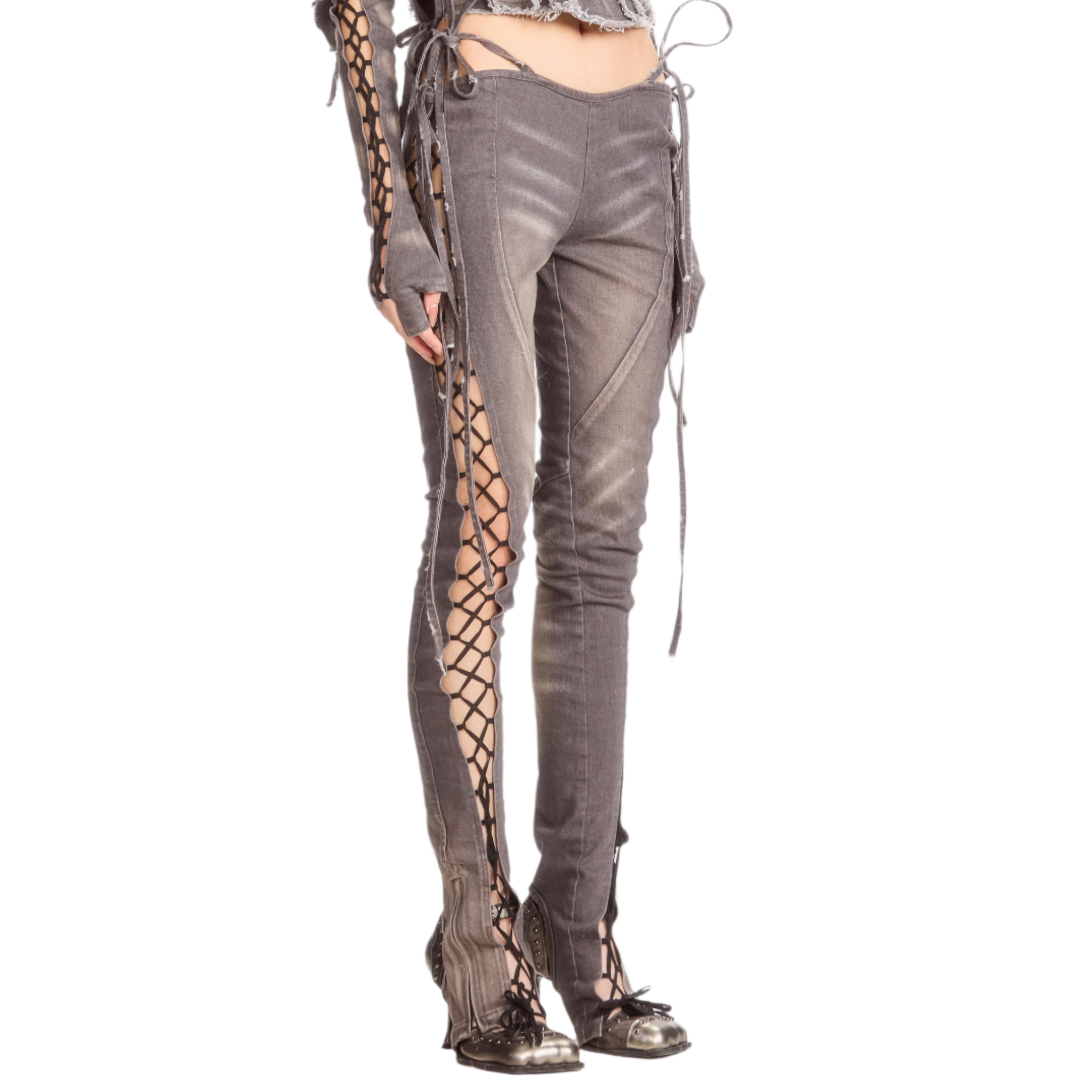 Runaway bunny queen slim fitting stone washed denim lace-up pants. Made for the apocalypse princess. Long enough to go over your heels.