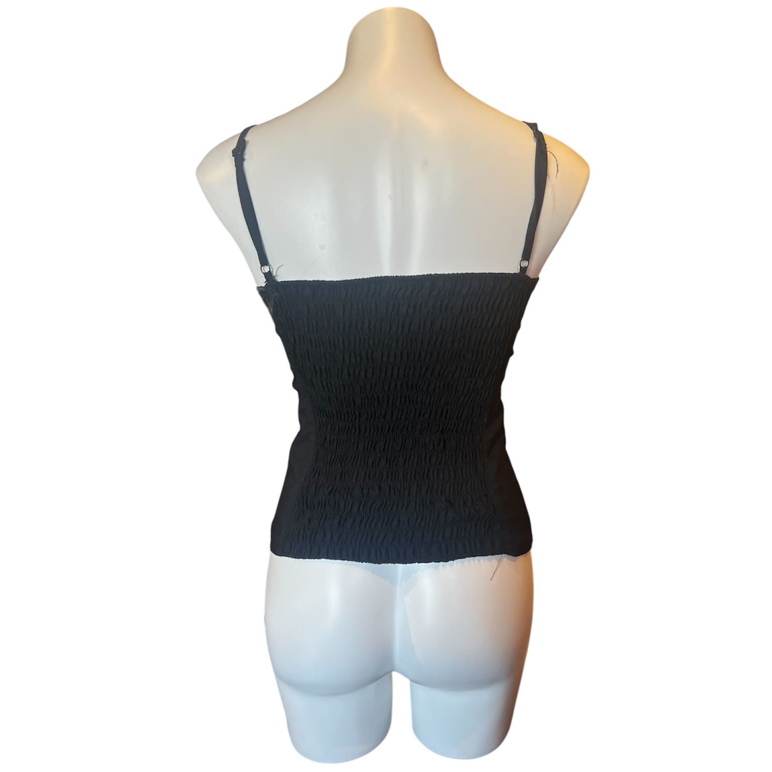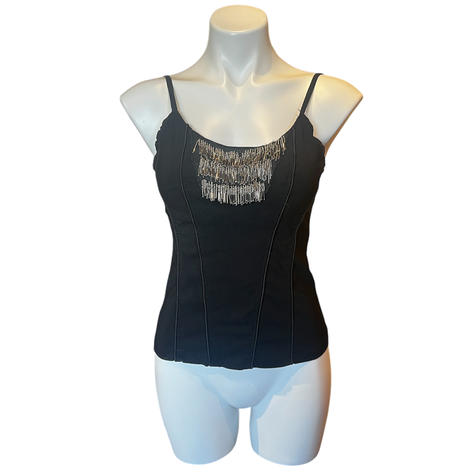 Black stretchy corset tank with silver dangly beads on the bodice.
