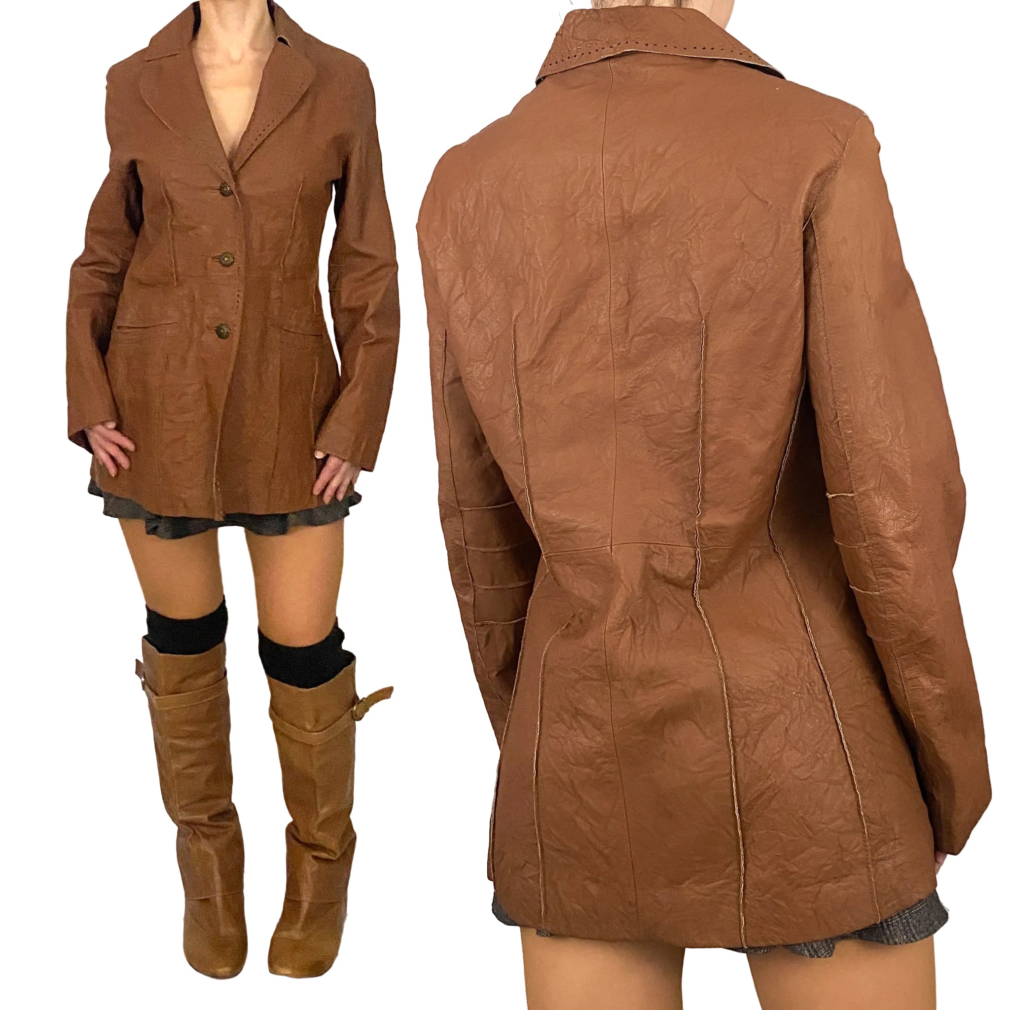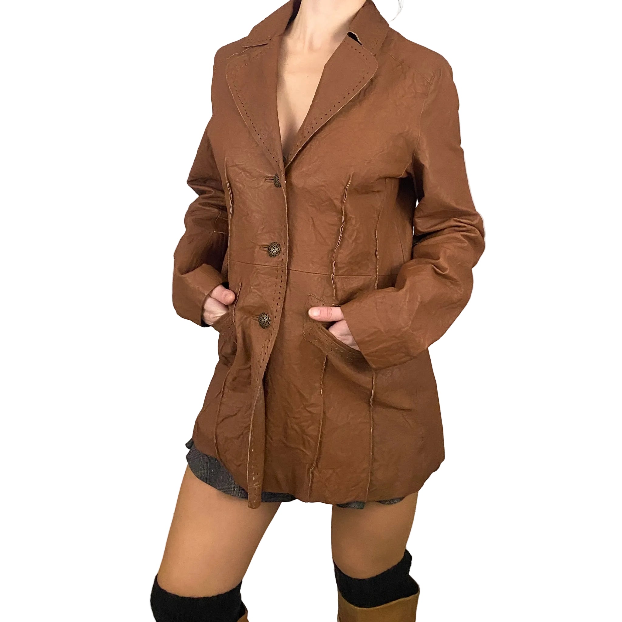 wilsons leather camel tan genuine leather blazer jacket. has pockets and exposed seams.