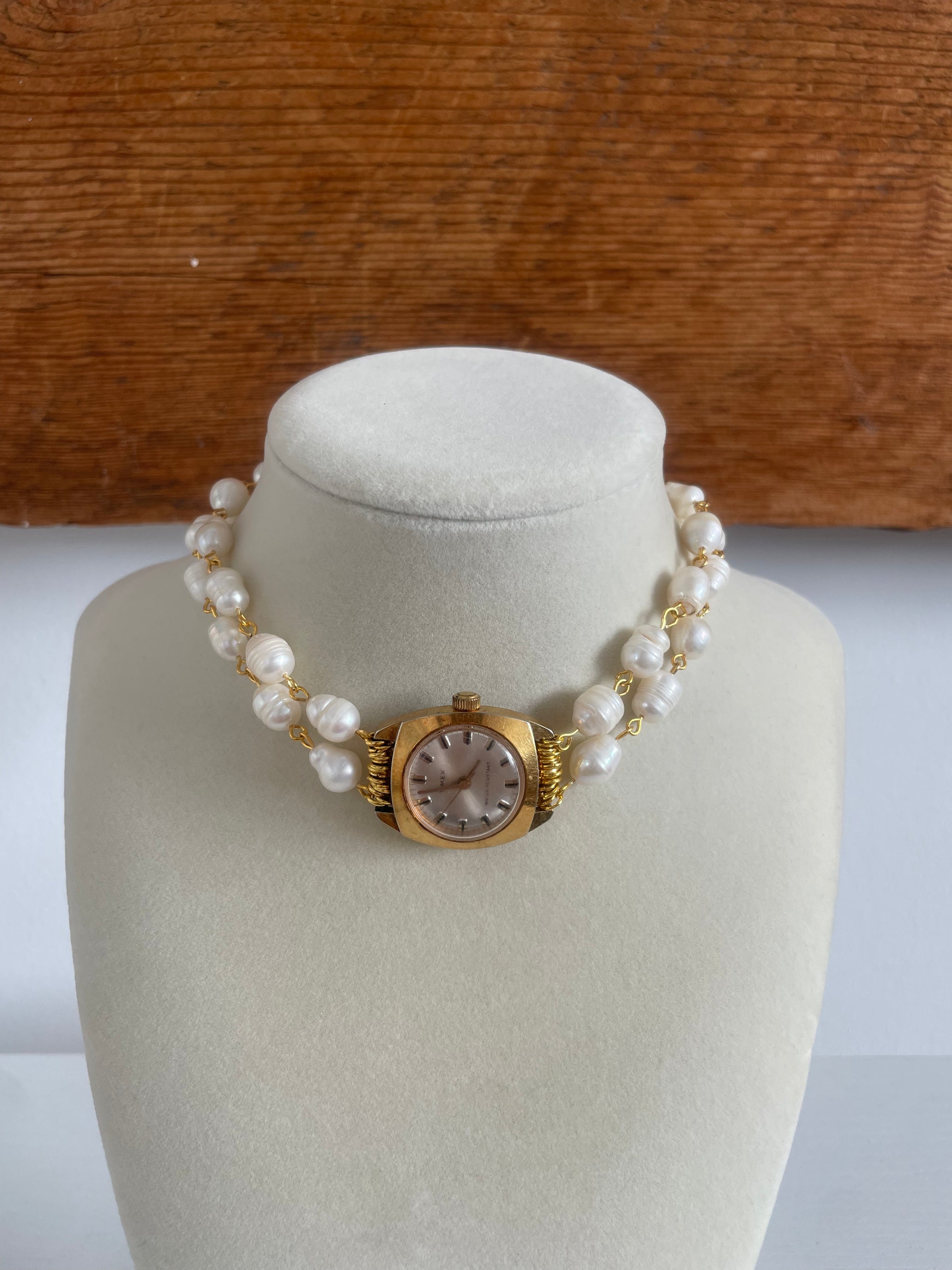 handmade choker featuring a vintage watch face and double strand freshwater pearls. this item is made to order and may take up to two weeks of processing time. Watch faces are all 1/1 and may vary in size and shape.