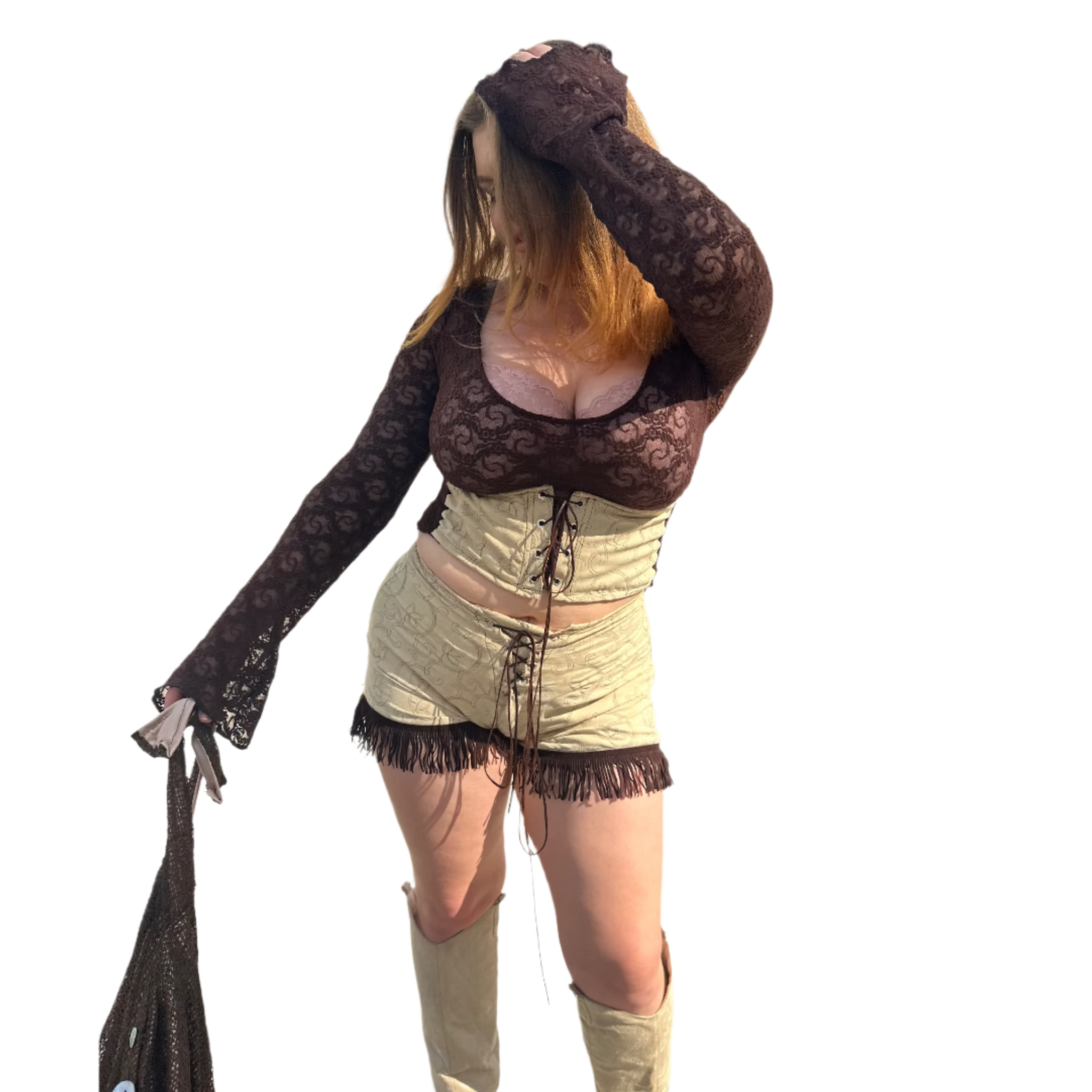 Beautiful embroidered set made with suede fabric and high quality brown lace. Shorts can be made low rise, mid rise, and high rise. Top can be corseted in the front or back to be styled perfect for multiple looks and photo ops!