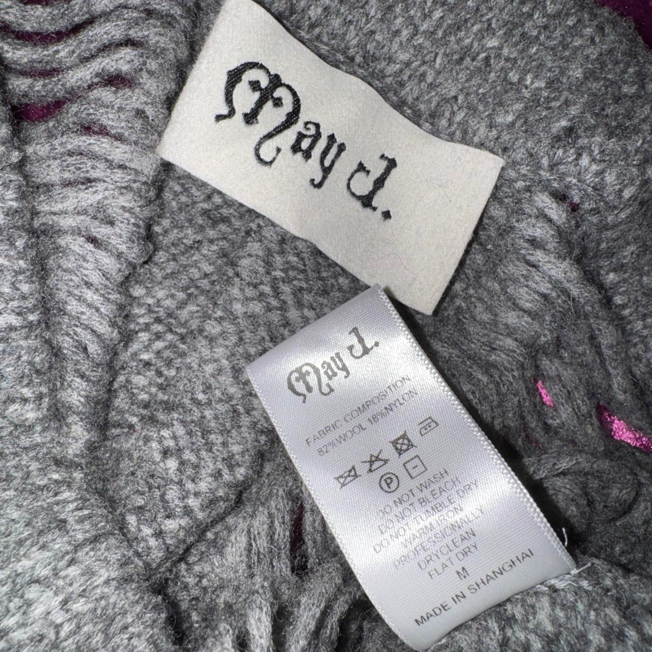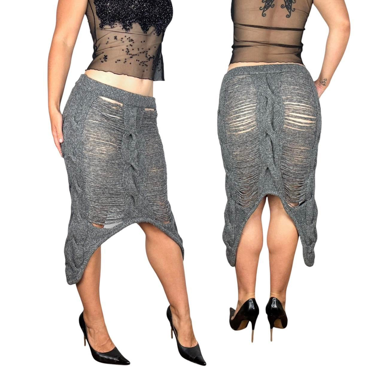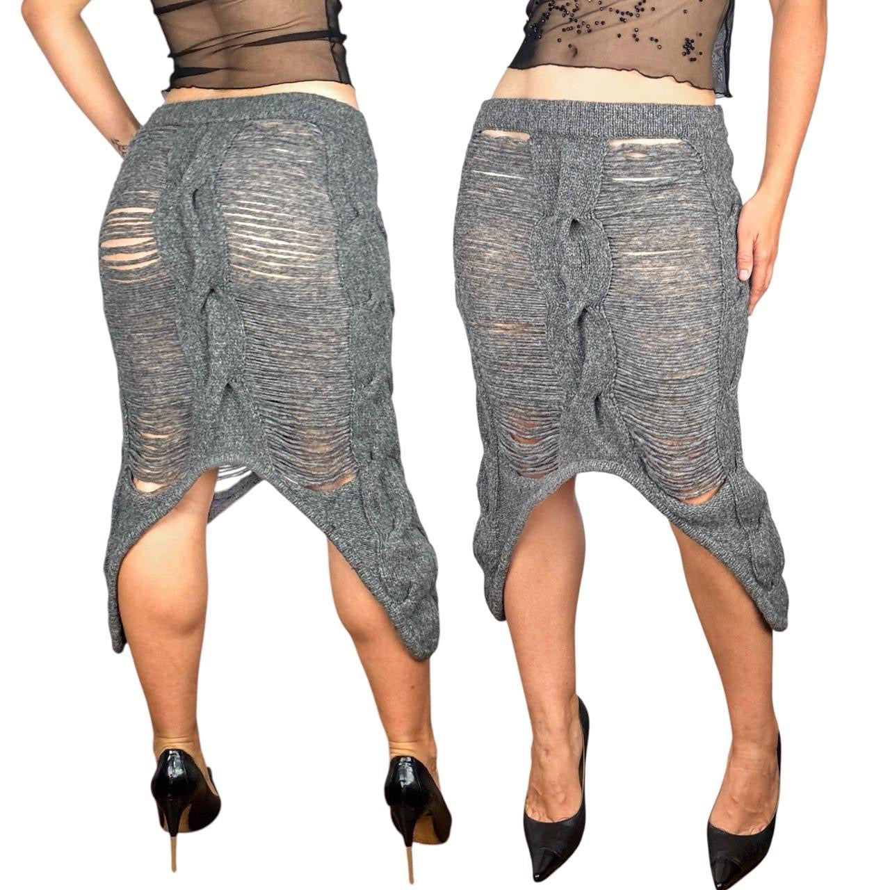 Luxurious 82% wool 18% nylon construction. Stretchy cable knit with sheer cutouts that give off a distressed vibe. Unique silhouette with an avant garde split hem. Great pre-loved condition; just has some light pilling.