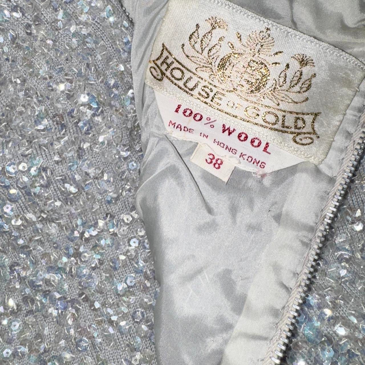 Gorgeous silvery blue knit blouse from the 1960s with iridescent sequins & black plaid balloon sleeves. Floral embroidery & an elegant high neckline. Back zip closure. Great pre-loved condition; minor wear on the satin lining.