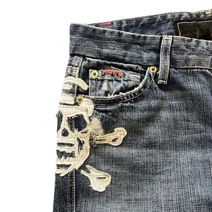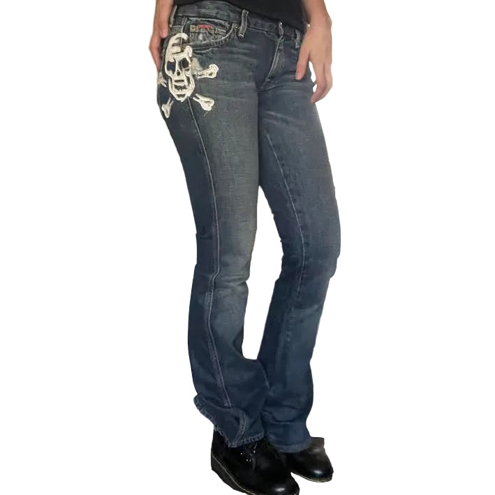 Vintage perfect fit bootcut jeans with skull embellishment.