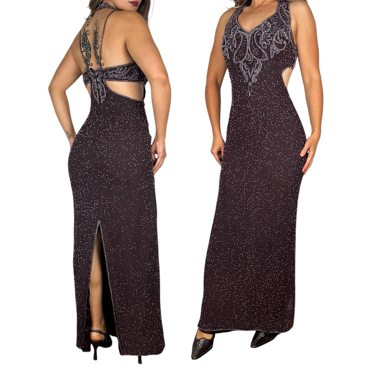 Stunning brown 100% silk formal maxi dress with silver beading. Open back with gorgeous cutouts on the sides. Excellent condition.