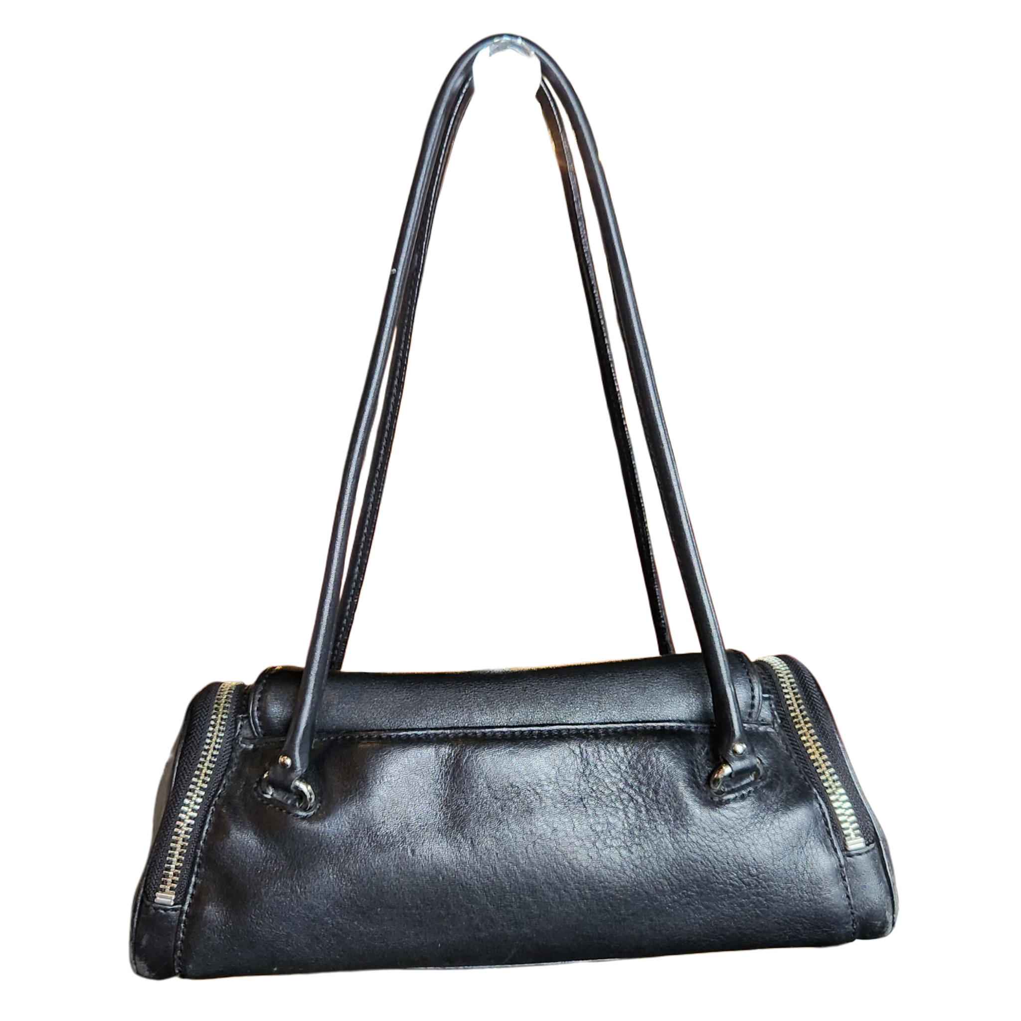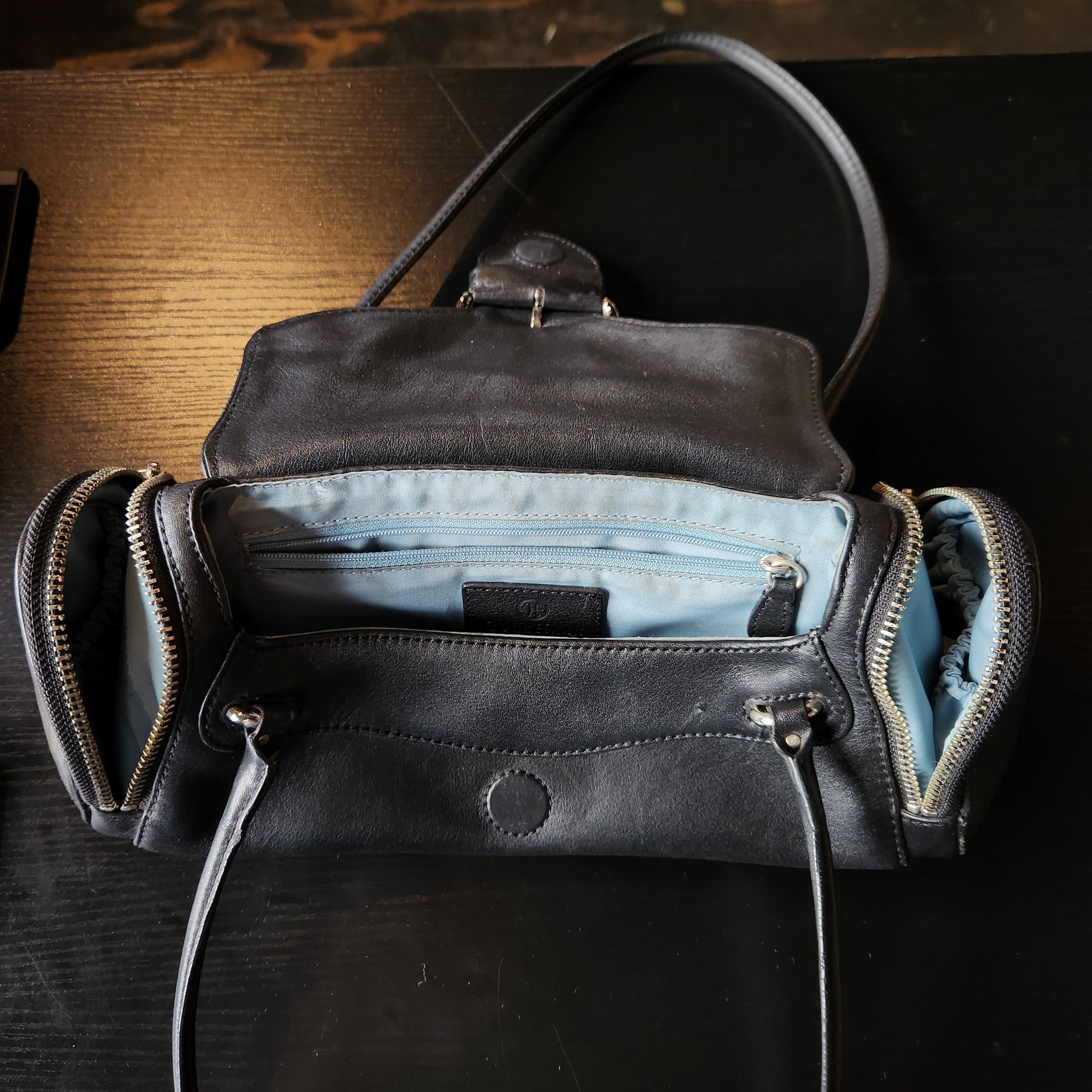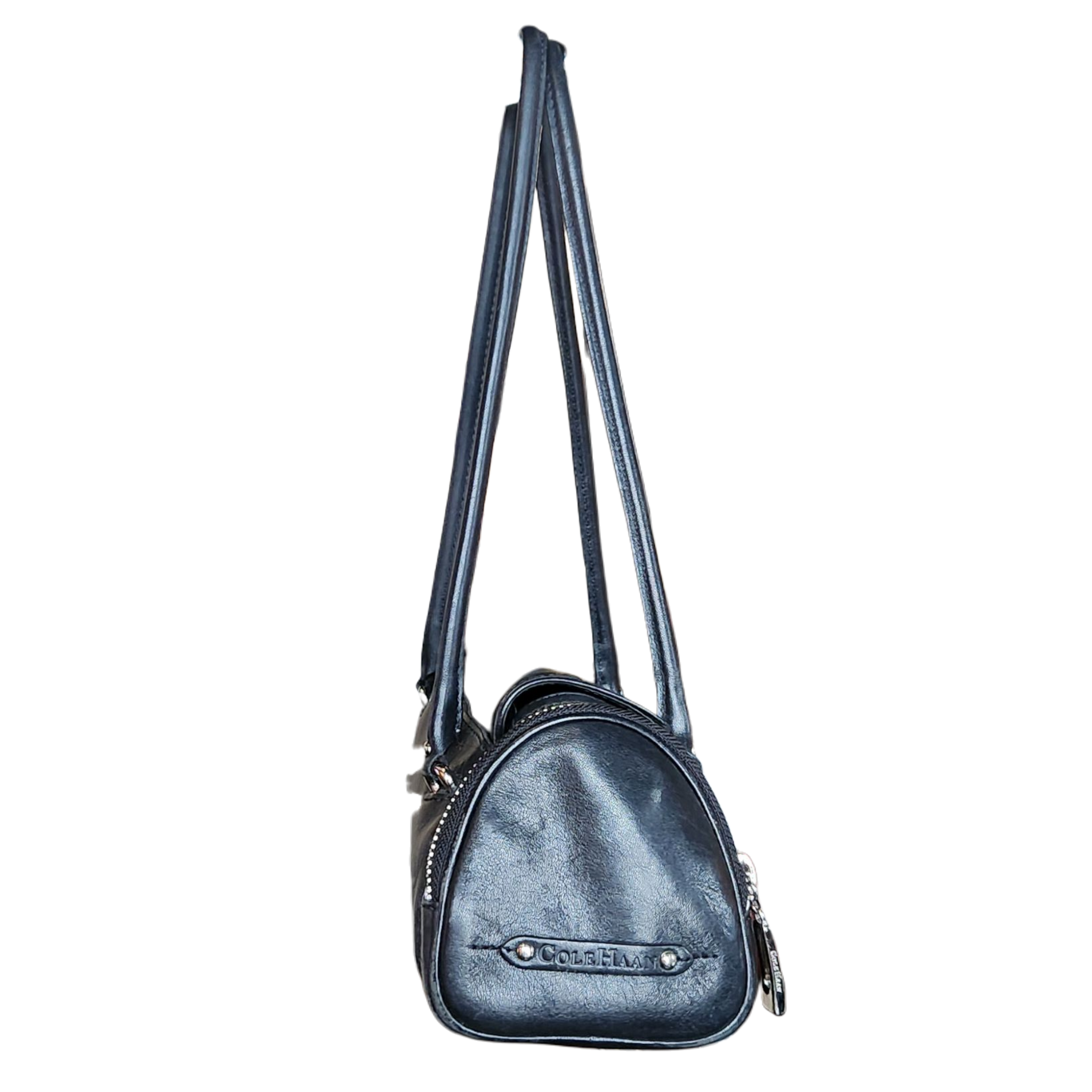 Black leather mini barrel bag by Cole Haan. Includes two side pockets and one pocket inside, silver hardware with a magnet closure, and blue interior.