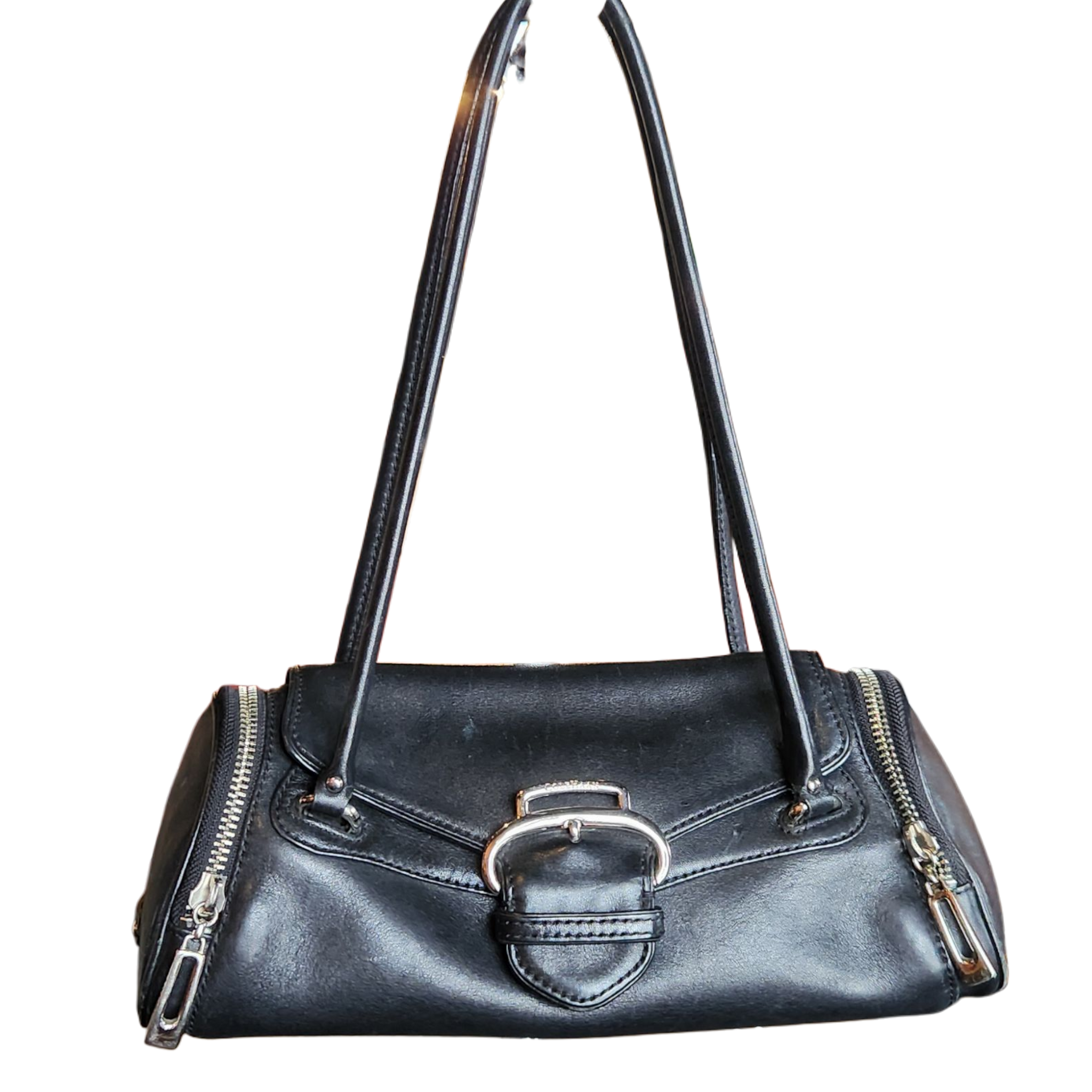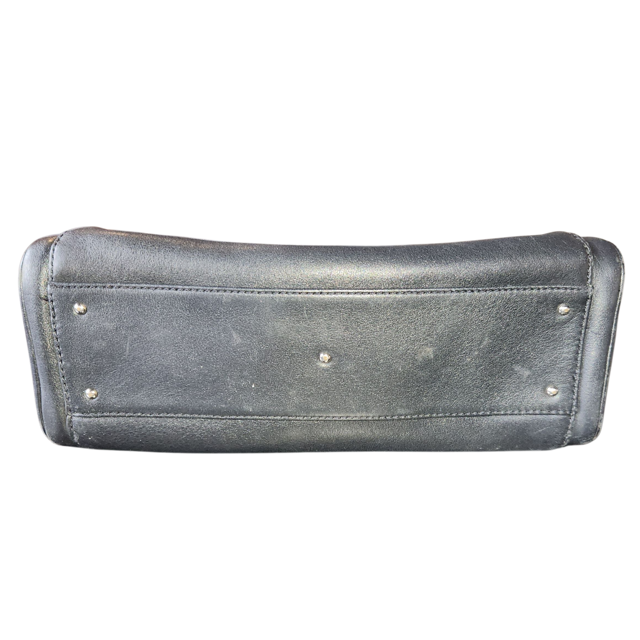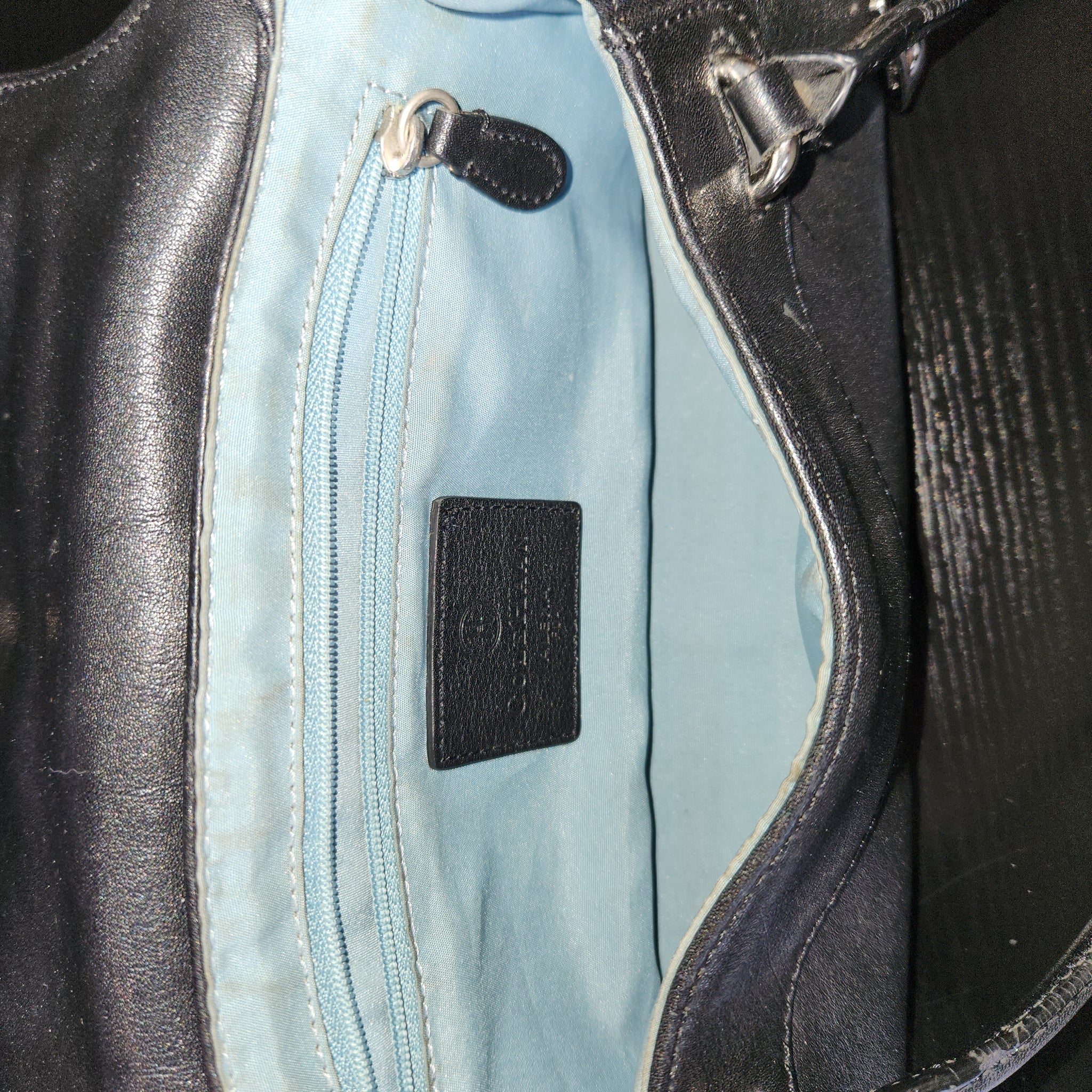 Black leather mini barrel bag by Cole Haan. Includes two side pockets and one pocket inside, silver hardware with a magnet closure, and blue interior.