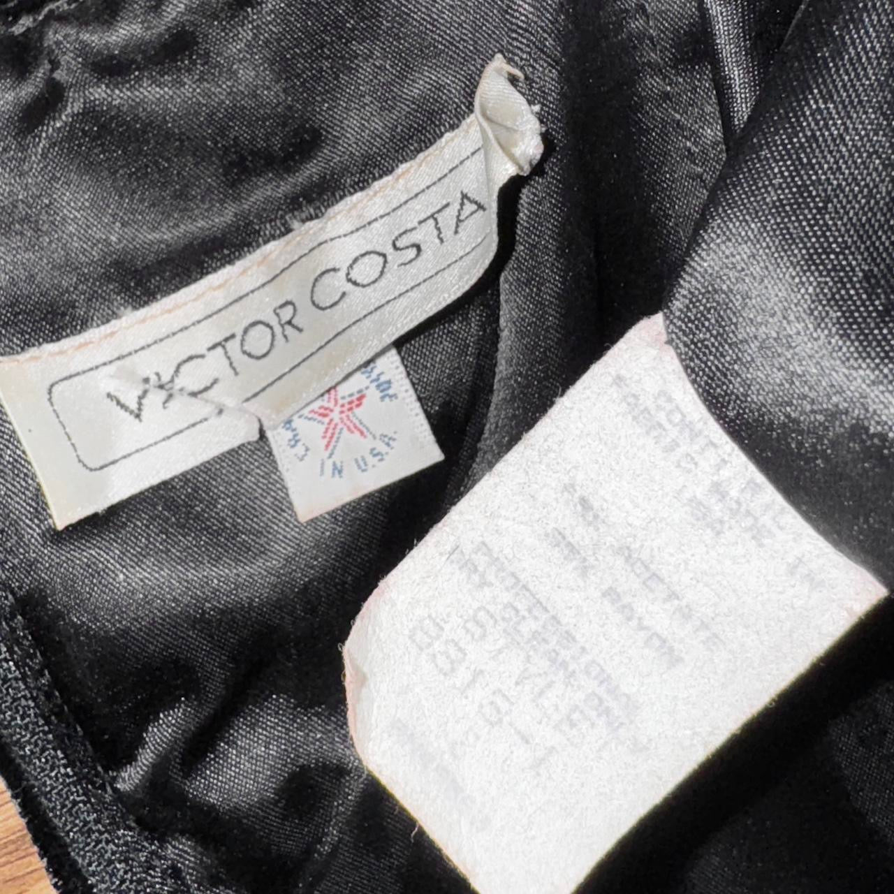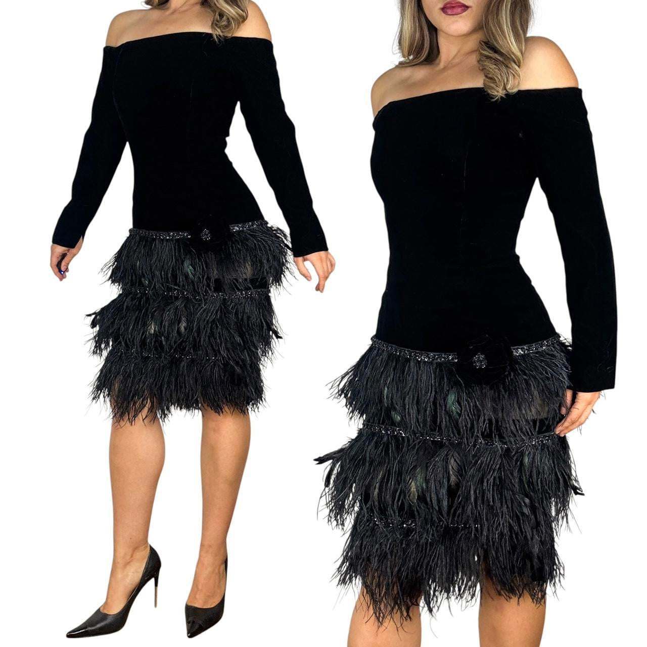 Glamorous off the shoulder midi dress from 90s designer “Victor Costa”. Genuine ostrich feather trim hem with a rosette appliqué & beaded accents. Fitted black velvet bodice. Back zip closure. Excellent condition.