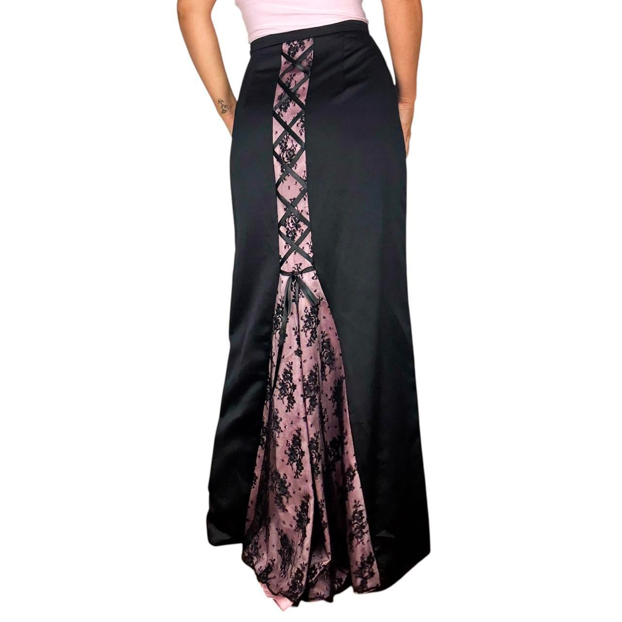 Gorgeous 90s era black satin maxi skirt with baby pink lace & corset ribbon detailing in the back. Side zip & clasp closure. Excellent condition.