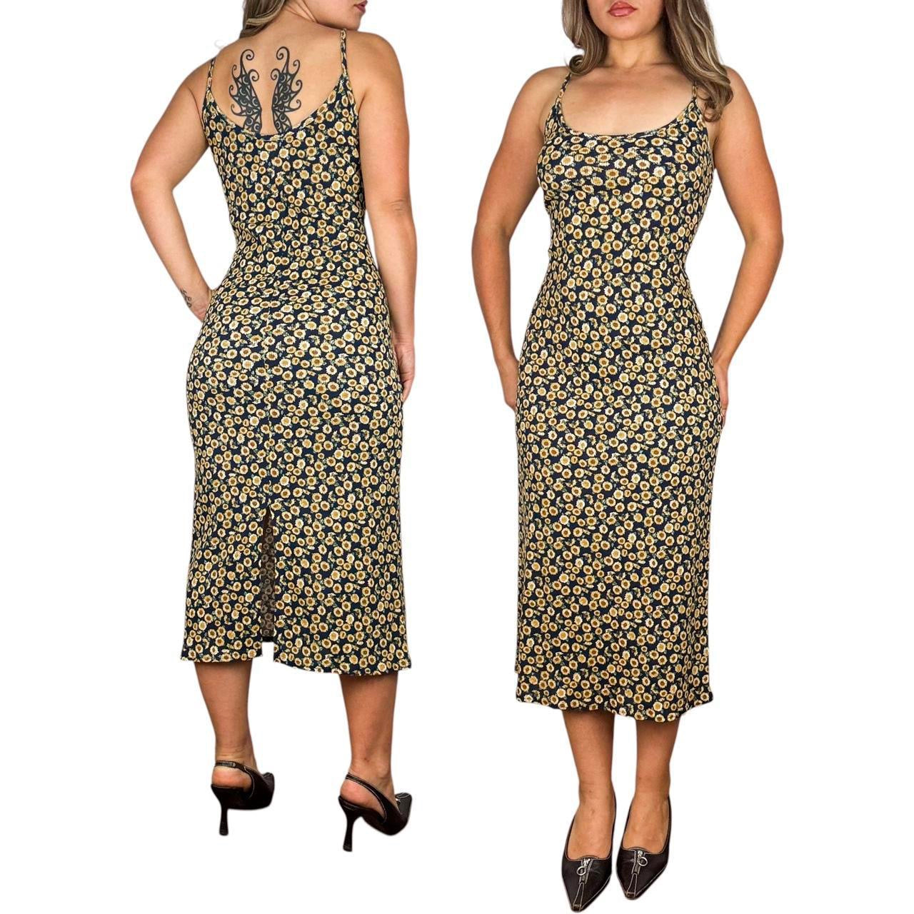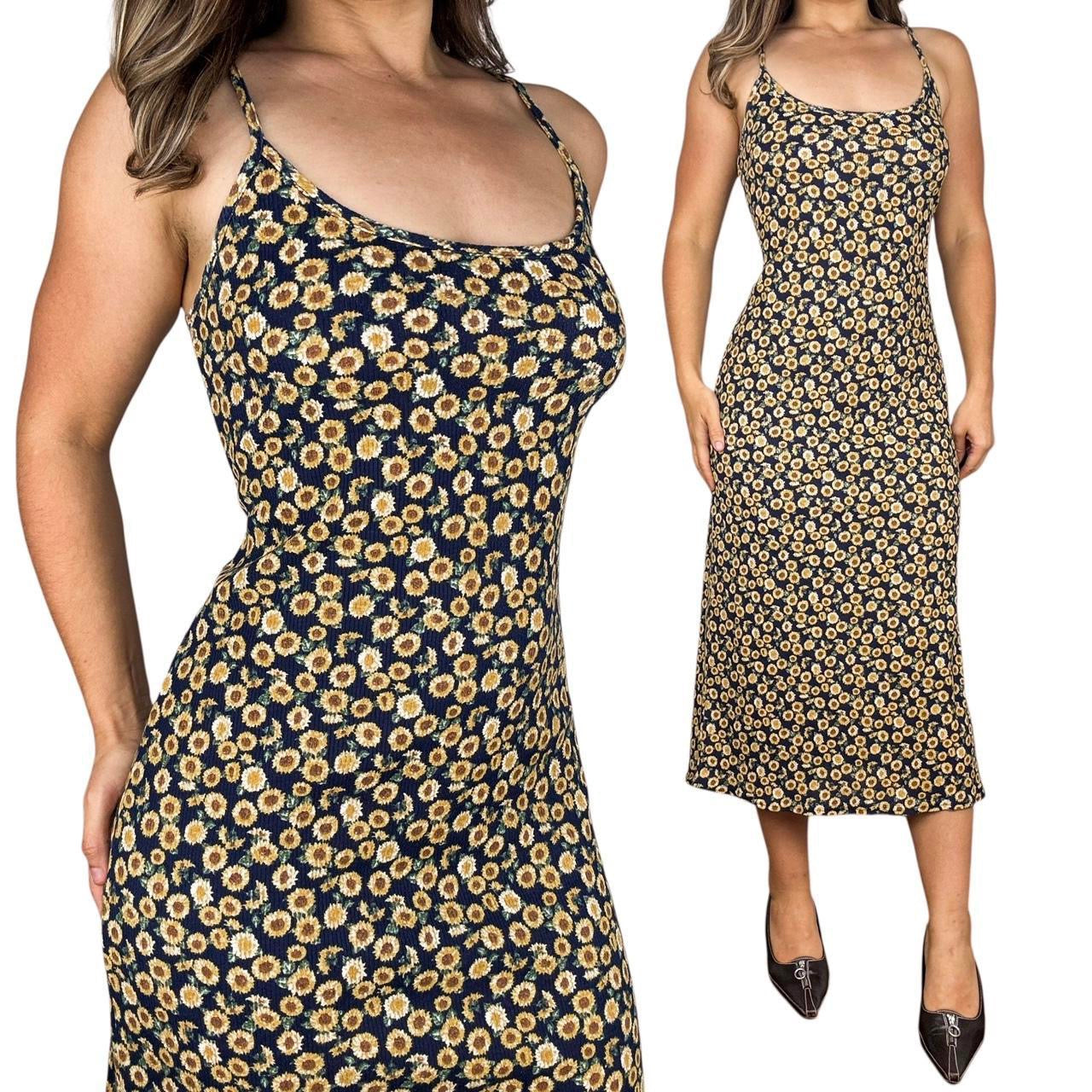 Stunning dress from the 90s featuring a darling sunflower floral print! Stretchy with a ribbed knit texture. Excellent condition.
