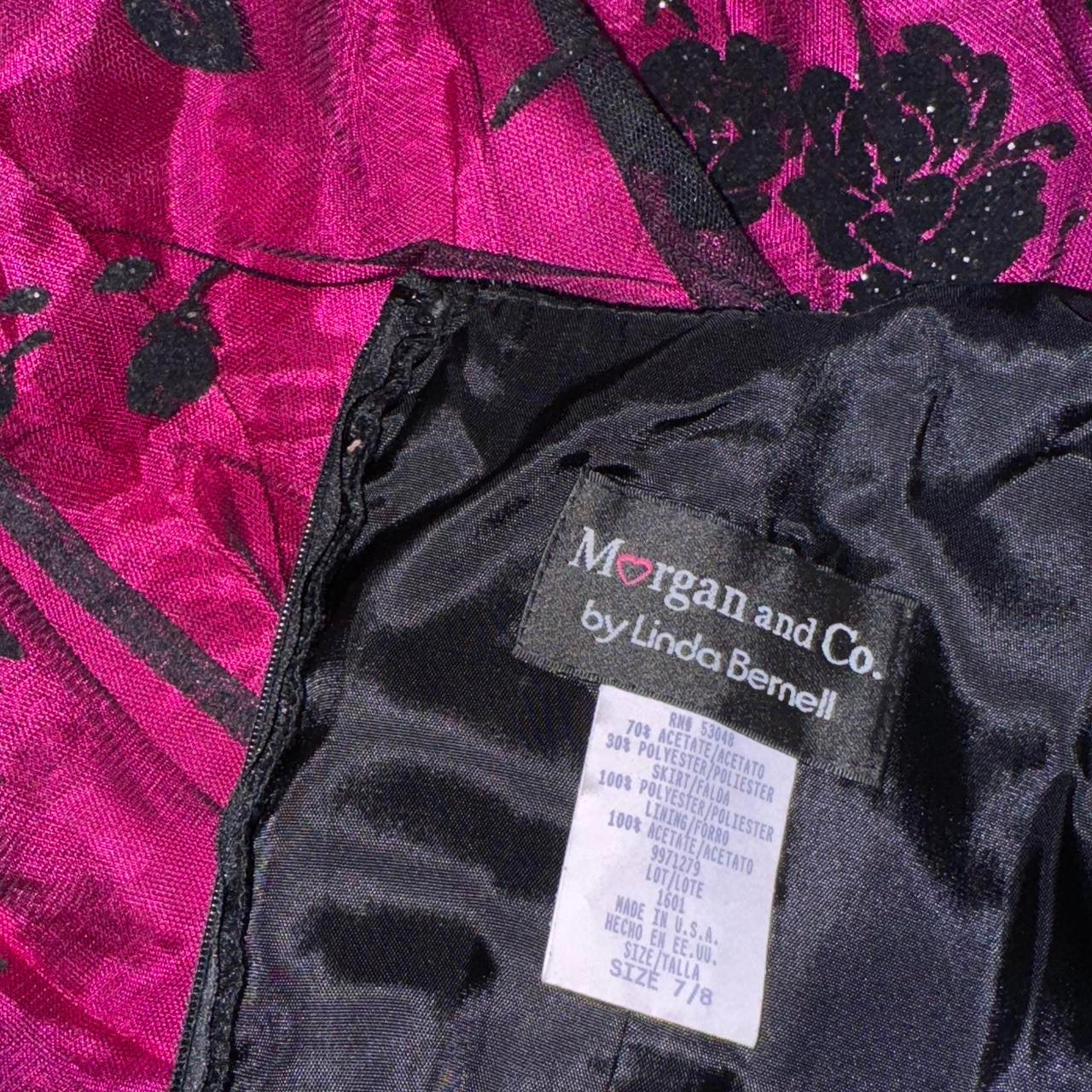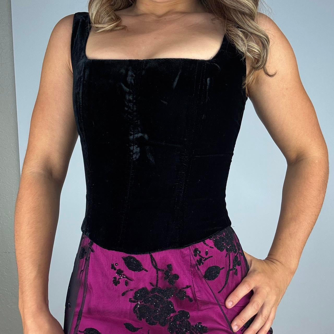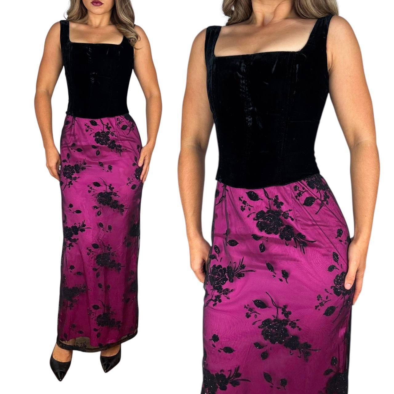 Elegant black & pink formal gown from the 90s. Velvet bustier bodice with a square neckline. Mesh overlay skirt with shimmery florals. Excellent condition.