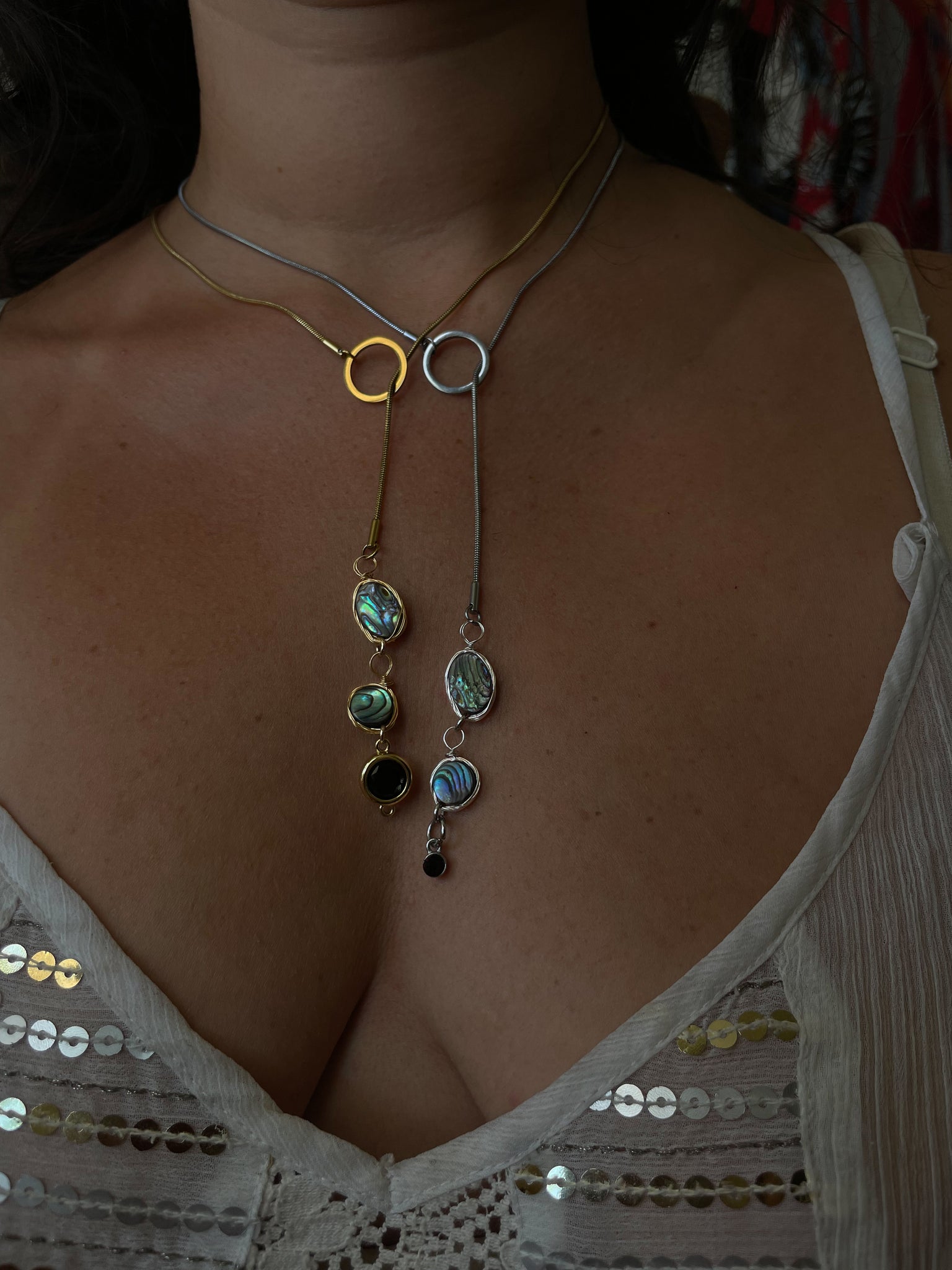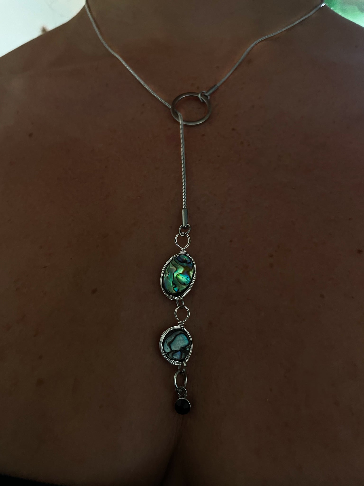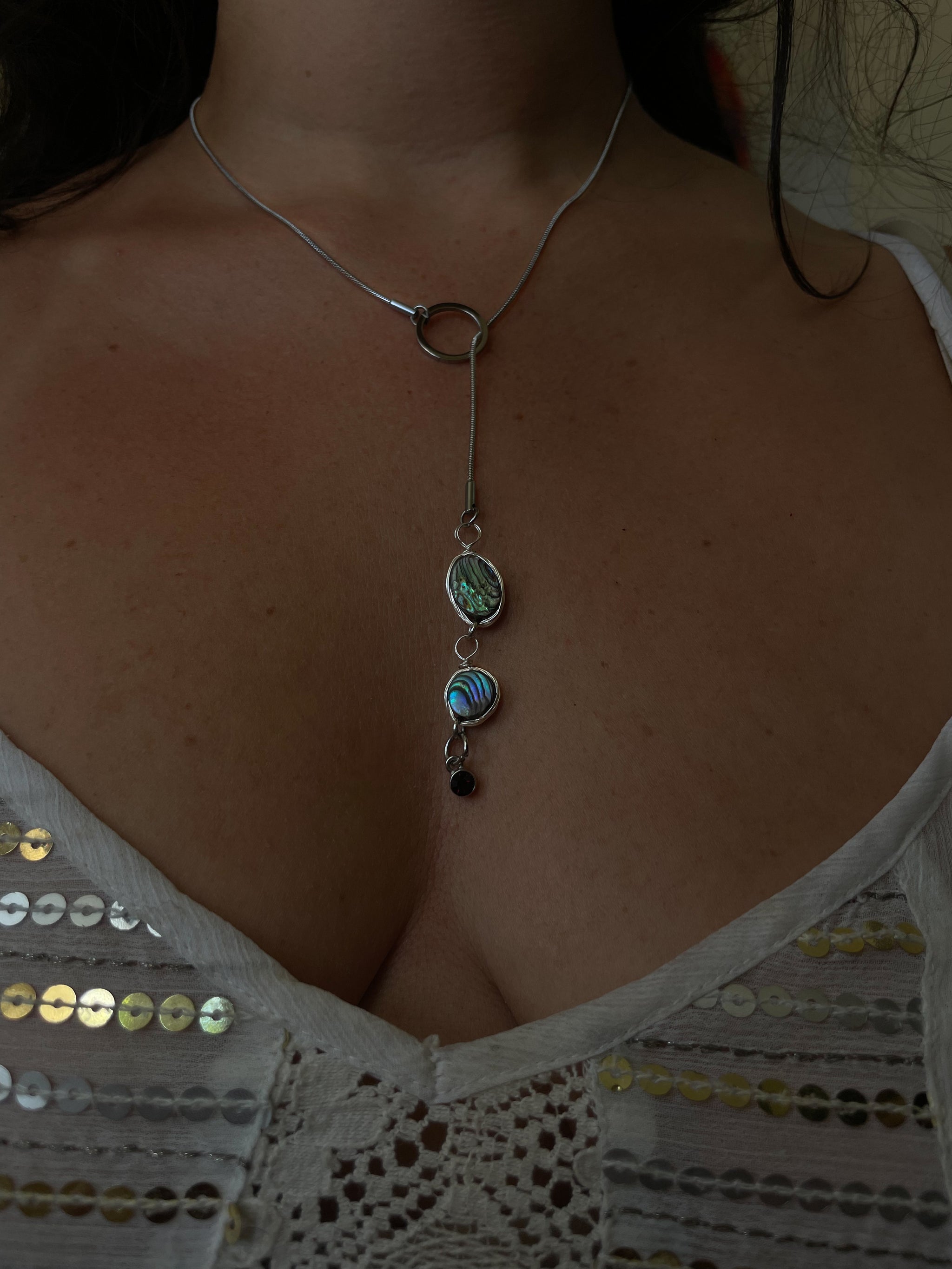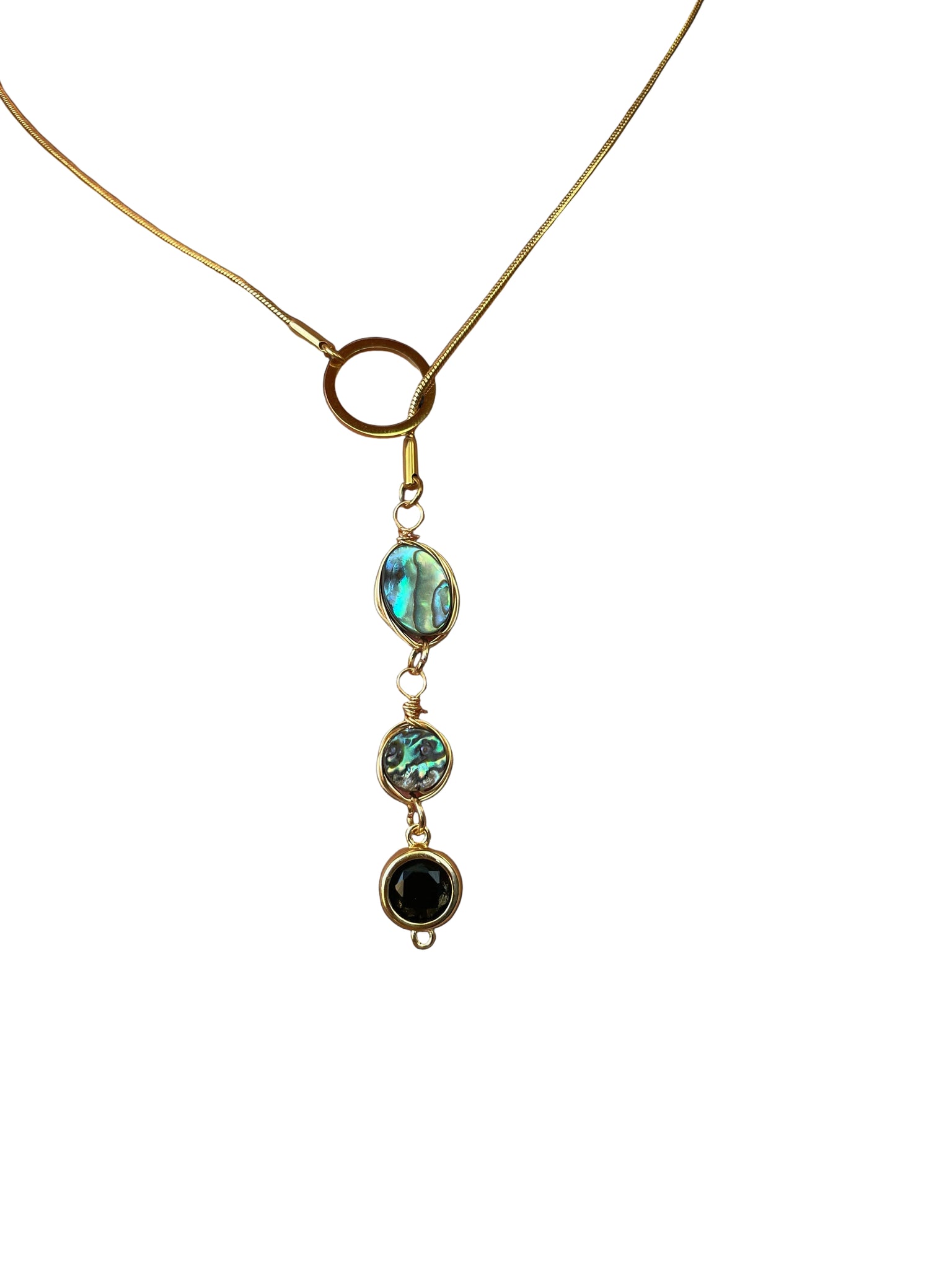 The Angel Drops Necklace is such a timeless statement necklace. It reflects light so beautifully showing off different color hues of greens and blues found within the abalone shell. The stone pendant is also such a breathtaking accent. The circle connector allows you to change the length to however you desire.