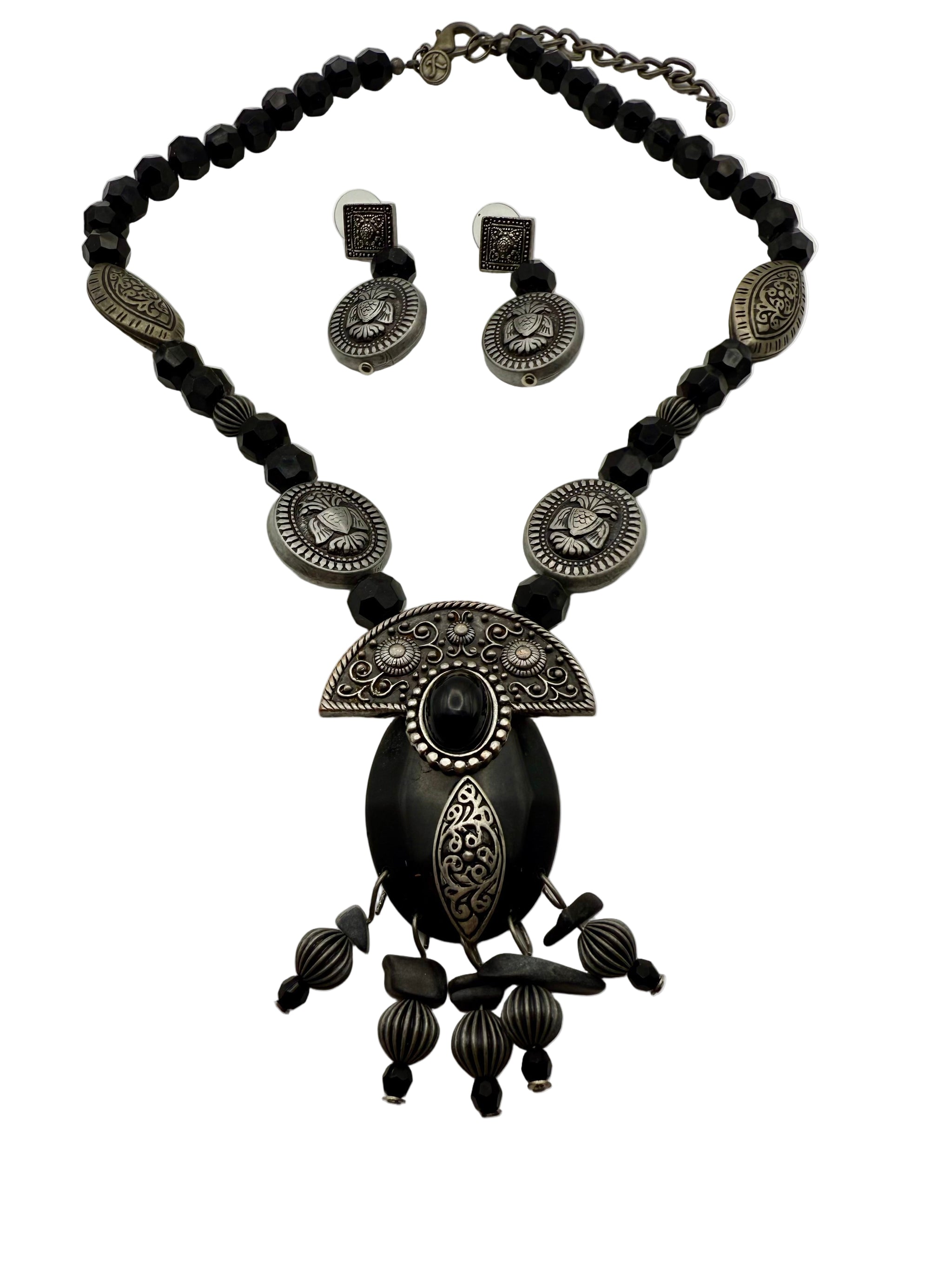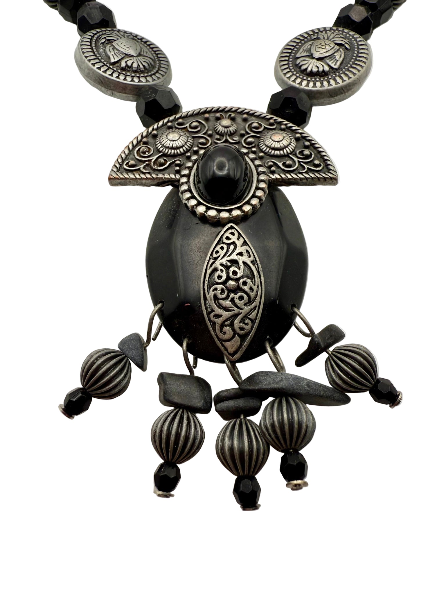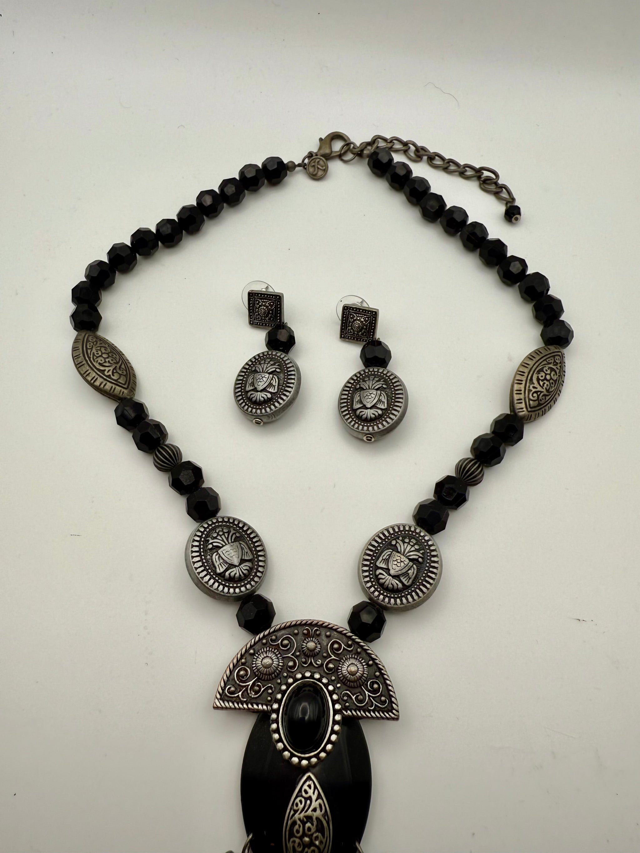 Make a bold impression with this stunning boho-inspired necklace and matching earrings set. Featuring black faceted beads and antique silver detailing, this statement piece adds an elegant touch to any outfit. Perfect for evening wear, special occasions, or elevating a simple look.