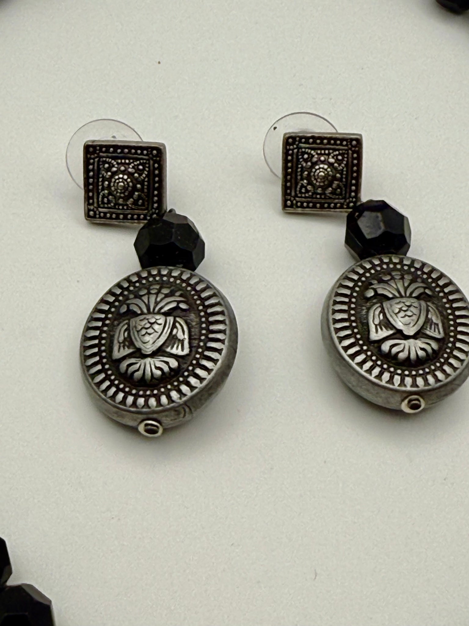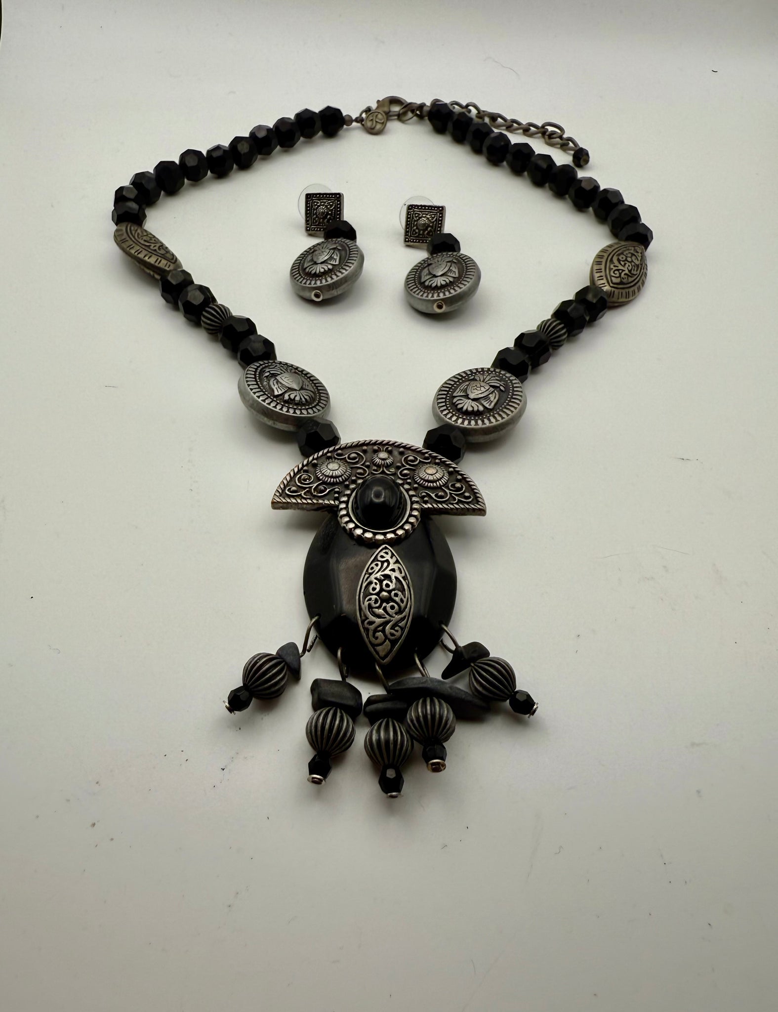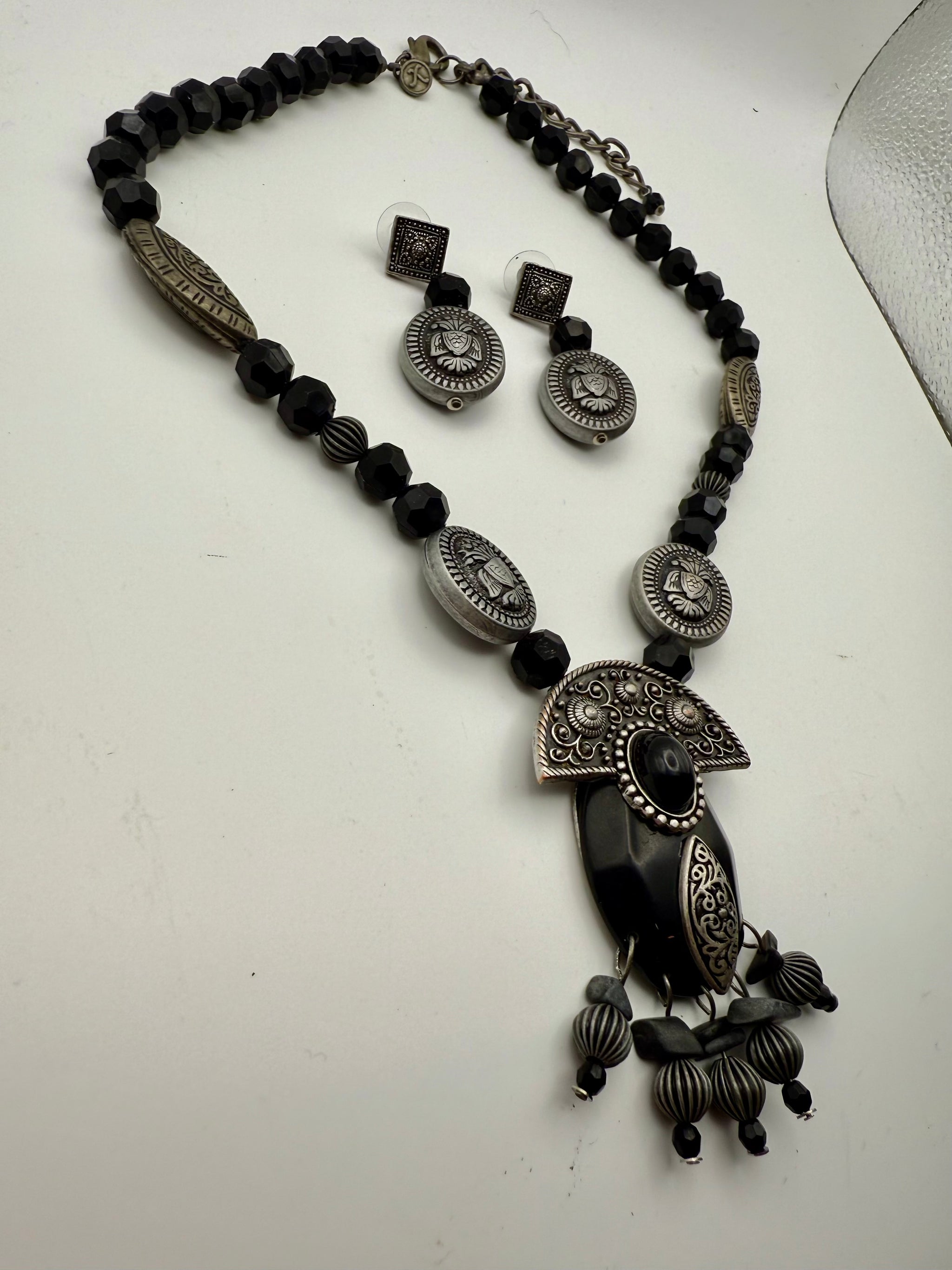 Make a bold impression with this stunning boho-inspired necklace and matching earrings set. Featuring black faceted beads and antique silver detailing, this statement piece adds an elegant touch to any outfit. Perfect for evening wear, special occasions, or elevating a simple look.
