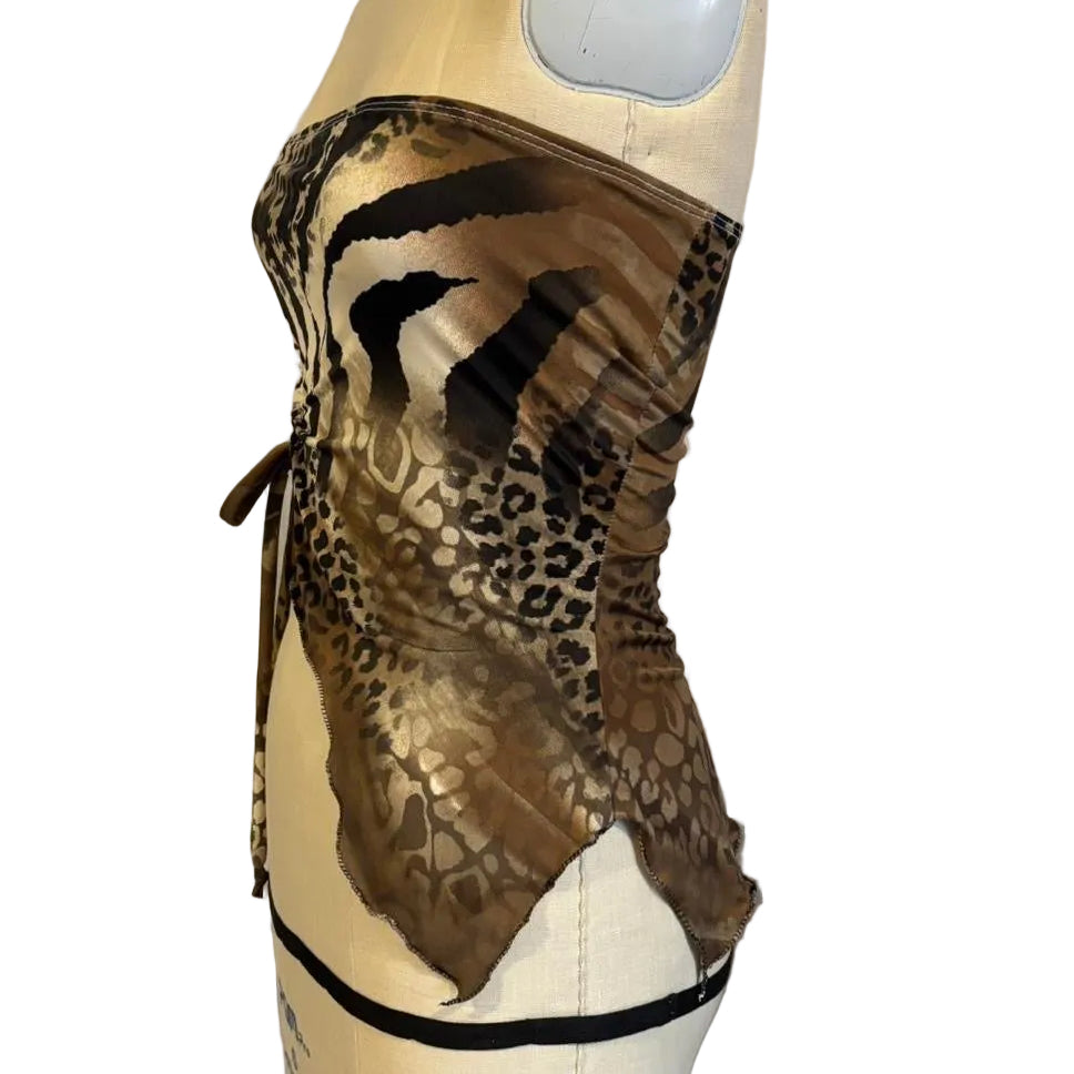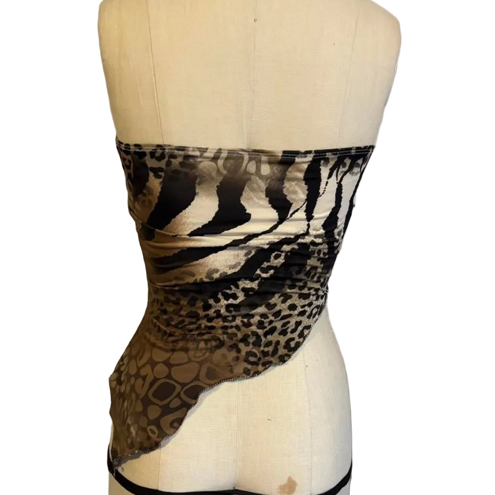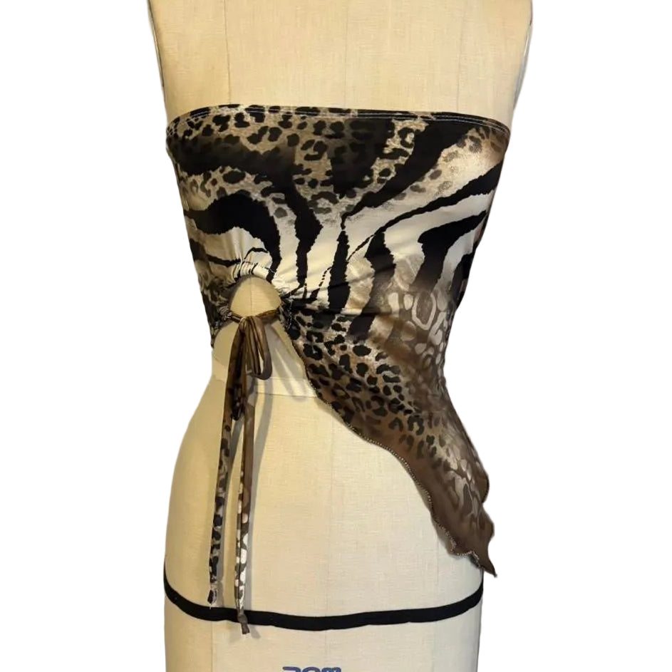 The baby J top provides a fluid silhouette and assymetrical design. Keep in mind due to the mixed print each top will be slightly different. The keyhole and split hem detail elevate the typically simple tube top.