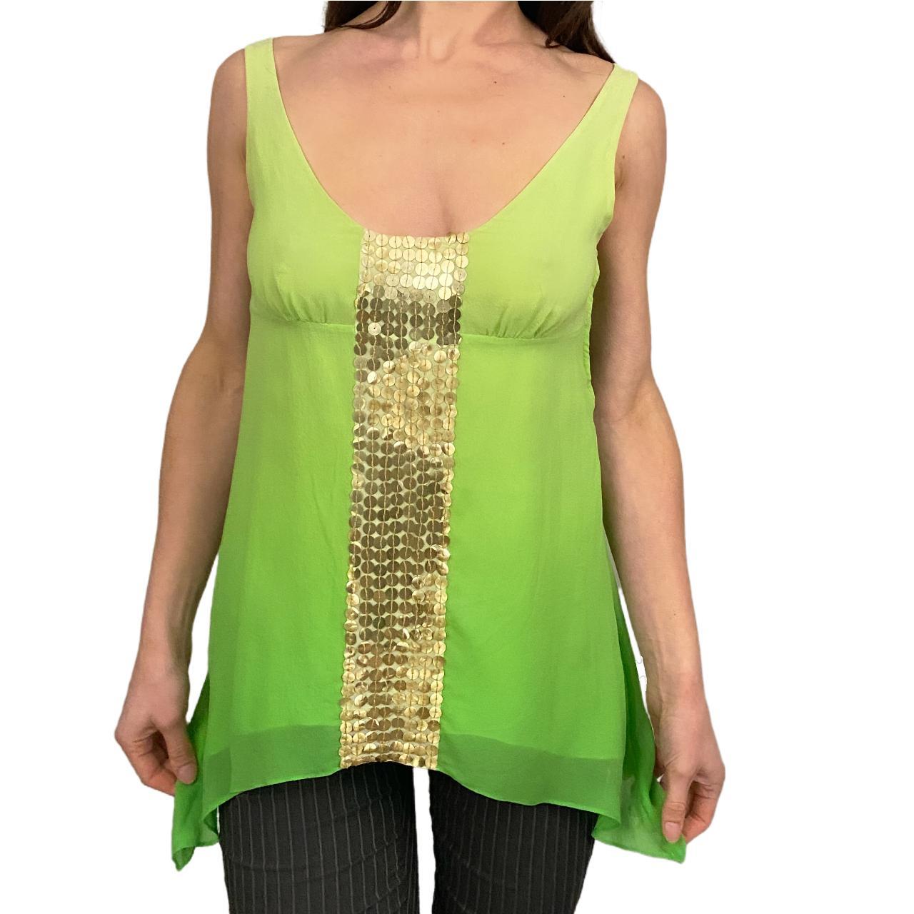bcbgmaxazria lime green silk top with gold sequin embellishments