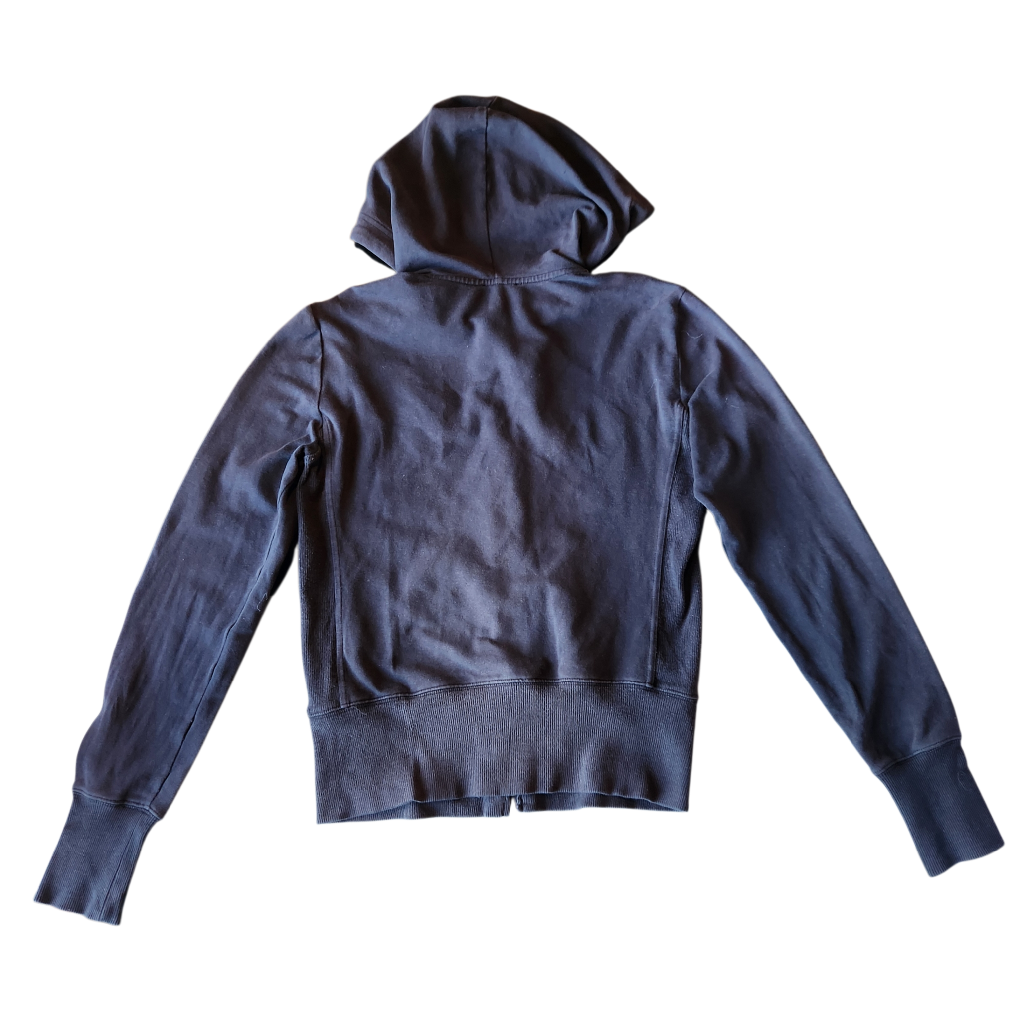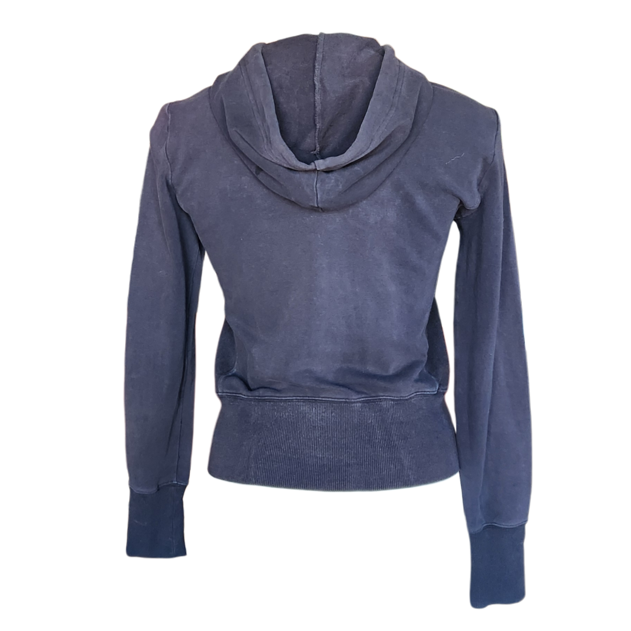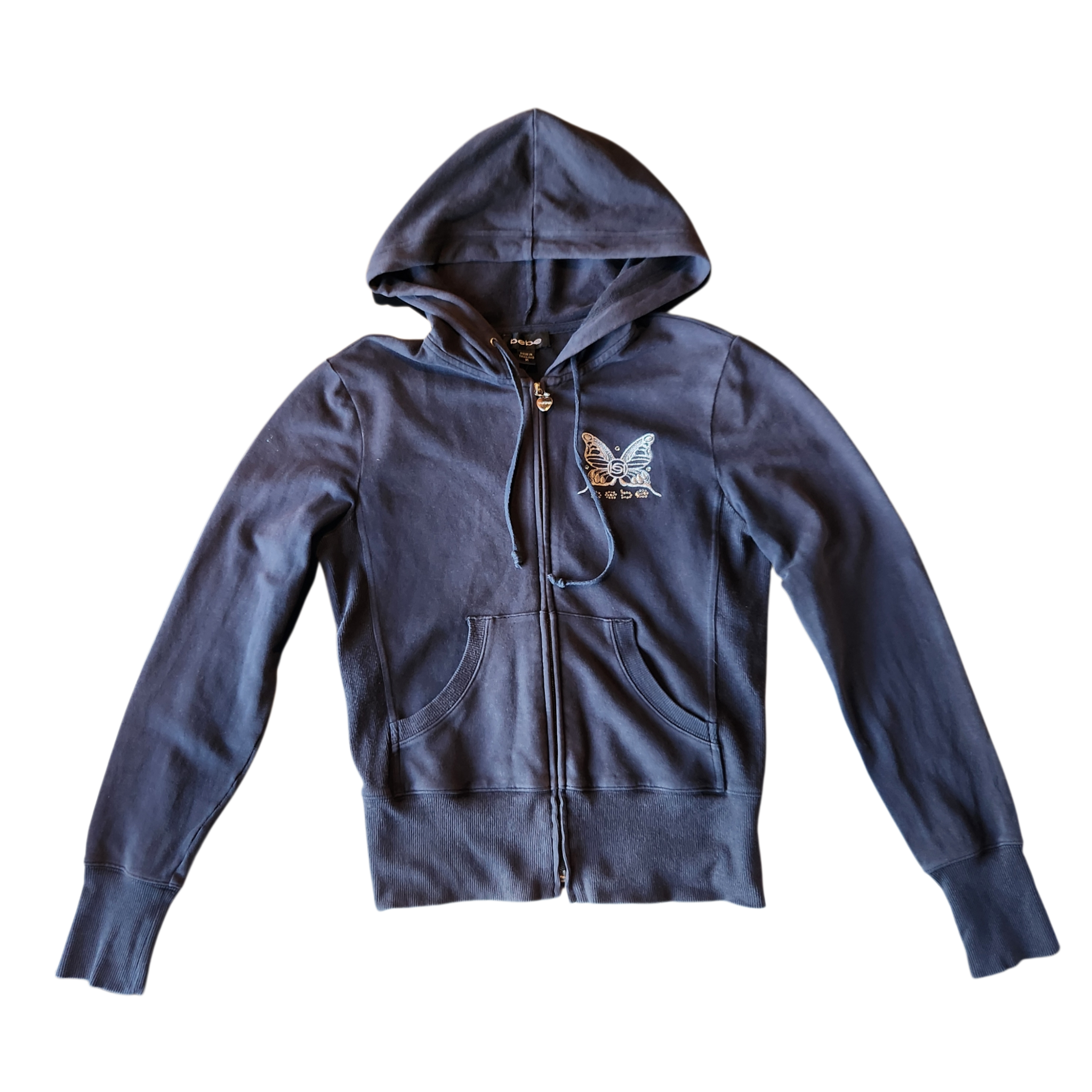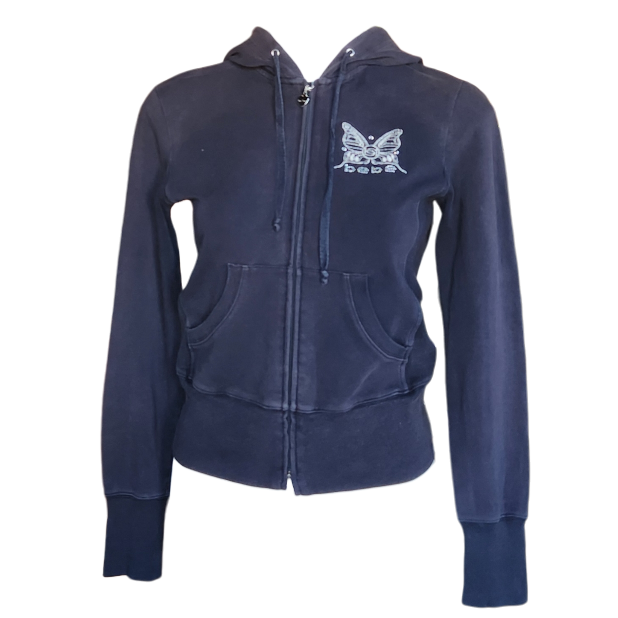 Black zip-up hoodie by Bebe, with a silver butterfly embroidery design and rhinestone details.