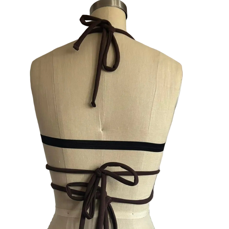 The Bella Top is inspired by the world of cowboys. The perfect chocolate brown top to wear to coachella or stagecoach. The top is a bold choice for when you want to make a statement. The adjustable tie back provides optimal comfort.