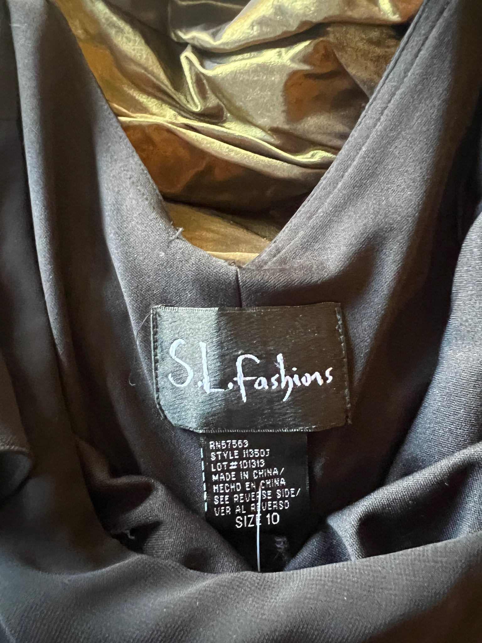 Black slip dress with white embroidered flowers at the hem. Cap sleeves and asymmetrical fringe hem. Fits loose.