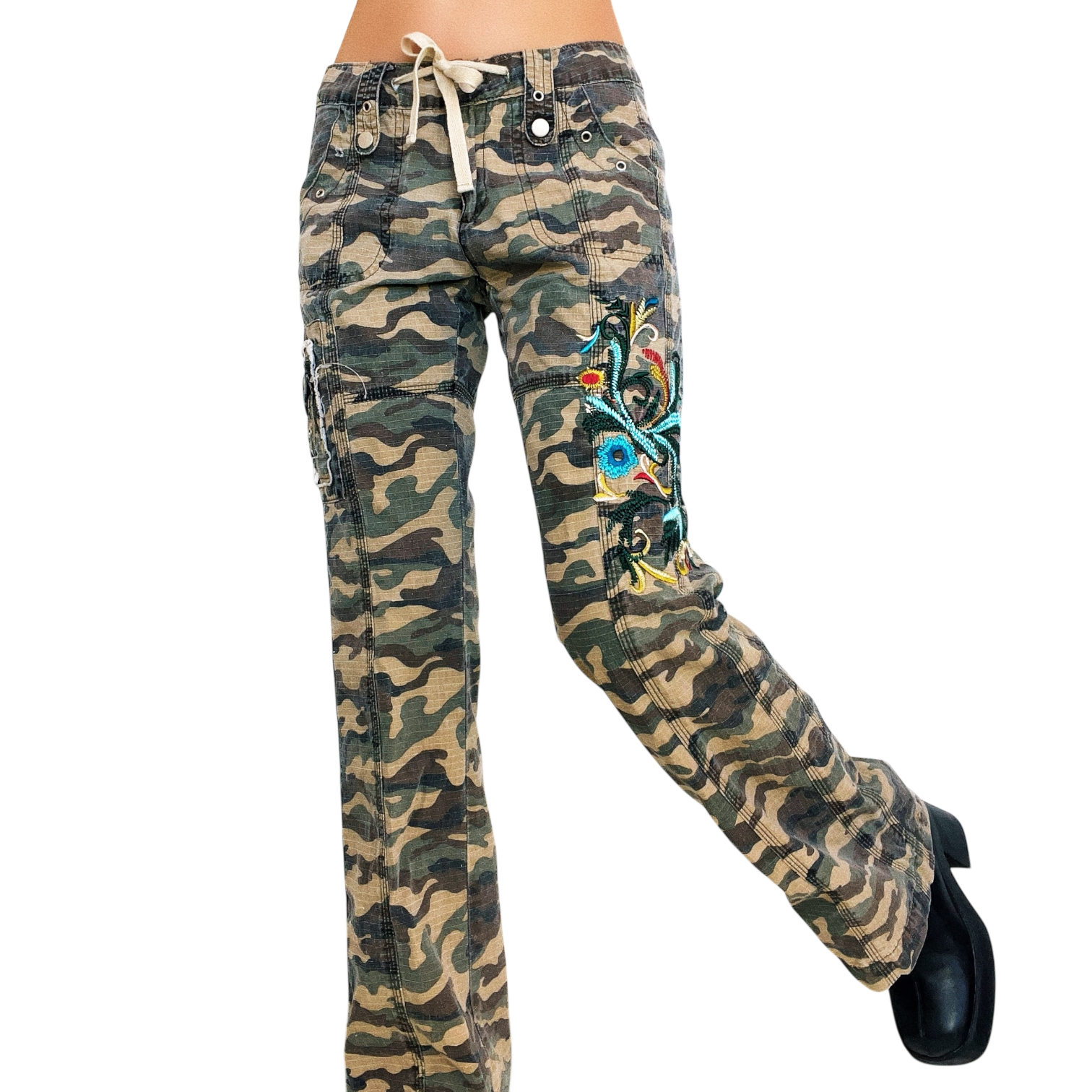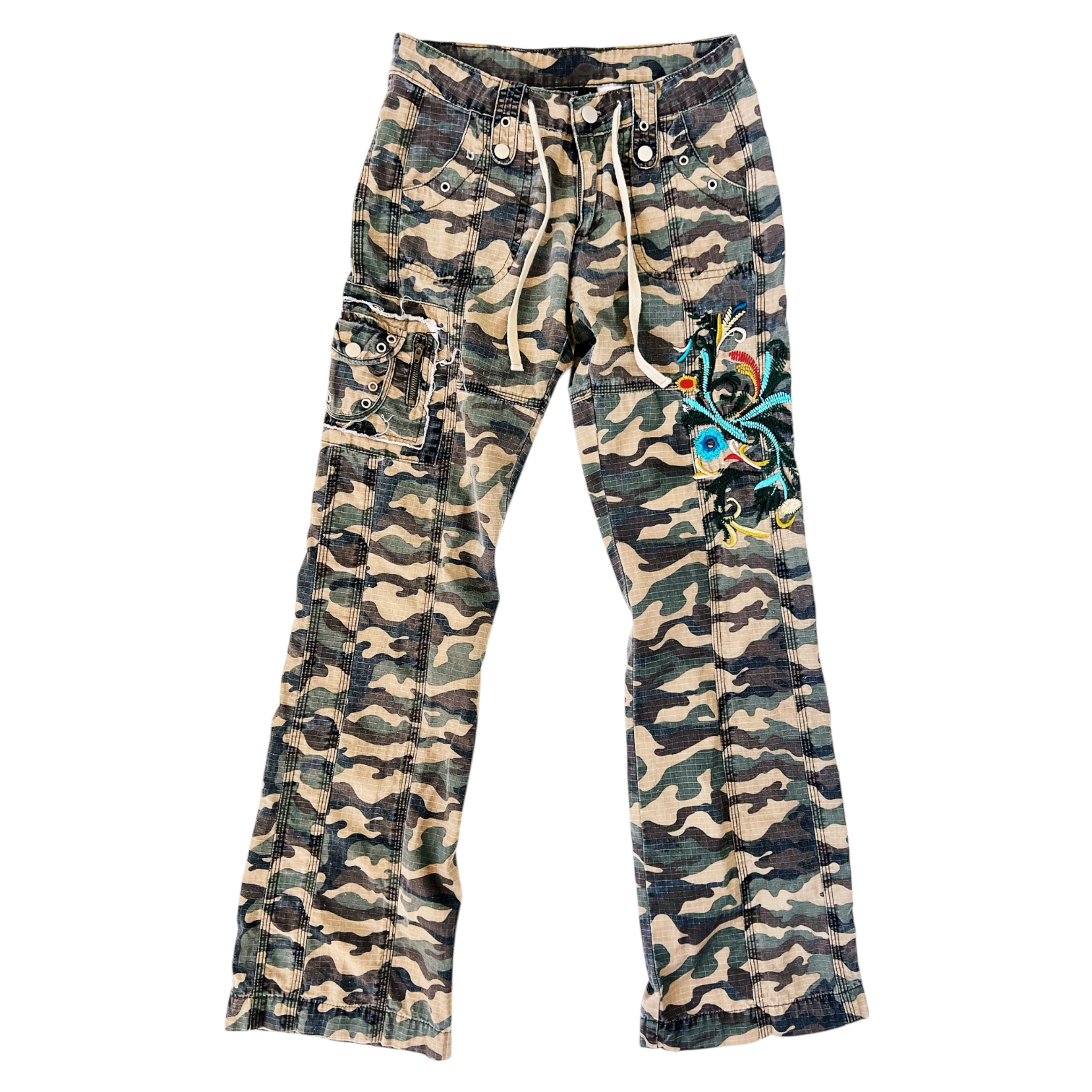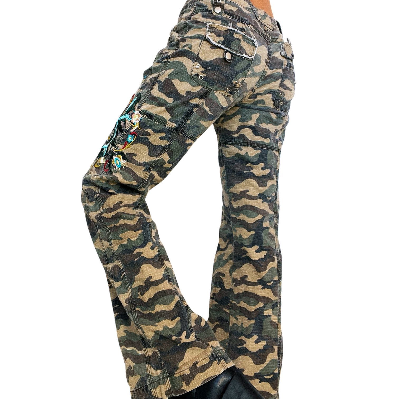 Camo cargo-style pants with distressed details and colorful floral embroidery!