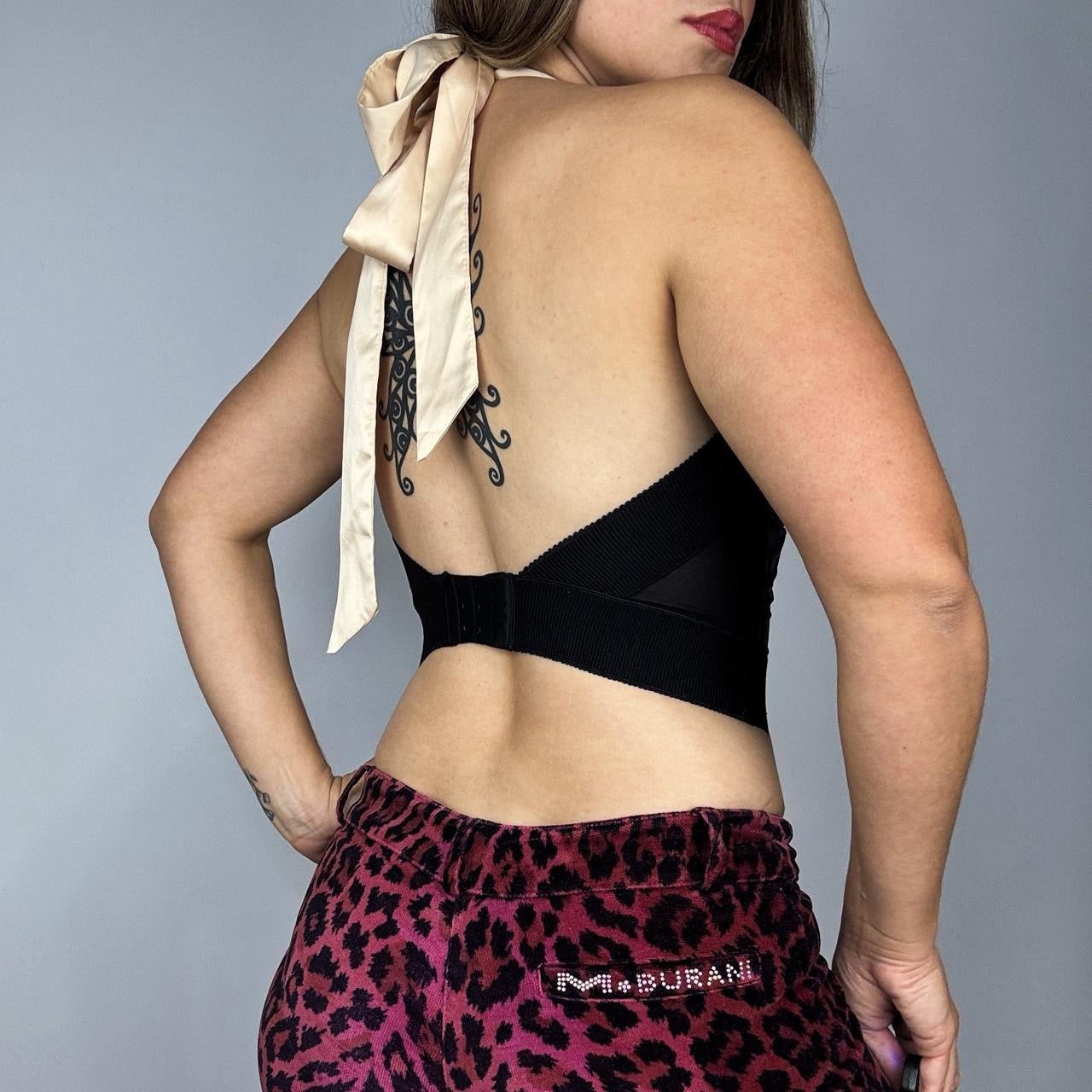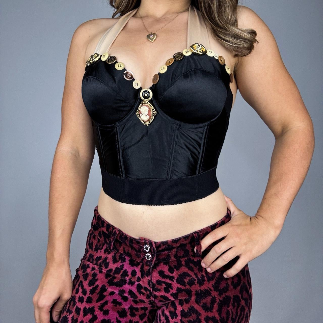 Vintage black satin bustier reworked in our studio with hand-sewn button detailing, nude satin straps, & a cameo locket brooch. No flaws!
