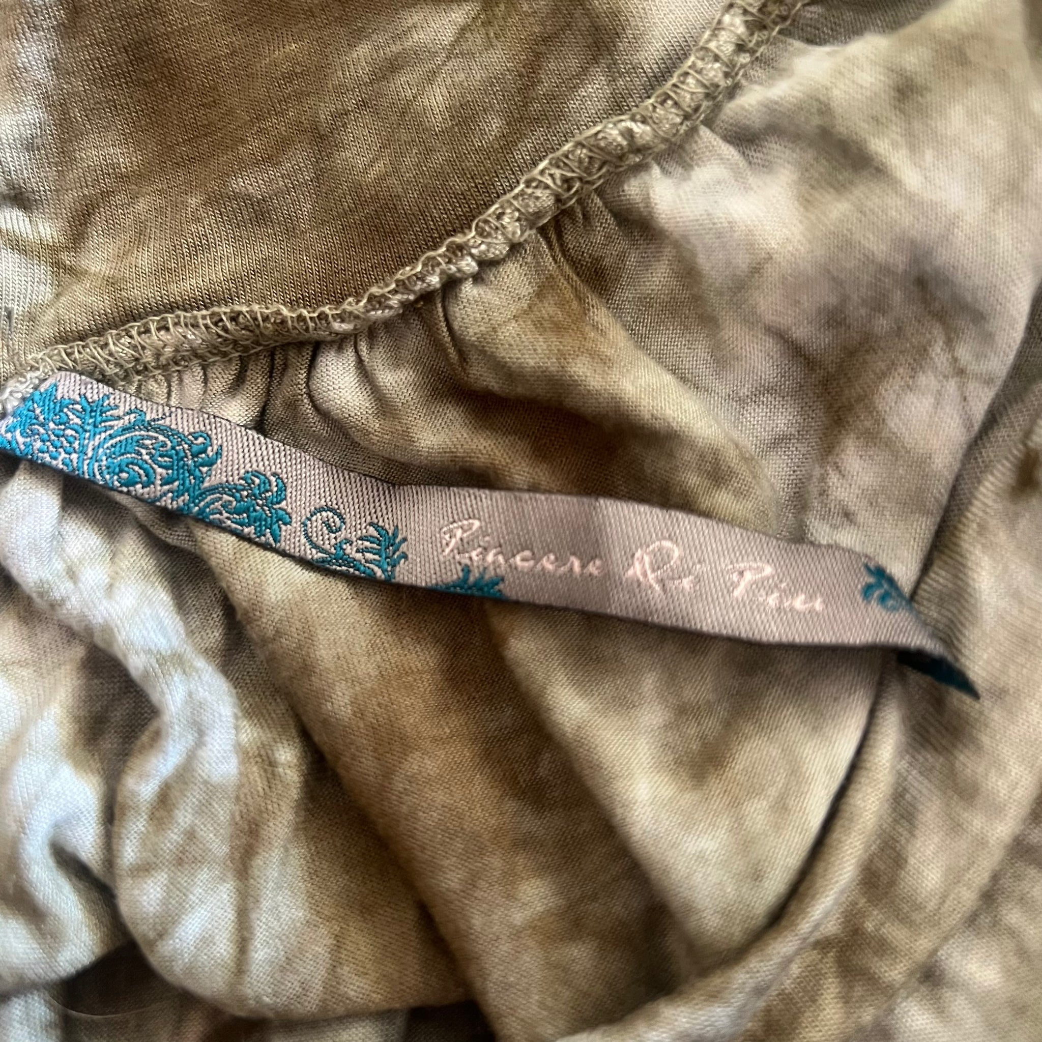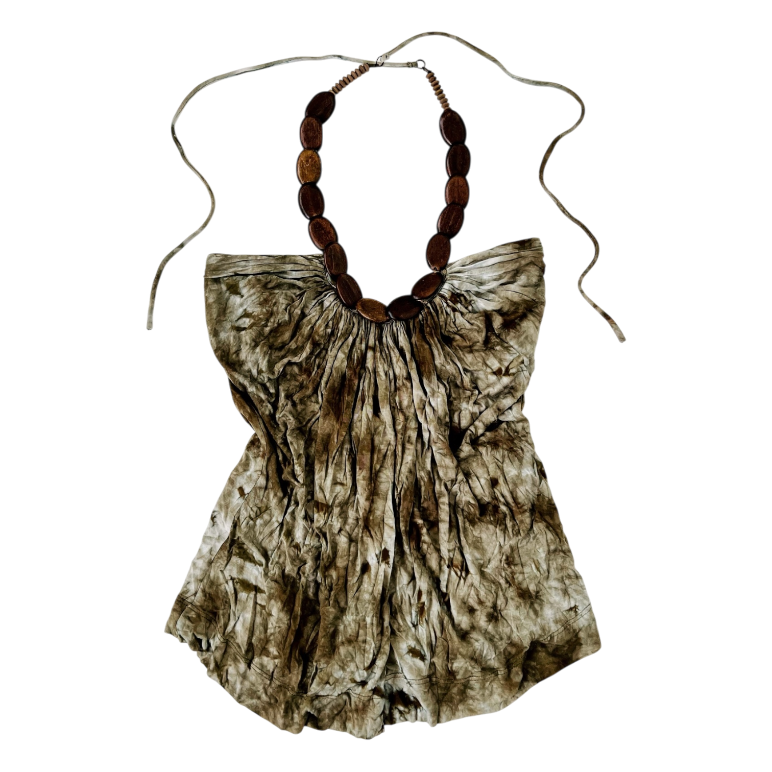 Early 2000s earthy green tie dye halter top with chunky wooden beaded details on the halter straps!