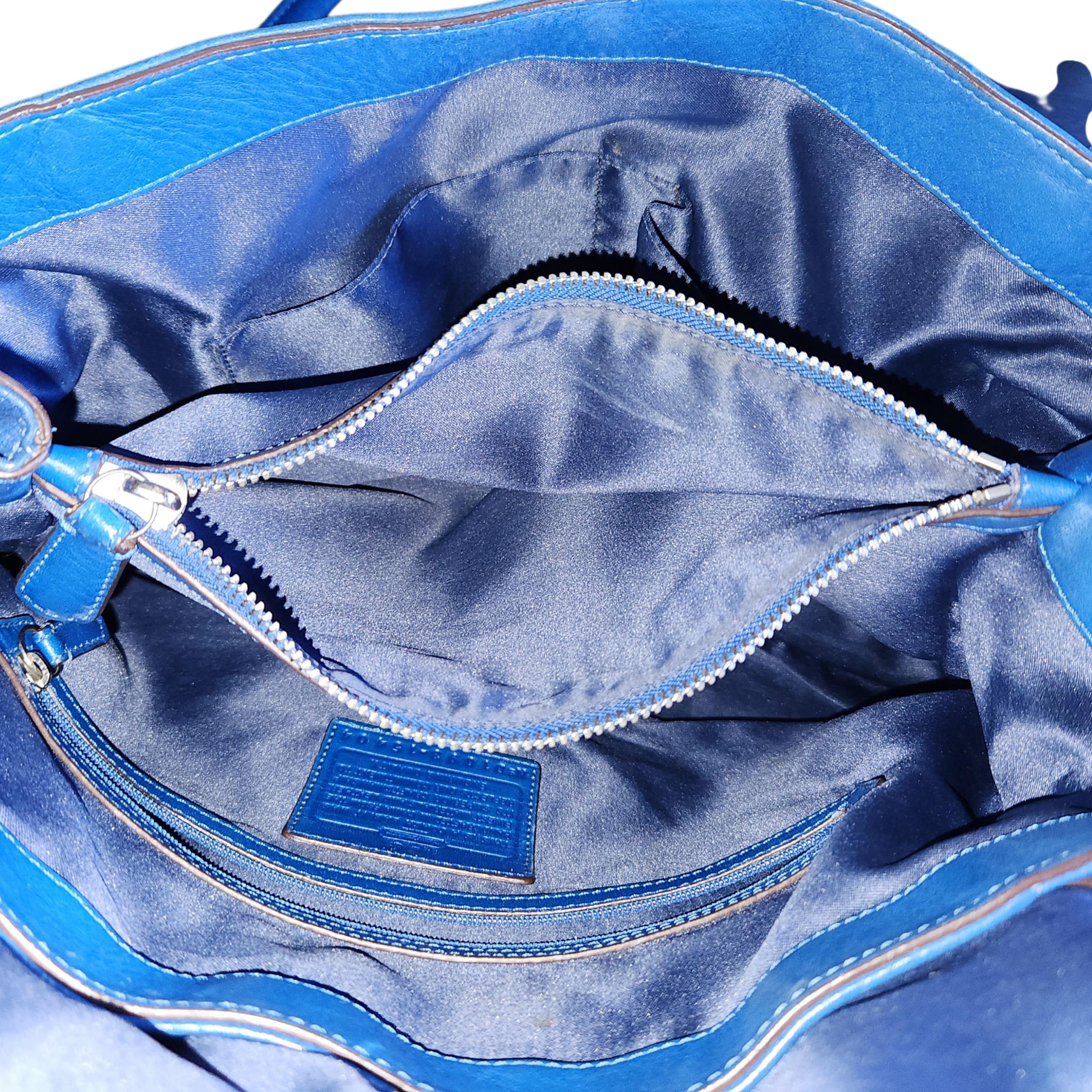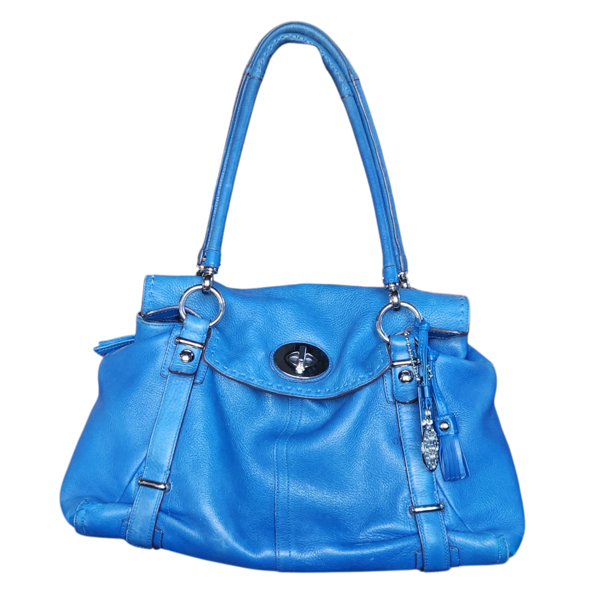 Cornflower blue slouch bag by Coach. Turn-lock closure with silver-tone hardware, outter zipper pocket, and multiple inner pockets.