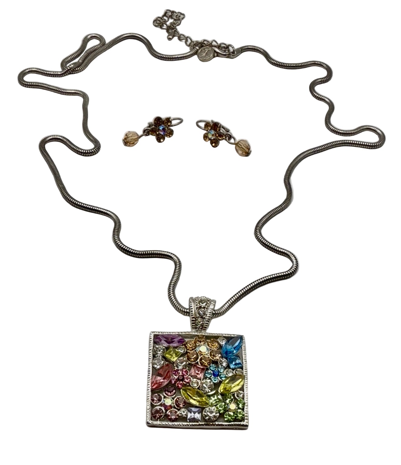 Add some sparkle to your look with this vibrant jewelry set! The silver-tone necklace features a square pendant packed with colorful crystals in rainbow shades — perfect for showing off your playful side. Comes with matching crystal drop earrings for a complete, stylish finish. Great for parties, casual outings, or brightening up your everyday outfits.