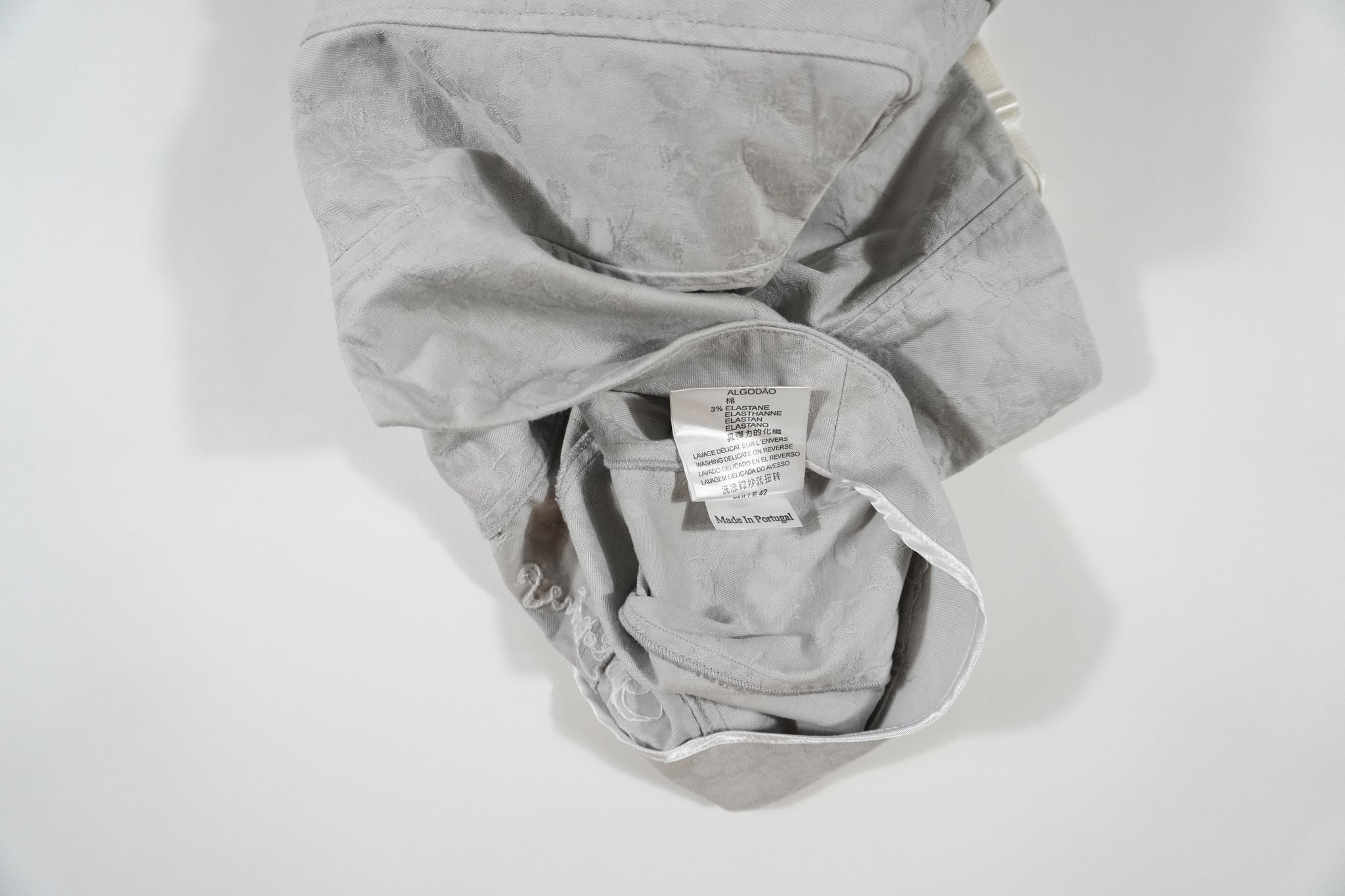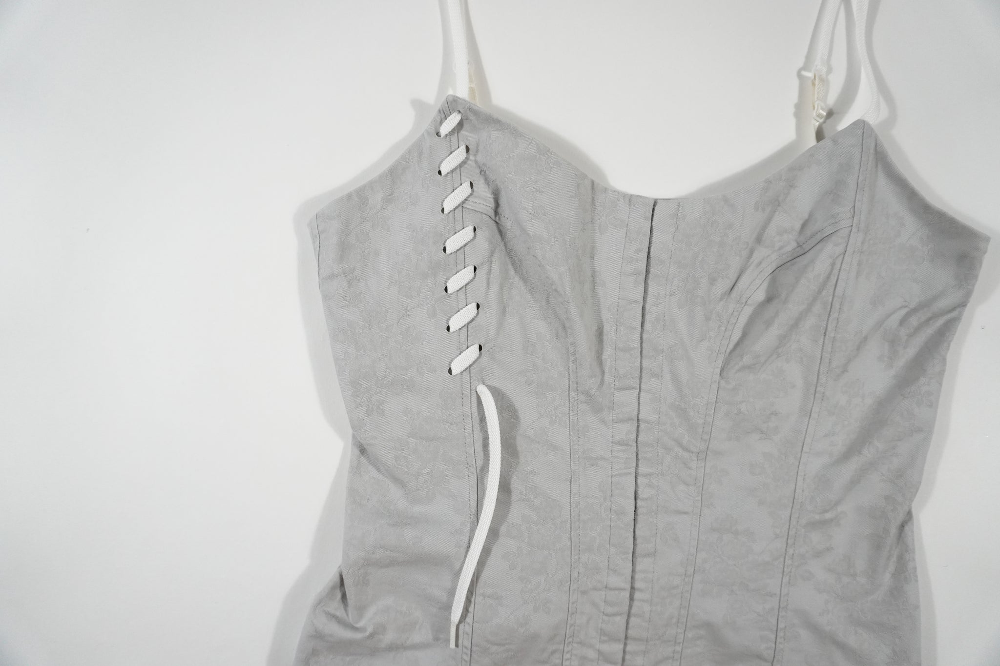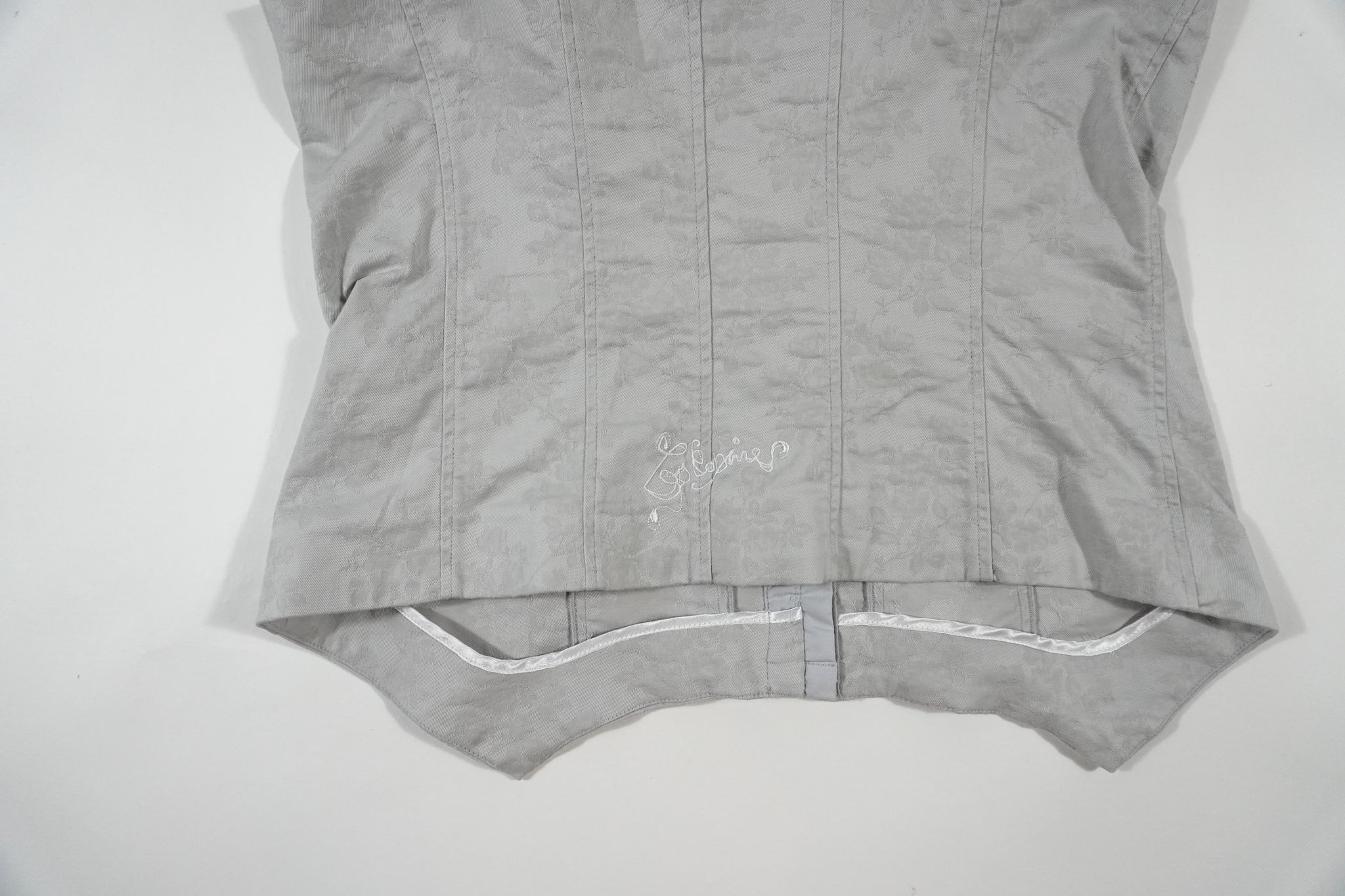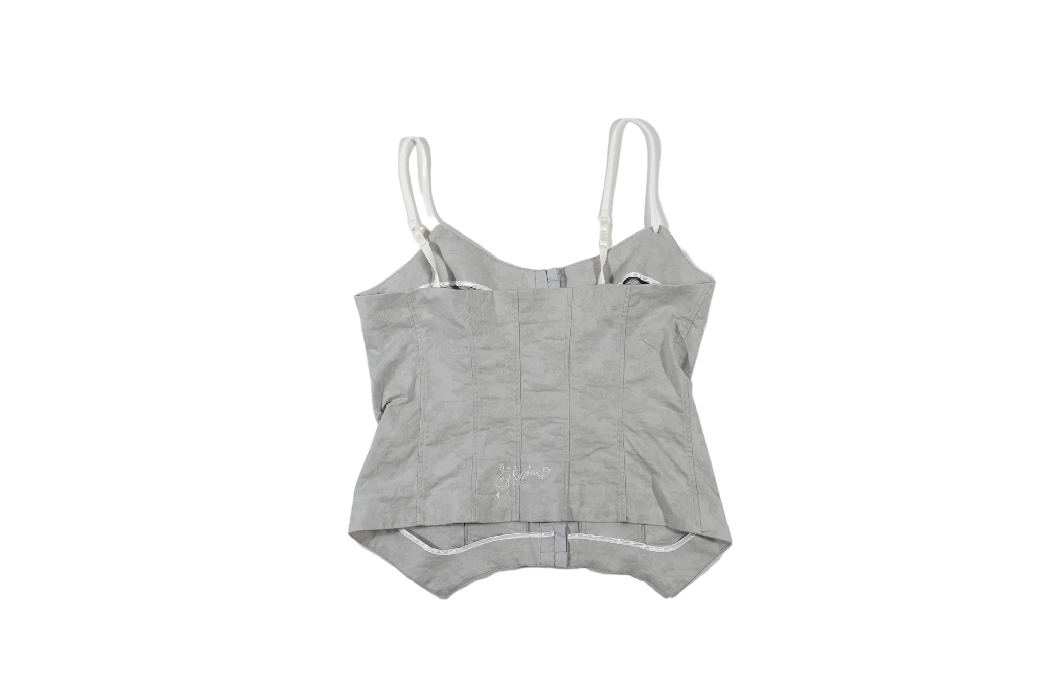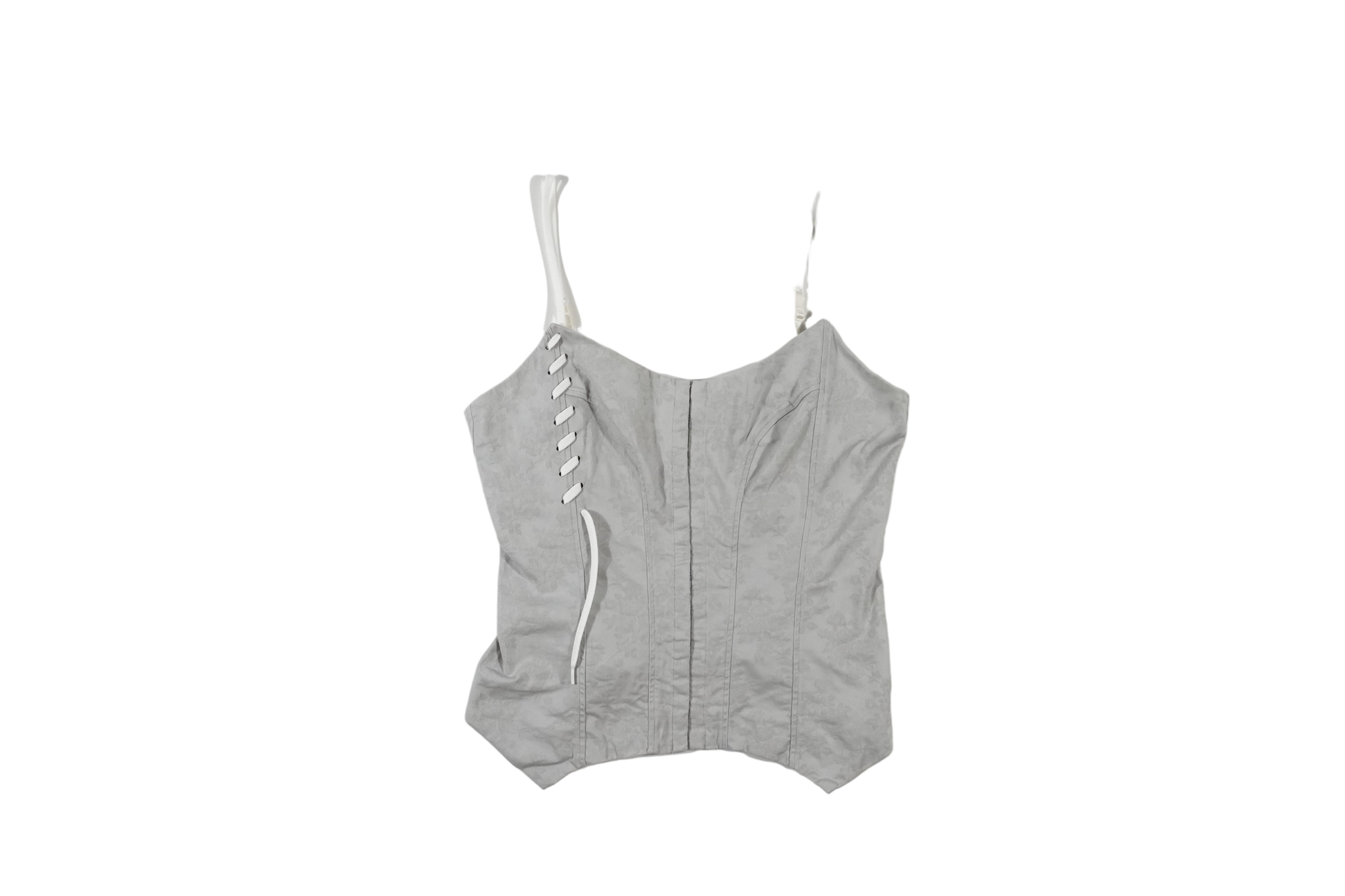Insane Cop Copine light gray corset style top with embroidery. Adjustable straps and front clasps. Doesn't have any boning.