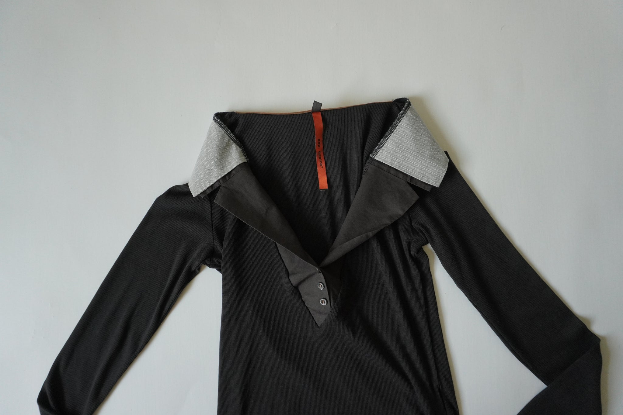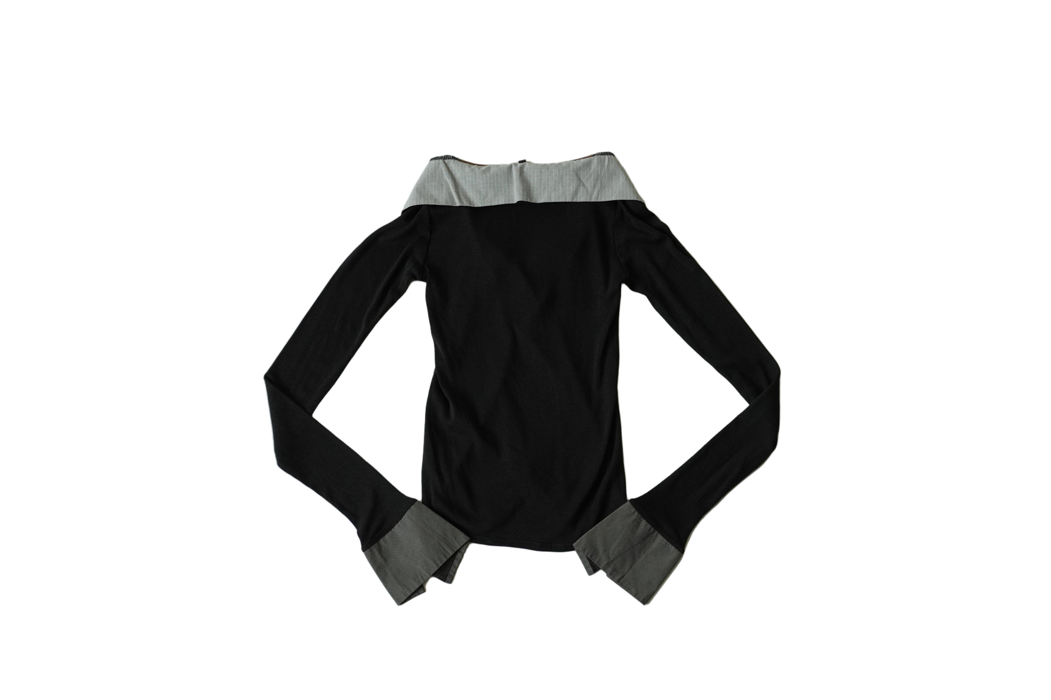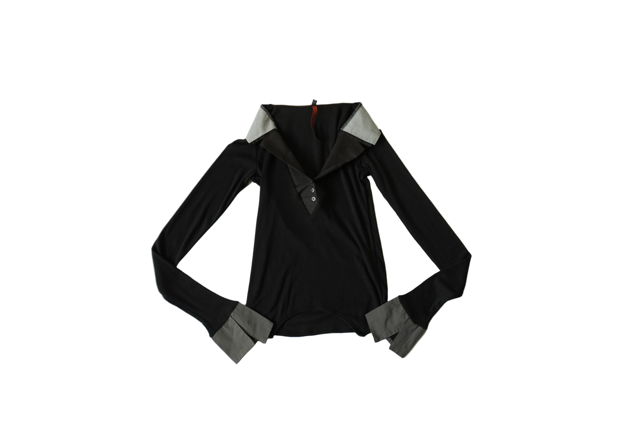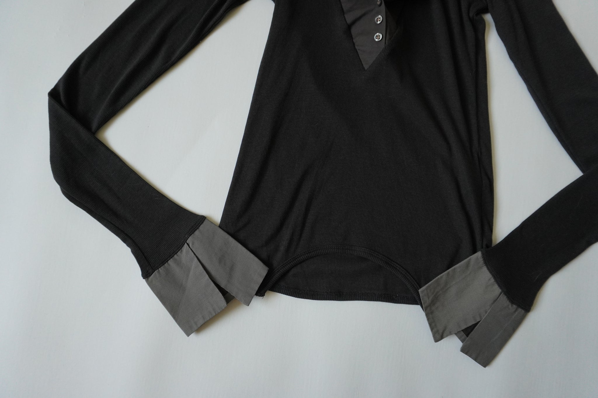 Cop Copine v-neck office core mixed media layered long sleeve top with cuffs and double neck. Comes with a replacement button.