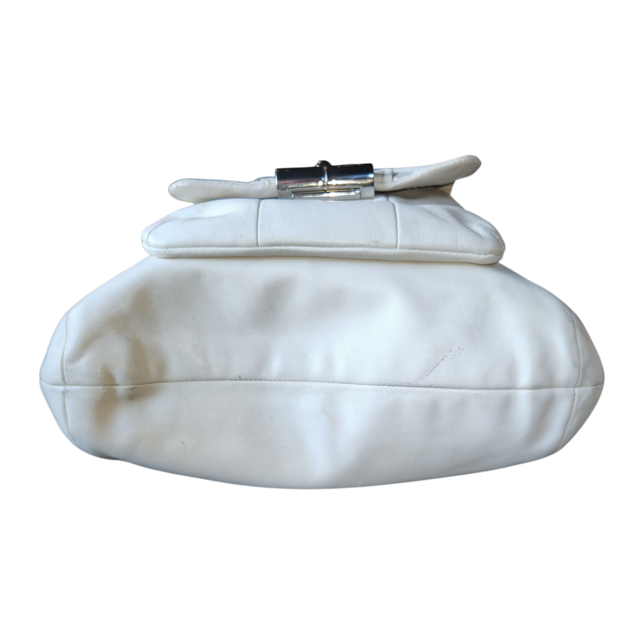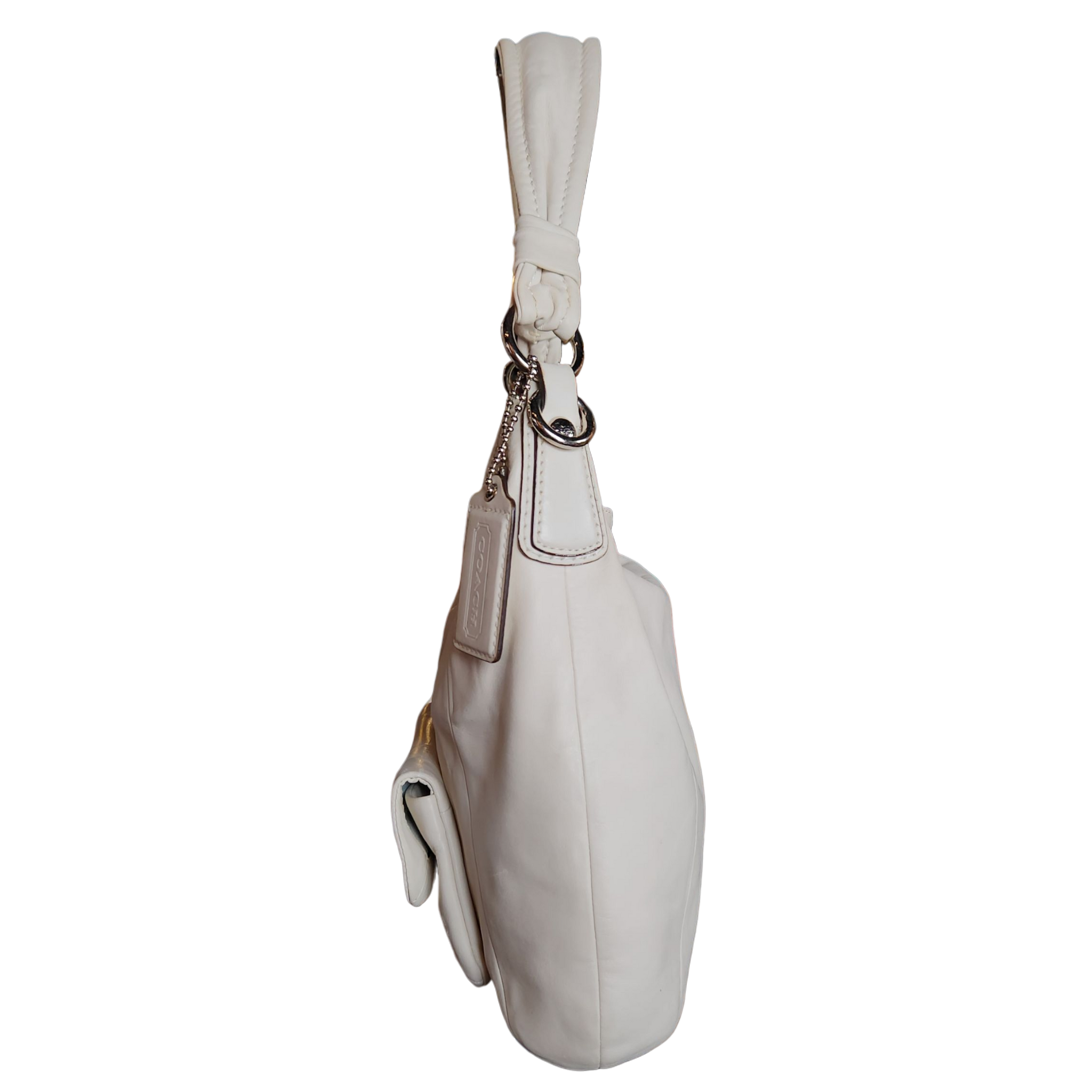 Cream leather shopper bag by coach. Includes one exterior pocket with a magnetic clip closure, silver hardware, and three interior pockets.